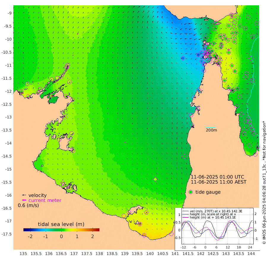 16cm/s 42T +3cm/s rms + 7cm/s -42T. ARA-GOC87 57m 13cm/s -26T +3cm/s rms + 2cm/s -2T. ARA-GOC87 60m 21cm/s 41T +2cm/s rms + 3cm/s 61T. ARA-GOC87 47m 31cm Daru 34cm Bobo Island -11cm Meer Island Barge 12cm Bramble Cay 25cm Unnamed Cay 23cm Pearce Cay 13cm Stephens Island 29cm Merrie England Shoals 41cm Mutacomal Reef 10cm Darnley Island Barge -10cm East Cay 20cm Yorke Island Barge 18cm Rennel Island 24cm Aureed Island 17cm Dungeness Reef 23cm Zagai Island 16cm Yam Island -14cm Dauan Island -2cm Saibai Island -6cm Phipi Reef 22cm Warrior Reef - West -31cm Mabuiag Island Barge 20cm Half Way Island 23cm Coconut Island 20cm Dugong Islet 20cm Poll Island 12cm Kirkcaldie Reef 2cm Suarji Island 18cm Sue Islet -128cm Hawkesbury Island -19cm Alert Patches -8cm Twin Island -102cm Badu Island -8cm St Pauls (Moa Island) -91cm Kubin (Moa Island) -38cm Ince Point -59cm Thursday Island -53cm Nardana Patches -87cm Turtle Head -112cm Round Island -130cm Goods Island -160cm Booby Island -139cm White Rocks Area -149cm Carpentaria -12cm Papou Point -185cm Bampfield Head -138cm Crab Island -141cm Red Wallis Island -105cm Packe Island 23cm Harrington Reef -155cm Herald Camp 9cm Sharp Point -75cm Red Island Point -57cm Possession Island 10cm Alpha Rock 7cm Frederick Point 32cm Wyborn Reef Light 30cm Tetley Island -7cm Triangle Reef 8cm Turtle Head Island -16cm Maclennan Cay -28cm Raine Island 16cm Mcsweeny Reef 13cm Collette Reef -9cm Shadwell Reef 19cm Hannibal Island 8cm Round Point -135cm Vrilya Point 0cm Cape Grenville -10cm Hicks Island -15cm Sir Charles Hardy Island -2cm Harvey Island -7cm Kay Reef -19cm Rocky Island -22cm Chapman Island -26cm Ham Reef -21cm Jubilee Reef -18cm Night Island -23cm Unnamed Reef No. 3 -20cm Morris Island -35cm 1st 3 Mile Opening -26cm Creech Reef -19cm Fife Island -22cm Eden Reef -22cm Stanley Island -13cm Normanby River 17cm Yabooma Island 31cm Hutchison River 29cm Elcho Island 34cm North West Crocodile Island 34cm Cape Wessel 48cm Stevens Island 49cm Guluwuru Island 34cm Hopeful Bay 25cm Auster Point 25cm Two Island Bay 50cm Cadell Strait 124cm Mallison Island 43cm Melville Bay (Gove Harbour) 38cm Truant Island 32cm Cape Arnhem 38cm Cape Grey 46cm Hawk Island 58cm Milner Bay (Groote Eylandt) 59cm Cape Beatrice 66cm West Island 60cm Centre Island 78cm Mornington Island 80cm West Wellesley Islands 96cm Bountiful Island 139cm Albert River Mouth 145cm Sweers Island 118cm Karumba 40cm Nassau River Offshore -11cm Christmas Creek -62cm Archer River -86cm Boyd Point -94cm Weipa (Humbug Point) -90cm Pennefather River -124cm Cullen Point