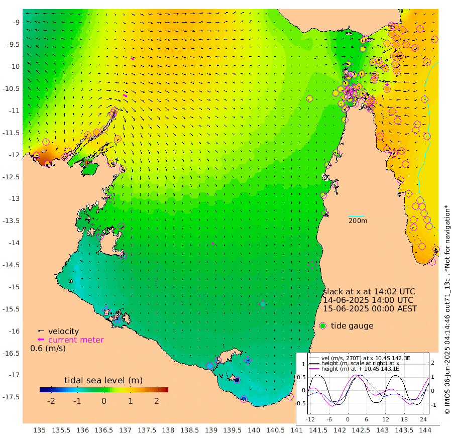 40cm/s 115T +3cm/s rms + 7cm/s -42T. ARA-GOC87 57m 23cm/s 161T +3cm/s rms + 2cm/s -2T. ARA-GOC87 60m 31cm/s 109T +2cm/s rms + 3cm/s 61T. ARA-GOC87 47m 128cm Daru 125cm Bobo Island 98cm Meer Island Barge 117cm Bramble Cay 133cm Unnamed Cay 129cm Pearce Cay 125cm Stephens Island 131cm Merrie England Shoals 132cm Mutacomal Reef 120cm Darnley Island Barge 100cm East Cay 122cm Yorke Island Barge 126cm Rennel Island 117cm Aureed Island 121cm Dungeness Reef 102cm Zagai Island 105cm Yam Island 87cm Dauan Island 74cm Saibai Island 80cm Phipi Reef 103cm Warrior Reef - West 72cm Mabuiag Island Barge 125cm Half Way Island 121cm Coconut Island 128cm Dugong Islet 113cm Poll Island 115cm Kirkcaldie Reef 95cm Suarji Island 107cm Sue Islet 101cm Hawkesbury Island 102cm Alert Patches 105cm Twin Island 94cm Badu Island 101cm St Pauls (Moa Island) 102cm Kubin (Moa Island) 94cm Ince Point 91cm Thursday Island 92cm Nardana Patches 95cm Turtle Head 92cm Round Island 95cm Goods Island 83cm Booby Island 86cm White Rocks Area 57cm Carpentaria 93cm Papou Point 106cm Bampfield Head 63cm Crab Island 81cm Red Wallis Island 97cm Packe Island 127cm Harrington Reef 92cm Herald Camp 17cm Sharp Point 71cm Red Island Point 89cm Possession Island 101cm Alpha Rock 114cm Frederick Point 135cm Wyborn Reef Light 131cm Tetley Island 92cm Triangle Reef 146cm Turtle Head Island 95cm Maclennan Cay 81cm Raine Island 121cm Mcsweeny Reef 114cm Collette Reef 95cm Shadwell Reef 125cm Hannibal Island 119cm Round Point 50cm Vrilya Point 106cm Cape Grenville 104cm Hicks Island 113cm Sir Charles Hardy Island 32cm Harvey Island 99cm Kay Reef 87cm Rocky Island 84cm Chapman Island 80cm Ham Reef 88cm Jubilee Reef 80cm Night Island 81cm Unnamed Reef No. 3 91cm Morris Island 92cm 1st 3 Mile Opening 89cm Creech Reef 83cm Fife Island 103cm Eden Reef 94cm Stanley Island 99cm Normanby River 95cm Yabooma Island 121cm Hutchison River 85cm Elcho Island 71cm North West Crocodile Island 92cm Cape Wessel 99cm Stevens Island 126cm Guluwuru Island 78cm Hopeful Bay 90cm Auster Point 94cm Two Island Bay 129cm Cadell Strait 199cm Mallison Island 97cm Melville Bay (Gove Harbour) 111cm Truant Island 68cm Cape Arnhem 19cm Cape Grey -6cm Hawk Island -62cm Milner Bay (Groote Eylandt) -70cm Cape Beatrice -126cm West Island -127cm Centre Island -119cm Mornington Island -113cm West Wellesley Islands -141cm Bountiful Island -172cm Albert River Mouth -205cm Sweers Island -177cm Karumba -72cm Nassau River Offshore -17cm Christmas Creek 16cm Archer River 38cm Boyd Point 37cm Weipa (Humbug Point) 32cm Pennefather River 45cm Cullen Point