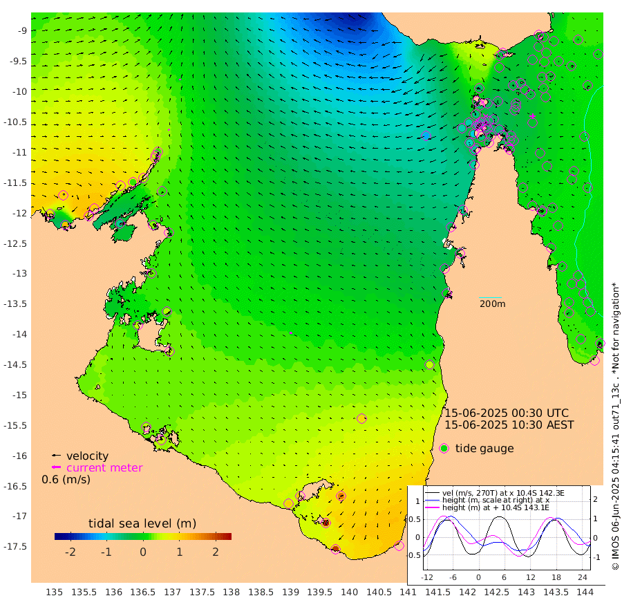 6cm/s -45T +3cm/s rms + 7cm/s -42T. ARA-GOC87 57m 19cm/s -74T +3cm/s rms + 2cm/s -2T. ARA-GOC87 60m 9cm/s 14T +2cm/s rms + 3cm/s 61T. ARA-GOC87 47m -12cm Daru -8cm Bobo Island 5cm Meer Island Barge 6cm Bramble Cay -5cm Unnamed Cay 3cm Pearce Cay -1cm Stephens Island -5cm Merrie England Shoals -15cm Mutacomal Reef -2cm Darnley Island Barge 5cm East Cay -9cm Yorke Island Barge -11cm Rennel Island -9cm Aureed Island -8cm Dungeness Reef -31cm Zagai Island -32cm Yam Island -30cm Dauan Island -46cm Saibai Island 7cm Phipi Reef -24cm Warrior Reef - West -55cm Mabuiag Island Barge -9cm Half Way Island -25cm Coconut Island -16cm Dugong Islet -27cm Poll Island -25cm Kirkcaldie Reef -35cm Suarji Island -36cm Sue Islet -65cm Hawkesbury Island -47cm Alert Patches -48cm Twin Island -59cm Badu Island -49cm St Pauls (Moa Island) -56cm Kubin (Moa Island) -54cm Ince Point -60cm Thursday Island -57cm Nardana Patches -55cm Turtle Head -57cm Round Island -62cm Goods Island -82cm Booby Island -77cm White Rocks Area -124cm Carpentaria -46cm Papou Point -102cm Bampfield Head -71cm Crab Island -85cm Red Wallis Island -62cm Packe Island -24cm Harrington Reef -68cm Herald Camp -14cm Sharp Point -46cm Red Island Point -44cm Possession Island -53cm Alpha Rock -39cm Frederick Point -27cm Wyborn Reef Light -33cm Tetley Island -6cm Triangle Reef -21cm Turtle Head Island -2cm Maclennan Cay 3cm Raine Island -10cm Mcsweeny Reef -6cm Collette Reef -1cm Shadwell Reef -1cm Hannibal Island 3cm Round Point -82cm Vrilya Point 0cm Cape Grenville 5cm Hicks Island -5cm Sir Charles Hardy Island 1cm Harvey Island 0cm Kay Reef 6cm Rocky Island 2cm Chapman Island -3cm Ham Reef 0cm Jubilee Reef 3cm Night Island -5cm Unnamed Reef No. 3 5cm Morris Island 3cm 1st 3 Mile Opening 2cm Creech Reef -1cm Fife Island 15cm Eden Reef 4cm Stanley Island 10cm Normanby River 96cm Yabooma Island 115cm Hutchison River 100cm Elcho Island 104cm North West Crocodile Island 16cm Cape Wessel 71cm Stevens Island 19cm Guluwuru Island 73cm Hopeful Bay 44cm Auster Point 49cm Two Island Bay 87cm Cadell Strait -74cm Mallison Island 30cm Melville Bay (Gove Harbour) 17cm Truant Island 13cm Cape Arnhem 29cm Cape Grey 44cm Hawk Island 46cm Milner Bay (Groote Eylandt) 52cm Cape Beatrice 49cm West Island 51cm Centre Island 113cm Mornington Island 103cm West Wellesley Islands 163cm Bountiful Island 207cm Albert River Mouth 222cm Sweers Island 208cm Karumba 95cm Nassau River Offshore 46cm Christmas Creek 0cm Archer River -36cm Boyd Point -20cm Weipa (Humbug Point) -43cm Pennefather River -68cm Cullen Point