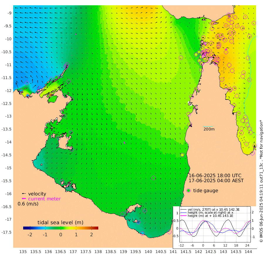 1cm/s -168T +3cm/s rms + 7cm/s -42T. ARA-GOC87 57m 35cm/s 164T +3cm/s rms + 2cm/s -2T. ARA-GOC87 60m 13cm/s -94T +2cm/s rms + 3cm/s 61T. ARA-GOC87 47m 113cm Daru 96cm Bobo Island 57cm Meer Island Barge 75cm Bramble Cay 99cm Unnamed Cay 85cm Pearce Cay 89cm Stephens Island 98cm Merrie England Shoals 114cm Mutacomal Reef 86cm Darnley Island Barge 62cm East Cay 96cm Yorke Island Barge 99cm Rennel Island 91cm Aureed Island 100cm Dungeness Reef 104cm Zagai Island 113cm Yam Island 110cm Dauan Island 108cm Saibai Island 92cm Phipi Reef 118cm Warrior Reef - West 84cm Mabuiag Island Barge 98cm Half Way Island 101cm Coconut Island 107cm Dugong Islet 103cm Poll Island 112cm Kirkcaldie Reef 92cm Suarji Island 109cm Sue Islet 68cm Hawkesbury Island 98cm Alert Patches 102cm Twin Island 65cm Badu Island 104cm St Pauls (Moa Island) 77cm Kubin (Moa Island) 91cm Ince Point 84cm Thursday Island 86cm Nardana Patches 76cm Turtle Head 63cm Round Island 57cm Goods Island 47cm Booby Island 43cm White Rocks Area 46cm Carpentaria 87cm Papou Point 51cm Bampfield Head 42cm Crab Island 56cm Red Wallis Island 78cm Packe Island 107cm Harrington Reef 75cm Herald Camp 34cm Sharp Point 63cm Red Island Point 71cm Possession Island 106cm Alpha Rock 106cm Frederick Point 112cm Wyborn Reef Light 114cm Tetley Island 61cm Triangle Reef 101cm Turtle Head Island 61cm Maclennan Cay 42cm Raine Island 93cm Mcsweeny Reef 86cm Collette Reef 63cm Shadwell Reef 89cm Hannibal Island 76cm Round Point 42cm Vrilya Point 72cm Cape Grenville 65cm Hicks Island 79cm Sir Charles Hardy Island 23cm Harvey Island 63cm Kay Reef 51cm Rocky Island 46cm Chapman Island 48cm Ham Reef 52cm Jubilee Reef 49cm Night Island 49cm Unnamed Reef No. 3 50cm Morris Island 45cm 1st 3 Mile Opening 51cm Creech Reef 59cm Fife Island 47cm Eden Reef 54cm Stanley Island 53cm Normanby River -115cm Yabooma Island -133cm Hutchison River -129cm Elcho Island -126cm North West Crocodile Island -46cm Cape Wessel -89cm Stevens Island -5cm Guluwuru Island -90cm Hopeful Bay -71cm Auster Point -64cm Two Island Bay -72cm Cadell Strait 171cm Mallison Island -21cm Melville Bay (Gove Harbour) -17cm Truant Island -8cm Cape Arnhem -26cm Cape Grey -33cm Hawk Island -55cm Milner Bay (Groote Eylandt) -47cm Cape Beatrice -49cm West Island -57cm Centre Island -35cm Mornington Island -30cm West Wellesley Islands -58cm Bountiful Island -106cm Albert River Mouth -135cm Sweers Island -94cm Karumba 9cm Nassau River Offshore 46cm Christmas Creek 38cm Archer River 50cm Boyd Point 42cm Weipa (Humbug Point) 33cm Pennefather River 47cm Cullen Point