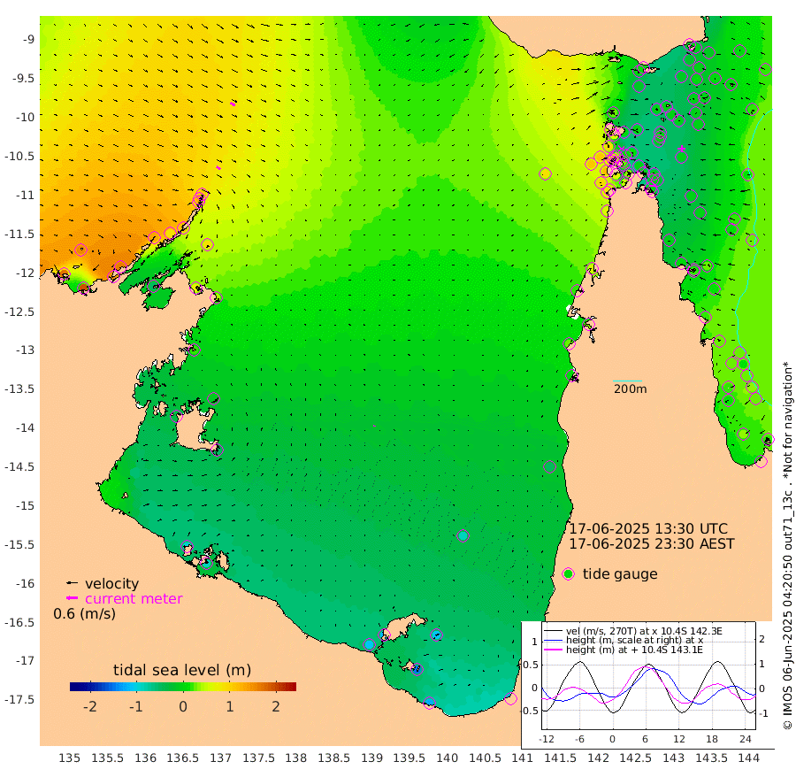 25cm/s 126T +3cm/s rms + 7cm/s -42T. ARA-GOC87 57m 5cm/s 26T +3cm/s rms + 2cm/s -2T. ARA-GOC87 60m 28cm/s 120T +2cm/s rms + 3cm/s 61T. ARA-GOC87 47m -18cm Daru -7cm Bobo Island 17cm Meer Island Barge 7cm Bramble Cay -7cm Unnamed Cay 7cm Pearce Cay 2cm Stephens Island -14cm Merrie England Shoals -20cm Mutacomal Reef 1cm Darnley Island Barge 17cm East Cay -5cm Yorke Island Barge -3cm Rennel Island -3cm Aureed Island -4cm Dungeness Reef -7cm Zagai Island -3cm Yam Island 8cm Dauan Island 2cm Saibai Island -8cm Phipi Reef -13cm Warrior Reef - West 23cm Mabuiag Island Barge -4cm Half Way Island -7cm Coconut Island -4cm Dugong Islet -4cm Poll Island -9cm Kirkcaldie Reef 4cm Suarji Island -11cm Sue Islet 95cm Hawkesbury Island 7cm Alert Patches 8cm Twin Island 80cm Badu Island 6cm St Pauls (Moa Island) 67cm Kubin (Moa Island) 24cm Ince Point 38cm Thursday Island 34cm Nardana Patches 57cm Turtle Head 70cm Round Island 94cm Goods Island 106cm Booby Island 107cm White Rocks Area 83cm Carpentaria 18cm Papou Point 118cm Bampfield Head 79cm Crab Island 95cm Red Wallis Island 67cm Packe Island -9cm Harrington Reef 88cm Herald Camp -15cm Sharp Point 52cm Red Island Point 31cm Possession Island -5cm Alpha Rock -2cm Frederick Point -12cm Wyborn Reef Light -11cm Tetley Island 15cm Triangle Reef 6cm Turtle Head Island 21cm Maclennan Cay 26cm Raine Island -5cm Mcsweeny Reef -6cm Collette Reef 8cm Shadwell Reef -6cm Hannibal Island 7cm Round Point 63cm Vrilya Point 4cm Cape Grenville 16cm Hicks Island 24cm Sir Charles Hardy Island 2cm Harvey Island 12cm Kay Reef 21cm Rocky Island 27cm Chapman Island 25cm Ham Reef 23cm Jubilee Reef 13cm Night Island 23cm Unnamed Reef No. 3 22cm Morris Island 30cm 1st 3 Mile Opening 23cm Creech Reef 10cm Fife Island 32cm Eden Reef 19cm Stanley Island 24cm Normanby River 172cm Yabooma Island 193cm Hutchison River 161cm Elcho Island 154cm North West Crocodile Island 110cm Cape Wessel 132cm Stevens Island 84cm Guluwuru Island 119cm Hopeful Bay 120cm Auster Point 120cm Two Island Bay 145cm Cadell Strait -45cm Mallison Island 73cm Melville Bay (Gove Harbour) 84cm Truant Island 42cm Cape Arnhem 15cm Cape Grey -11cm Hawk Island -37cm Milner Bay (Groote Eylandt) -49cm Cape Beatrice -91cm West Island -90cm Centre Island -115cm Mornington Island -108cm West Wellesley Islands -107cm Bountiful Island -124cm Albert River Mouth -145cm Sweers Island -133cm Karumba -87cm Nassau River Offshore -48cm Christmas Creek 4cm Archer River 28cm Boyd Point 37cm Weipa (Humbug Point) 21cm Pennefather River 55cm Cullen Point