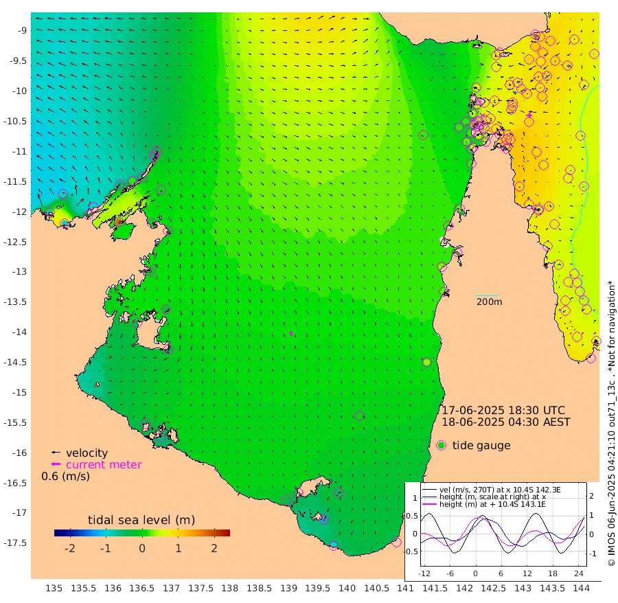 4cm/s 95T +3cm/s rms + 7cm/s -42T. ARA-GOC87 57m 31cm/s 163T +3cm/s rms + 2cm/s -2T. ARA-GOC87 60m 7cm/s -85T +2cm/s rms + 3cm/s 61T. ARA-GOC87 47m 109cm Daru 96cm Bobo Island 64cm Meer Island Barge 81cm Bramble Cay 100cm Unnamed Cay 86cm Pearce Cay 93cm Stephens Island 100cm Merrie England Shoals 110cm Mutacomal Reef 90cm Darnley Island Barge 70cm East Cay 96cm Yorke Island Barge 97cm Rennel Island 88cm Aureed Island 92cm Dungeness Reef 87cm Zagai Island 97cm Yam Island 81cm Dauan Island 82cm Saibai Island 67cm Phipi Reef 99cm Warrior Reef - West 58cm Mabuiag Island Barge 98cm Half Way Island 92cm Coconut Island 103cm Dugong Islet 90cm Poll Island 102cm Kirkcaldie Reef 70cm Suarji Island 96cm Sue Islet 43cm Hawkesbury Island 75cm Alert Patches 81cm Twin Island 38cm Badu Island 81cm St Pauls (Moa Island) 54cm Kubin (Moa Island) 68cm Ince Point 59cm Thursday Island 61cm Nardana Patches 50cm Turtle Head 37cm Round Island 31cm Goods Island 20cm Booby Island 18cm White Rocks Area 22cm Carpentaria 70cm Papou Point 19cm Bampfield Head 20cm Crab Island 29cm Red Wallis Island 51cm Packe Island 102cm Harrington Reef 47cm Herald Camp 26cm Sharp Point 45cm Red Island Point 49cm Possession Island 87cm Alpha Rock 92cm Frederick Point 104cm Wyborn Reef Light 104cm Tetley Island 61cm Triangle Reef 98cm Turtle Head Island 65cm Maclennan Cay 48cm Raine Island 93cm Mcsweeny Reef 87cm Collette Reef 66cm Shadwell Reef 92cm Hannibal Island 81cm Round Point 21cm Vrilya Point 77cm Cape Grenville 72cm Hicks Island 83cm Sir Charles Hardy Island 25cm Harvey Island 70cm Kay Reef 57cm Rocky Island 50cm Chapman Island 54cm Ham Reef 58cm Jubilee Reef 53cm Night Island 54cm Unnamed Reef No. 3 58cm Morris Island 51cm 1st 3 Mile Opening 57cm Creech Reef 65cm Fife Island 57cm Eden Reef 62cm Stanley Island 65cm Normanby River -82cm Yabooma Island -94cm Hutchison River -95cm Elcho Island -92cm North West Crocodile Island -24cm Cape Wessel -60cm Stevens Island 17cm Guluwuru Island -65cm Hopeful Bay -47cm Auster Point -37cm Two Island Bay -35cm Cadell Strait 179cm Mallison Island -3cm Melville Bay (Gove Harbour) 2cm Truant Island 3cm Cape Arnhem -15cm Cape Grey -27cm Hawk Island -49cm Milner Bay (Groote Eylandt) -41cm Cape Beatrice -46cm West Island -56cm Centre Island -34cm Mornington Island -29cm West Wellesley Islands -51cm Bountiful Island -93cm Albert River Mouth -122cm Sweers Island -84cm Karumba 6cm Nassau River Offshore 36cm Christmas Creek 25cm Archer River 34cm Boyd Point 26cm Weipa (Humbug Point) 18cm Pennefather River 26cm Cullen Point