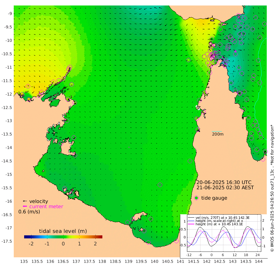 3cm/s -133T +3cm/s rms + 7cm/s -42T. ARA-GOC87 57m 5cm/s -117T +3cm/s rms + 2cm/s -2T. ARA-GOC87 60m 2cm/s 132T +2cm/s rms + 3cm/s 61T. ARA-GOC87 47m -51cm Daru -47cm Bobo Island -8cm Meer Island Barge -28cm Bramble Cay -46cm Unnamed Cay -40cm Pearce Cay -38cm Stephens Island -57cm Merrie England Shoals -60cm Mutacomal Reef -32cm Darnley Island Barge -8cm East Cay -39cm Yorke Island Barge -42cm Rennel Island -40cm Aureed Island -39cm Dungeness Reef -27cm Zagai Island -24cm Yam Island 26cm Dauan Island 20cm Saibai Island 6cm Phipi Reef -18cm Warrior Reef - West 14cm Mabuiag Island Barge -50cm Half Way Island -50cm Coconut Island -48cm Dugong Islet -40cm Poll Island -46cm Kirkcaldie Reef -23cm Suarji Island -37cm Sue Islet 55cm Hawkesbury Island -28cm Alert Patches -30cm Twin Island 45cm Badu Island -25cm St Pauls (Moa Island) 31cm Kubin (Moa Island) -8cm Ince Point 2cm Thursday Island 1cm Nardana Patches 25cm Turtle Head 41cm Round Island 51cm Goods Island 58cm Booby Island 54cm White Rocks Area 30cm Carpentaria -18cm Papou Point 71cm Bampfield Head 40cm Crab Island 49cm Red Wallis Island 31cm Packe Island -60cm Harrington Reef 69cm Herald Camp -17cm Sharp Point 21cm Red Island Point -1cm Possession Island -36cm Alpha Rock -42cm Frederick Point -55cm Wyborn Reef Light -53cm Tetley Island -8cm Triangle Reef -55cm Turtle Head Island -5cm Maclennan Cay 7cm Raine Island -41cm Mcsweeny Reef -36cm Collette Reef -12cm Shadwell Reef -43cm Hannibal Island -29cm Round Point 20cm Vrilya Point -26cm Cape Grenville -11cm Hicks Island 3cm Sir Charles Hardy Island -7cm Harvey Island -15cm Kay Reef 3cm Rocky Island 12cm Chapman Island 10cm Ham Reef 3cm Jubilee Reef -6cm Night Island 5cm Unnamed Reef No. 3 -1cm Morris Island 7cm 1st 3 Mile Opening 1cm Creech Reef 0cm Fife Island 4cm Eden Reef -4cm Stanley Island -4cm Normanby River 112cm Yabooma Island 112cm Hutchison River 95cm Elcho Island 92cm North West Crocodile Island 60cm Cape Wessel 72cm Stevens Island 40cm Guluwuru Island 76cm Hopeful Bay 67cm Auster Point 68cm Two Island Bay 84cm Cadell Strait -26cm Mallison Island 41cm Melville Bay (Gove Harbour) 44cm Truant Island 23cm Cape Arnhem 11cm Cape Grey -2cm Hawk Island -18cm Milner Bay (Groote Eylandt) -23cm Cape Beatrice -45cm West Island -48cm Centre Island -32cm Mornington Island -27cm West Wellesley Islands 4cm Bountiful Island -14cm Albert River Mouth -22cm Sweers Island -13cm Karumba -11cm Nassau River Offshore 6cm Christmas Creek 19cm Archer River 27cm Boyd Point 43cm Weipa (Humbug Point) -3cm Pennefather River 35cm Cullen Point