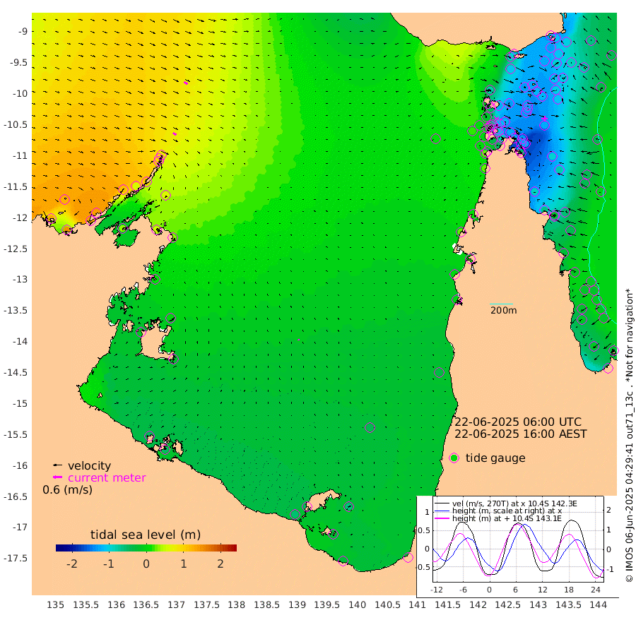 25cm/s 122T +3cm/s rms + 7cm/s -42T. ARA-GOC87 57m 6cm/s -14T +3cm/s rms + 2cm/s -2T. ARA-GOC87 60m 26cm/s 116T +2cm/s rms + 3cm/s 61T. ARA-GOC87 47m -121cm Daru -110cm Bobo Island -35cm Meer Island Barge -65cm Bramble Cay -107cm Unnamed Cay -92cm Pearce Cay -87cm Stephens Island -103cm Merrie England Shoals -131cm Mutacomal Reef -78cm Darnley Island Barge -42cm East Cay -100cm Yorke Island Barge -107cm Rennel Island -104cm Aureed Island -118cm Dungeness Reef -123cm Zagai Island -133cm Yam Island -91cm Dauan Island -98cm Saibai Island -109cm Phipi Reef -127cm Warrior Reef - West -80cm Mabuiag Island Barge -107cm Half Way Island -119cm Coconut Island -122cm Dugong Islet -124cm Poll Island -130cm Kirkcaldie Reef -135cm Suarji Island -126cm Sue Islet -20cm Hawkesbury Island -115cm Alert Patches -120cm Twin Island -20cm Badu Island -123cm St Pauls (Moa Island) -47cm Kubin (Moa Island) -92cm Ince Point -75cm Thursday Island -80cm Nardana Patches -49cm Turtle Head -45cm Round Island -6cm Goods Island 17cm Booby Island 4cm White Rocks Area 12cm Carpentaria -105cm Papou Point -6cm Bampfield Head 23cm Crab Island 7cm Red Wallis Island -33cm Packe Island -133cm Harrington Reef -34cm Herald Camp -46cm Sharp Point -46cm Red Island Point -88cm Possession Island -122cm Alpha Rock -124cm Frederick Point -126cm Wyborn Reef Light -129cm Tetley Island -42cm Triangle Reef -113cm Turtle Head Island -42cm Maclennan Cay -7cm Raine Island -91cm Mcsweeny Reef -81cm Collette Reef -40cm Shadwell Reef -86cm Hannibal Island -63cm Round Point 29cm Vrilya Point -63cm Cape Grenville -49cm Hicks Island -54cm Sir Charles Hardy Island -19cm Harvey Island -43cm Kay Reef -24cm Rocky Island -12cm Chapman Island -13cm Ham Reef -19cm Jubilee Reef -22cm Night Island -13cm Unnamed Reef No. 3 -22cm Morris Island -13cm 1st 3 Mile Opening -19cm Creech Reef -13cm Fife Island -12cm Eden Reef -24cm Stanley Island -28cm Normanby River 129cm Yabooma Island 143cm Hutchison River 135cm Elcho Island 125cm North West Crocodile Island 77cm Cape Wessel 113cm Stevens Island 56cm Guluwuru Island 106cm Hopeful Bay 91cm Auster Point 92cm Two Island Bay 129cm Cadell Strait 30cm Mallison Island 58cm Melville Bay (Gove Harbour) 62cm Truant Island 36cm Cape Arnhem 13cm Cape Grey 2cm Hawk Island -9cm Milner Bay (Groote Eylandt) -16cm Cape Beatrice -47cm West Island -49cm Centre Island -52cm Mornington Island -54cm West Wellesley Islands -60cm Bountiful Island -28cm Albert River Mouth -25cm Sweers Island -37cm Karumba -41cm Nassau River Offshore -33cm Christmas Creek 3cm Archer River 3cm Boyd Point 11cm Weipa (Humbug Point) 23cm Pennefather River 14cm Cullen Point