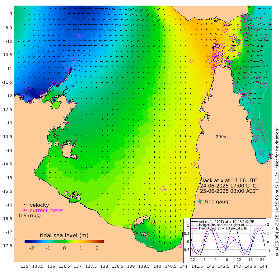 48cm/s -85T +3cm/s rms + 7cm/s -42T. ARA-GOC87 57m 19cm/s -175T +3cm/s rms + 2cm/s -2T. ARA-GOC87 60m 53cm/s -94T +2cm/s rms + 3cm/s 61T. ARA-GOC87 47m -14cm Daru -40cm Bobo Island -54cm Meer Island Barge -62cm Bramble Cay -42cm Unnamed Cay -51cm Pearce Cay -53cm Stephens Island -54cm Merrie England Shoals -22cm Mutacomal Reef -51cm Darnley Island Barge -57cm East Cay -33cm Yorke Island Barge -26cm Rennel Island -29cm Aureed Island 7cm Dungeness Reef 54cm Zagai Island 63cm Yam Island 140cm Dauan Island 127cm Saibai Island 127cm Phipi Reef 75cm Warrior Reef - West 119cm Mabuiag Island Barge -33cm Half Way Island -3cm Coconut Island -13cm Dugong Islet 29cm Poll Island 27cm Kirkcaldie Reef 81cm Suarji Island 36cm Sue Islet 122cm Hawkesbury Island 82cm Alert Patches 68cm Twin Island 130cm Badu Island 87cm St Pauls (Moa Island) 109cm Kubin (Moa Island) 96cm Ince Point 106cm Thursday Island 105cm Nardana Patches 119cm Turtle Head 119cm Round Island 123cm Goods Island 133cm Booby Island 122cm White Rocks Area 109cm Carpentaria 65cm Papou Point 137cm Bampfield Head 115cm Crab Island 128cm Red Wallis Island 118cm Packe Island -16cm Harrington Reef 148cm Herald Camp 33cm Sharp Point 96cm Red Island Point 85cm Possession Island 53cm Alpha Rock 33cm Frederick Point -18cm Wyborn Reef Light -5cm Tetley Island -30cm Triangle Reef -35cm Turtle Head Island -39cm Maclennan Cay -41cm Raine Island -38cm Mcsweeny Reef -40cm Collette Reef -38cm Shadwell Reef -55cm Hannibal Island -63cm Round Point 101cm Vrilya Point -52cm Cape Grenville -51cm Hicks Island -38cm Sir Charles Hardy Island -15cm Harvey Island -58cm Kay Reef -46cm Rocky Island -44cm Chapman Island -42cm Ham Reef -46cm Jubilee Reef -42cm Night Island -44cm Unnamed Reef No. 3 -53cm Morris Island -39cm 1st 3 Mile Opening -46cm Creech Reef -51cm Fife Island -73cm Eden Reef -54cm Stanley Island -73cm Normanby River -178cm Yabooma Island -219cm Hutchison River -191cm Elcho Island -179cm North West Crocodile Island -159cm Cape Wessel -192cm Stevens Island -161cm Guluwuru Island -170cm Hopeful Bay -163cm Auster Point -174cm Two Island Bay -222cm Cadell Strait -186cm Mallison Island -139cm Melville Bay (Gove Harbour) -148cm Truant Island -93cm Cape Arnhem -63cm Cape Grey -47cm Hawk Island -23cm Milner Bay (Groote Eylandt) -8cm Cape Beatrice 33cm West Island 34cm Centre Island 54cm Mornington Island 58cm West Wellesley Islands 67cm Bountiful Island 41cm Albert River Mouth 24cm Sweers Island 56cm Karumba 76cm Nassau River Offshore 92cm Christmas Creek 83cm Archer River 88cm Boyd Point 99cm Weipa (Humbug Point) 70cm Pennefather River 109cm Cullen Point