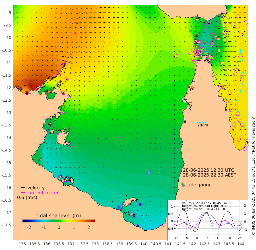 40cm/s 120T +3cm/s rms + 7cm/s -42T. ARA-GOC87 57m 8cm/s 152T +3cm/s rms + 2cm/s -2T. ARA-GOC87 60m 38cm/s 113T +2cm/s rms + 3cm/s 61T. ARA-GOC87 47m 39cm Daru 53cm Bobo Island 71cm Meer Island Barge 78cm Bramble Cay 64cm Unnamed Cay 69cm Pearce Cay 65cm Stephens Island 66cm Merrie England Shoals 50cm Mutacomal Reef 62cm Darnley Island Barge 78cm East Cay 50cm Yorke Island Barge 55cm Rennel Island 48cm Aureed Island 36cm Dungeness Reef 10cm Zagai Island 12cm Yam Island -2cm Dauan Island -4cm Saibai Island -10cm Phipi Reef 4cm Warrior Reef - West 18cm Mabuiag Island Barge 49cm Half Way Island 42cm Coconut Island 42cm Dugong Islet 27cm Poll Island 23cm Kirkcaldie Reef 11cm Suarji Island 19cm Sue Islet 107cm Hawkesbury Island 25cm Alert Patches 27cm Twin Island 81cm Badu Island 12cm St Pauls (Moa Island) 74cm Kubin (Moa Island) 32cm Ince Point 41cm Thursday Island 38cm Nardana Patches 61cm Turtle Head 81cm Round Island 97cm Goods Island 102cm Booby Island 104cm White Rocks Area 73cm Carpentaria 25cm Papou Point 128cm Bampfield Head 74cm Crab Island 94cm Red Wallis Island 80cm Packe Island 41cm Harrington Reef 91cm Herald Camp -17cm Sharp Point 54cm Red Island Point 43cm Possession Island 24cm Alpha Rock 33cm Frederick Point 55cm Wyborn Reef Light 49cm Tetley Island 66cm Triangle Reef 66cm Turtle Head Island 68cm Maclennan Cay 74cm Raine Island 57cm Mcsweeny Reef 60cm Collette Reef 65cm Shadwell Reef 68cm Hannibal Island 84cm Round Point 59cm Vrilya Point 72cm Cape Grenville 74cm Hicks Island 82cm Sir Charles Hardy Island 20cm Harvey Island 81cm Kay Reef 76cm Rocky Island 85cm Chapman Island 78cm Ham Reef 75cm Jubilee Reef 63cm Night Island 78cm Unnamed Reef No. 3 79cm Morris Island 75cm 1st 3 Mile Opening 74cm Creech Reef 68cm Fife Island 98cm Eden Reef 79cm Stanley Island 89cm Normanby River 215cm Yabooma Island 249cm Hutchison River 206cm Elcho Island 191cm North West Crocodile Island 158cm Cape Wessel 193cm Stevens Island 143cm Guluwuru Island 178cm Hopeful Bay 167cm Auster Point 166cm Two Island Bay 208cm Cadell Strait 132cm Mallison Island 124cm Melville Bay (Gove Harbour) 139cm Truant Island 76cm Cape Arnhem 24cm Cape Grey 0cm Hawk Island -60cm Milner Bay (Groote Eylandt) -74cm Cape Beatrice -144cm West Island -143cm Centre Island -153cm Mornington Island -150cm West Wellesley Islands -160cm Bountiful Island -187cm Albert River Mouth -205cm Sweers Island -190cm Karumba -108cm Nassau River Offshore -53cm Christmas Creek 11cm Archer River 31cm Boyd Point 39cm Weipa (Humbug Point) 28cm Pennefather River 53cm Cullen Point