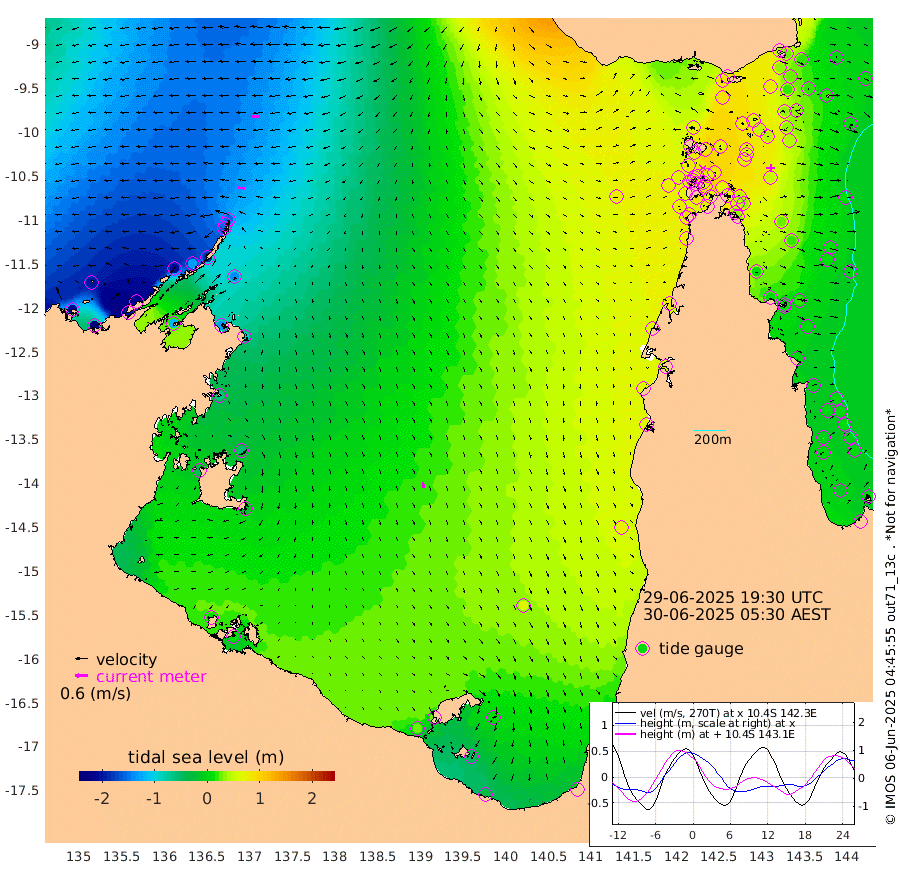 34cm/s -85T +3cm/s rms + 7cm/s -42T. ARA-GOC87 57m 28cm/s 170T +3cm/s rms + 2cm/s -2T. ARA-GOC87 60m 43cm/s -93T +2cm/s rms + 3cm/s 61T. ARA-GOC87 47m 44cm Daru 29cm Bobo Island 4cm Meer Island Barge 5cm Bramble Cay 23cm Unnamed Cay 20cm Pearce Cay 22cm Stephens Island 19cm Merrie England Shoals 37cm Mutacomal Reef 20cm Darnley Island Barge 8cm East Cay 31cm Yorke Island Barge 35cm Rennel Island 31cm Aureed Island 50cm Dungeness Reef 60cm Zagai Island 76cm Yam Island 84cm Dauan Island 81cm Saibai Island 85cm Phipi Reef 76cm Warrior Reef - West 72cm Mabuiag Island Barge 39cm Half Way Island 42cm Coconut Island 50cm Dugong Islet 56cm Poll Island 73cm Kirkcaldie Reef 65cm Suarji Island 63cm Sue Islet 81cm Hawkesbury Island 73cm Alert Patches 73cm Twin Island 68cm Badu Island 80cm St Pauls (Moa Island) 77cm Kubin (Moa Island) 77cm Ince Point 79cm Thursday Island 78cm Nardana Patches 76cm Turtle Head 72cm Round Island 68cm Goods Island 74cm Booby Island 60cm White Rocks Area 76cm Carpentaria 69cm Papou Point 63cm Bampfield Head 74cm Crab Island 78cm Red Wallis Island 83cm Packe Island 51cm Harrington Reef 101cm Herald Camp 32cm Sharp Point 80cm Red Island Point 69cm Possession Island 60cm Alpha Rock 63cm Frederick Point 33cm Wyborn Reef Light 39cm Tetley Island 11cm Triangle Reef 36cm Turtle Head Island 15cm Maclennan Cay -1cm Raine Island 24cm Mcsweeny Reef 19cm Collette Reef 8cm Shadwell Reef 14cm Hannibal Island 5cm Round Point 79cm Vrilya Point 12cm Cape Grenville 11cm Hicks Island 16cm Sir Charles Hardy Island 7cm Harvey Island 3cm Kay Reef 2cm Rocky Island -6cm Chapman Island 2cm Ham Reef 2cm Jubilee Reef 6cm Night Island 2cm Unnamed Reef No. 3 0cm Morris Island 0cm 1st 3 Mile Opening 5cm Creech Reef 3cm Fife Island -11cm Eden Reef 2cm Stanley Island -3cm Normanby River -207cm Yabooma Island -243cm Hutchison River -216cm Elcho Island -199cm North West Crocodile Island -151cm Cape Wessel -205cm Stevens Island -135cm Guluwuru Island -186cm Hopeful Bay -167cm Auster Point -156cm Two Island Bay -197cm Cadell Strait -114cm Mallison Island -130cm Melville Bay (Gove Harbour) -137cm Truant Island -88cm Cape Arnhem -66cm Cape Grey -56cm Hawk Island -45cm Milner Bay (Groote Eylandt) -26cm Cape Beatrice 13cm West Island 13cm Centre Island 29cm Mornington Island 23cm West Wellesley Islands 11cm Bountiful Island -31cm Albert River Mouth -50cm Sweers Island 0cm Karumba 61cm Nassau River Offshore 80cm Christmas Creek 64cm Archer River 67cm Boyd Point 64cm Weipa (Humbug Point) 62cm Pennefather River 79cm Cullen Point