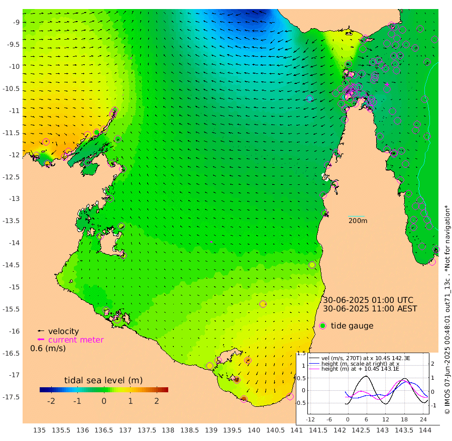 2cm/s 139T +3cm/s rms + 7cm/s -42T. ARA-GOC87 57m 17cm/s -73T +3cm/s rms + 2cm/s -2T. ARA-GOC87 60m 7cm/s 74T +2cm/s rms + 3cm/s 61T. ARA-GOC87 47m -41cm Daru -39cm Bobo Island -22cm Meer Island Barge -20cm Bramble Cay -35cm Unnamed Cay -28cm Pearce Cay -37cm Stephens Island -30cm Merrie England Shoals -37cm Mutacomal Reef -37cm Darnley Island Barge -22cm East Cay -42cm Yorke Island Barge -41cm Rennel Island -40cm Aureed Island -37cm Dungeness Reef -45cm Zagai Island -49cm Yam Island -23cm Dauan Island -35cm Saibai Island 0cm Phipi Reef -37cm Warrior Reef - West -39cm Mabuiag Island Barge -43cm Half Way Island -45cm Coconut Island -50cm Dugong Islet -45cm Poll Island -50cm Kirkcaldie Reef -49cm Suarji Island -54cm Sue Islet -40cm Hawkesbury Island -50cm Alert Patches -55cm Twin Island -22cm Badu Island -56cm St Pauls (Moa Island) -45cm Kubin (Moa Island) -50cm Ince Point -49cm Thursday Island -48cm Nardana Patches -36cm Turtle Head -49cm Round Island -32cm Goods Island -44cm Booby Island -37cm White Rocks Area -91cm Carpentaria -54cm Papou Point -81cm Bampfield Head -35cm Crab Island -44cm Red Wallis Island -39cm Packe Island -57cm Harrington Reef -63cm Herald Camp -16cm Sharp Point -30cm Red Island Point -54cm Possession Island -58cm Alpha Rock -55cm Frederick Point -49cm Wyborn Reef Light -52cm Tetley Island -22cm Triangle Reef -57cm Turtle Head Island -28cm Maclennan Cay -11cm Raine Island -37cm Mcsweeny Reef -30cm Collette Reef -19cm Shadwell Reef -29cm Hannibal Island -20cm Round Point -44cm Vrilya Point -26cm Cape Grenville -24cm Hicks Island -32cm Sir Charles Hardy Island -10cm Harvey Island -20cm Kay Reef -14cm Rocky Island -7cm Chapman Island -18cm Ham Reef -17cm Jubilee Reef -16cm Night Island -15cm Unnamed Reef No. 3 -15cm Morris Island -18cm 1st 3 Mile Opening -19cm Creech Reef -18cm Fife Island -9cm Eden Reef -18cm Stanley Island -16cm Normanby River 101cm Yabooma Island 118cm Hutchison River 106cm Elcho Island 109cm North West Crocodile Island 21cm Cape Wessel 85cm Stevens Island 13cm Guluwuru Island 82cm Hopeful Bay 45cm Auster Point 38cm Two Island Bay 86cm Cadell Strait -28cm Mallison Island 26cm Melville Bay (Gove Harbour) 14cm Truant Island 9cm Cape Arnhem 19cm Cape Grey 32cm Hawk Island 36cm Milner Bay (Groote Eylandt) 43cm Cape Beatrice 34cm West Island 35cm Centre Island 93cm Mornington Island 89cm West Wellesley Islands 137cm Bountiful Island 193cm Albert River Mouth 196cm Sweers Island 184cm Karumba 89cm Nassau River Offshore 49cm Christmas Creek 19cm Archer River -19cm Boyd Point 1cm Weipa (Humbug Point) -15cm Pennefather River -42cm Cullen Point