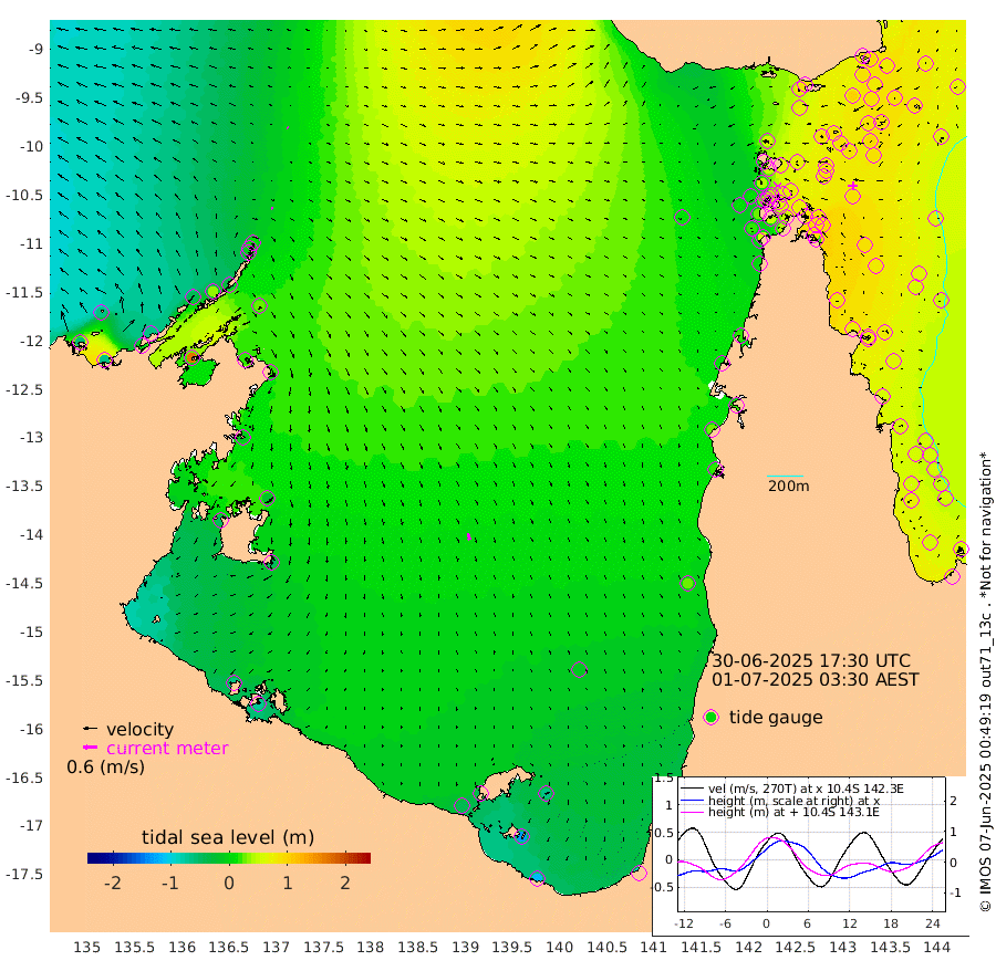 6cm/s 87T +3cm/s rms + 7cm/s -42T. ARA-GOC87 57m 30cm/s 165T +3cm/s rms + 2cm/s -2T. ARA-GOC87 60m 4cm/s -36T +2cm/s rms + 3cm/s 61T. ARA-GOC87 47m 94cm Daru 94cm Bobo Island 62cm Meer Island Barge 72cm Bramble Cay 82cm Unnamed Cay 87cm Pearce Cay 85cm Stephens Island 77cm Merrie England Shoals 88cm Mutacomal Reef 83cm Darnley Island Barge 71cm East Cay 89cm Yorke Island Barge 87cm Rennel Island 90cm Aureed Island 84cm Dungeness Reef 85cm Zagai Island 88cm Yam Island 85cm Dauan Island 86cm Saibai Island 68cm Phipi Reef 99cm Warrior Reef - West 54cm Mabuiag Island Barge 83cm Half Way Island 85cm Coconut Island 90cm Dugong Islet 82cm Poll Island 84cm Kirkcaldie Reef 72cm Suarji Island 86cm Sue Islet 40cm Hawkesbury Island 65cm Alert Patches 74cm Twin Island 30cm Badu Island 74cm St Pauls (Moa Island) 50cm Kubin (Moa Island) 59cm Ince Point 50cm Thursday Island 52cm Nardana Patches 43cm Turtle Head 39cm Round Island 25cm Goods Island 12cm Booby Island 10cm White Rocks Area 14cm Carpentaria 65cm Papou Point 28cm Bampfield Head 9cm Crab Island 22cm Red Wallis Island 47cm Packe Island 91cm Harrington Reef 53cm Herald Camp 21cm Sharp Point 40cm Red Island Point 52cm Possession Island 75cm Alpha Rock 84cm Frederick Point 90cm Wyborn Reef Light 91cm Tetley Island 64cm Triangle Reef 85cm Turtle Head Island 65cm Maclennan Cay 47cm Raine Island 83cm Mcsweeny Reef 76cm Collette Reef 60cm Shadwell Reef 78cm Hannibal Island 75cm Round Point 4cm Vrilya Point 68cm Cape Grenville 69cm Hicks Island 81cm Sir Charles Hardy Island 23cm Harvey Island 61cm Kay Reef 57cm Rocky Island 56cm Chapman Island 57cm Ham Reef 56cm Jubilee Reef 53cm Night Island 56cm Unnamed Reef No. 3 56cm Morris Island 46cm 1st 3 Mile Opening 56cm Creech Reef 69cm Fife Island 57cm Eden Reef 56cm Stanley Island 63cm Normanby River -55cm Yabooma Island -60cm Hutchison River -67cm Elcho Island -67cm North West Crocodile Island 8cm Cape Wessel -38cm Stevens Island 36cm Guluwuru Island -36cm Hopeful Bay -17cm Auster Point -6cm Two Island Bay -3cm Cadell Strait 167cm Mallison Island 20cm Melville Bay (Gove Harbour) 28cm Truant Island 20cm Cape Arnhem -8cm Cape Grey -16cm Hawk Island -52cm Milner Bay (Groote Eylandt) -49cm Cape Beatrice -64cm West Island -70cm Centre Island -45cm Mornington Island -44cm West Wellesley Islands -62cm Bountiful Island -114cm Albert River Mouth -129cm Sweers Island -97cm Karumba -9cm Nassau River Offshore 24cm Christmas Creek 17cm Archer River 29cm Boyd Point 21cm Weipa (Humbug Point) 1cm Pennefather River 21cm Cullen Point