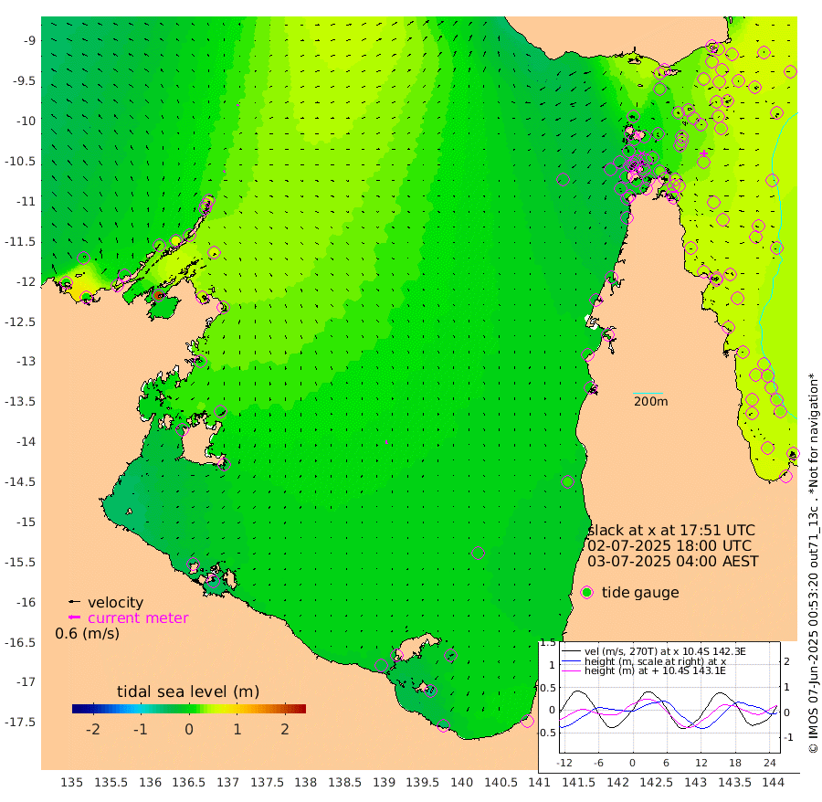 6cm/s 57T +3cm/s rms + 7cm/s -42T. ARA-GOC87 57m 18cm/s 175T +3cm/s rms + 2cm/s -2T. ARA-GOC87 60m 6cm/s 8T +2cm/s rms + 3cm/s 61T. ARA-GOC87 47m 45cm Daru 45cm Bobo Island 39cm Meer Island Barge 45cm Bramble Cay 43cm Unnamed Cay 38cm Pearce Cay 43cm Stephens Island 41cm Merrie England Shoals 44cm Mutacomal Reef 44cm Darnley Island Barge 46cm East Cay 42cm Yorke Island Barge 40cm Rennel Island 40cm Aureed Island 31cm Dungeness Reef 35cm Zagai Island 37cm Yam Island 42cm Dauan Island 46cm Saibai Island 23cm Phipi Reef 46cm Warrior Reef - West 14cm Mabuiag Island Barge 32cm Half Way Island 33cm Coconut Island 34cm Dugong Islet 28cm Poll Island 26cm Kirkcaldie Reef 15cm Suarji Island 32cm Sue Islet -1cm Hawkesbury Island 7cm Alert Patches 16cm Twin Island -6cm Badu Island 14cm St Pauls (Moa Island) 8cm Kubin (Moa Island) 8cm Ince Point 0cm Thursday Island 3cm Nardana Patches 0cm Turtle Head 4cm Round Island -10cm Goods Island -22cm Booby Island -21cm White Rocks Area -21cm Carpentaria 13cm Papou Point -5cm Bampfield Head -21cm Crab Island -12cm Red Wallis Island 7cm Packe Island 30cm Harrington Reef 15cm Herald Camp 3cm Sharp Point -4cm Red Island Point 2cm Possession Island 27cm Alpha Rock 26cm Frederick Point 43cm Wyborn Reef Light 42cm Tetley Island 40cm Triangle Reef 24cm Turtle Head Island 39cm Maclennan Cay 34cm Raine Island 42cm Mcsweeny Reef 42cm Collette Reef 39cm Shadwell Reef 44cm Hannibal Island 46cm Round Point -31cm Vrilya Point 41cm Cape Grenville 43cm Hicks Island 58cm Sir Charles Hardy Island 13cm Harvey Island 43cm Kay Reef 41cm Rocky Island 44cm Chapman Island 43cm Ham Reef 40cm Jubilee Reef 35cm Night Island 42cm Unnamed Reef No. 3 40cm Morris Island 30cm 1st 3 Mile Opening 37cm Creech Reef 51cm Fife Island 44cm Eden Reef 39cm Stanley Island 45cm Normanby River 12cm Yabooma Island 14cm Hutchison River 5cm Elcho Island 2cm North West Crocodile Island 43cm Cape Wessel 25cm Stevens Island 61cm Guluwuru Island 25cm Hopeful Bay 23cm Auster Point 32cm Two Island Bay 44cm Cadell Strait 197cm Mallison Island 47cm Melville Bay (Gove Harbour) 53cm Truant Island 37cm Cape Arnhem 8cm Cape Grey 3cm Hawk Island -28cm Milner Bay (Groote Eylandt) -27cm Cape Beatrice -48cm West Island -55cm Centre Island -23cm Mornington Island -23cm West Wellesley Islands -23cm Bountiful Island -46cm Albert River Mouth -62cm Sweers Island -42cm Karumba -1cm Nassau River Offshore 16cm Christmas Creek 3cm Archer River 7cm Boyd Point 6cm Weipa (Humbug Point) -26cm Pennefather River -6cm Cullen Point