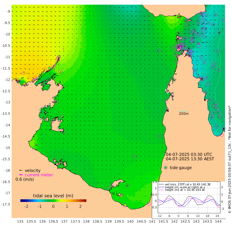 16cm/s 113T +3cm/s rms + 7cm/s -42T. ARA-GOC87 57m 11cm/s -23T +3cm/s rms + 2cm/s -2T. ARA-GOC87 60m 18cm/s 98T +2cm/s rms + 3cm/s 61T. ARA-GOC87 47m -70cm Daru -74cm Bobo Island -55cm Meer Island Barge -65cm Bramble Cay -74cm Unnamed Cay -69cm Pearce Cay -74cm Stephens Island -74cm Merrie England Shoals -76cm Mutacomal Reef -70cm Darnley Island Barge -64cm East Cay -70cm Yorke Island Barge -74cm Rennel Island -75cm Aureed Island -65cm Dungeness Reef -53cm Zagai Island -59cm Yam Island -15cm Dauan Island -27cm Saibai Island -16cm Phipi Reef -52cm Warrior Reef - West -18cm Mabuiag Island Barge -73cm Half Way Island -71cm Coconut Island -77cm Dugong Islet -61cm Poll Island -67cm Kirkcaldie Reef -61cm Suarji Island -60cm Sue Islet -6cm Hawkesbury Island -48cm Alert Patches -55cm Twin Island 0cm Badu Island -46cm St Pauls (Moa Island) -21cm Kubin (Moa Island) -38cm Ince Point -32cm Thursday Island -33cm Nardana Patches -24cm Turtle Head -18cm Round Island -13cm Goods Island -9cm Booby Island -16cm White Rocks Area -36cm Carpentaria -46cm Papou Point -28cm Bampfield Head -1cm Crab Island -17cm Red Wallis Island -26cm Packe Island -83cm Harrington Reef -27cm Herald Camp -13cm Sharp Point -22cm Red Island Point -36cm Possession Island -58cm Alpha Rock -65cm Frederick Point -71cm Wyborn Reef Light -69cm Tetley Island -52cm Triangle Reef -63cm Turtle Head Island -62cm Maclennan Cay -44cm Raine Island -70cm Mcsweeny Reef -66cm Collette Reef -51cm Shadwell Reef -72cm Hannibal Island -65cm Round Point 1cm Vrilya Point -68cm Cape Grenville -62cm Hicks Island -75cm Sir Charles Hardy Island -21cm Harvey Island -65cm Kay Reef -54cm Rocky Island -50cm Chapman Island -52cm Ham Reef -52cm Jubilee Reef -49cm Night Island -54cm Unnamed Reef No. 3 -56cm Morris Island -48cm 1st 3 Mile Opening -55cm Creech Reef -52cm Fife Island -59cm Eden Reef -57cm Stanley Island -64cm Normanby River 99cm Yabooma Island 102cm Hutchison River 96cm Elcho Island 95cm North West Crocodile Island 36cm Cape Wessel 88cm Stevens Island 21cm Guluwuru Island 80cm Hopeful Bay 62cm Auster Point 63cm Two Island Bay 93cm Cadell Strait -5cm Mallison Island 34cm Melville Bay (Gove Harbour) 32cm Truant Island 18cm Cape Arnhem 17cm Cape Grey 19cm Hawk Island 18cm Milner Bay (Groote Eylandt) 11cm Cape Beatrice -3cm West Island -3cm Centre Island 2cm Mornington Island -3cm West Wellesley Islands 12cm Bountiful Island 45cm Albert River Mouth 66cm Sweers Island 46cm Karumba -3cm Nassau River Offshore -19cm Christmas Creek -9cm Archer River -18cm Boyd Point -12cm Weipa (Humbug Point) 8cm Pennefather River -11cm Cullen Point