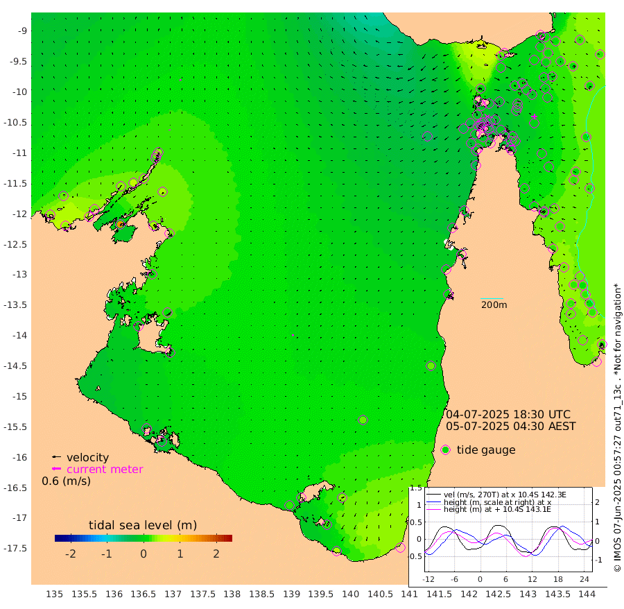 6cm/s -21T +3cm/s rms + 7cm/s -42T. ARA-GOC87 57m 10cm/s -158T +3cm/s rms + 2cm/s -2T. ARA-GOC87 60m 7cm/s -26T +2cm/s rms + 3cm/s 61T. ARA-GOC87 47m 7cm Daru 1cm Bobo Island 15cm Meer Island Barge 16cm Bramble Cay 9cm Unnamed Cay -6cm Pearce Cay 6cm Stephens Island 8cm Merrie England Shoals 6cm Mutacomal Reef 9cm Darnley Island Barge 18cm East Cay 4cm Yorke Island Barge 2cm Rennel Island -4cm Aureed Island -7cm Dungeness Reef 1cm Zagai Island 4cm Yam Island 20cm Dauan Island 23cm Saibai Island 6cm Phipi Reef 11cm Warrior Reef - West -5cm Mabuiag Island Barge -6cm Half Way Island -8cm Coconut Island -7cm Dugong Islet -11cm Poll Island -9cm Kirkcaldie Reef -20cm Suarji Island -5cm Sue Islet -20cm Hawkesbury Island -25cm Alert Patches -21cm Twin Island -16cm Badu Island -21cm St Pauls (Moa Island) -15cm Kubin (Moa Island) -21cm Ince Point -25cm Thursday Island -22cm Nardana Patches -19cm Turtle Head -16cm Round Island -21cm Goods Island -31cm Booby Island -31cm White Rocks Area -38cm Carpentaria -19cm Papou Point -26cm Bampfield Head -26cm Crab Island -26cm Red Wallis Island -15cm Packe Island -16cm Harrington Reef -6cm Herald Camp -5cm Sharp Point -21cm Red Island Point -28cm Possession Island -8cm Alpha Rock -16cm Frederick Point 1cm Wyborn Reef Light -1cm Tetley Island 12cm Triangle Reef -21cm Turtle Head Island 13cm Maclennan Cay 19cm Raine Island 5cm Mcsweeny Reef 10cm Collette Reef 17cm Shadwell Reef 10cm Hannibal Island 13cm Round Point -38cm Vrilya Point 13cm Cape Grenville 16cm Hicks Island 30cm Sir Charles Hardy Island 4cm Harvey Island 20cm Kay Reef 21cm Rocky Island 23cm Chapman Island 23cm Ham Reef 21cm Jubilee Reef 14cm Night Island 21cm Unnamed Reef No. 3 20cm Morris Island 15cm 1st 3 Mile Opening 17cm Creech Reef 24cm Fife Island 23cm Eden Reef 20cm Stanley Island 20cm Normanby River 33cm Yabooma Island 37cm Hutchison River 29cm Elcho Island 28cm North West Crocodile Island 31cm Cape Wessel 35cm Stevens Island 48cm Guluwuru Island 34cm Hopeful Bay 21cm Auster Point 26cm Two Island Bay 43cm Cadell Strait 149cm Mallison Island 39cm Melville Bay (Gove Harbour) 38cm Truant Island 27cm Cape Arnhem 13cm Cape Grey 8cm Hawk Island -5cm Milner Bay (Groote Eylandt) -3cm Cape Beatrice -18cm West Island -25cm Centre Island 16cm Mornington Island 15cm West Wellesley Islands 35cm Bountiful Island 38cm Albert River Mouth 17cm Sweers Island 32cm Karumba 26cm Nassau River Offshore 28cm Christmas Creek 6cm Archer River 1cm Boyd Point 7cm Weipa (Humbug Point) -29cm Pennefather River -16cm Cullen Point