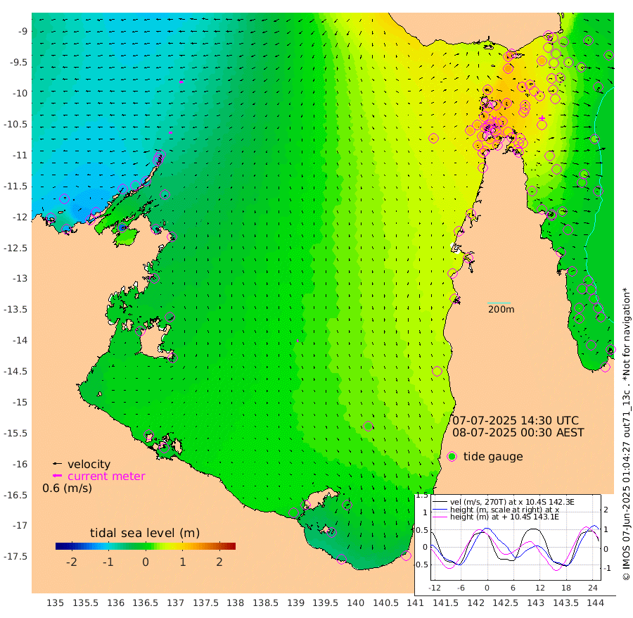 22cm/s -94T +3cm/s rms + 7cm/s -42T. ARA-GOC87 57m 18cm/s 172T +3cm/s rms + 2cm/s -2T. ARA-GOC87 60m 26cm/s -98T +2cm/s rms + 3cm/s 61T. ARA-GOC87 47m 63cm Daru 57cm Bobo Island 13cm Meer Island Barge 17cm Bramble Cay 39cm Unnamed Cay 56cm Pearce Cay 38cm Stephens Island 28cm Merrie England Shoals 55cm Mutacomal Reef 33cm Darnley Island Barge 17cm East Cay 51cm Yorke Island Barge 60cm Rennel Island 66cm Aureed Island 84cm Dungeness Reef 101cm Zagai Island 105cm Yam Island 132cm Dauan Island 121cm Saibai Island 129cm Phipi Reef 114cm Warrior Reef - West 118cm Mabuiag Island Barge 55cm Half Way Island 78cm Coconut Island 73cm Dugong Islet 95cm Poll Island 91cm Kirkcaldie Reef 133cm Suarji Island 92cm Sue Islet 121cm Hawkesbury Island 123cm Alert Patches 118cm Twin Island 120cm Badu Island 127cm St Pauls (Moa Island) 117cm Kubin (Moa Island) 121cm Ince Point 122cm Thursday Island 122cm Nardana Patches 124cm Turtle Head 115cm Round Island 117cm Goods Island 115cm Booby Island 115cm White Rocks Area 93cm Carpentaria 108cm Papou Point 127cm Bampfield Head 90cm Crab Island 113cm Red Wallis Island 115cm Packe Island 82cm Harrington Reef 127cm Herald Camp 35cm Sharp Point 110cm Red Island Point 117cm Possession Island 95cm Alpha Rock 101cm Frederick Point 64cm Wyborn Reef Light 72cm Tetley Island 29cm Triangle Reef 68cm Turtle Head Island 26cm Maclennan Cay 6cm Raine Island 44cm Mcsweeny Reef 34cm Collette Reef 16cm Shadwell Reef 28cm Hannibal Island 20cm Round Point 76cm Vrilya Point 18cm Cape Grenville 20cm Hicks Island 28cm Sir Charles Hardy Island 7cm Harvey Island 6cm Kay Reef 10cm Rocky Island 10cm Chapman Island 9cm Ham Reef 8cm Jubilee Reef 10cm Night Island 9cm Unnamed Reef No. 3 7cm Morris Island 12cm 1st 3 Mile Opening 11cm Creech Reef 8cm Fife Island -3cm Eden Reef 3cm Stanley Island 1cm Normanby River -107cm Yabooma Island -122cm Hutchison River -118cm Elcho Island -112cm North West Crocodile Island -78cm Cape Wessel -120cm Stevens Island -78cm Guluwuru Island -108cm Hopeful Bay -84cm Auster Point -95cm Two Island Bay -118cm Cadell Strait -151cm Mallison Island -70cm Melville Bay (Gove Harbour) -70cm Truant Island -45cm Cape Arnhem -34cm Cape Grey -32cm Hawk Island -36cm Milner Bay (Groote Eylandt) -28cm Cape Beatrice -12cm West Island -10cm Centre Island -4cm Mornington Island 2cm West Wellesley Islands -2cm Bountiful Island -51cm Albert River Mouth -59cm Sweers Island -33cm Karumba 20cm Nassau River Offshore 46cm Christmas Creek 52cm Archer River 66cm Boyd Point 68cm Weipa (Humbug Point) 48cm Pennefather River 78cm Cullen Point