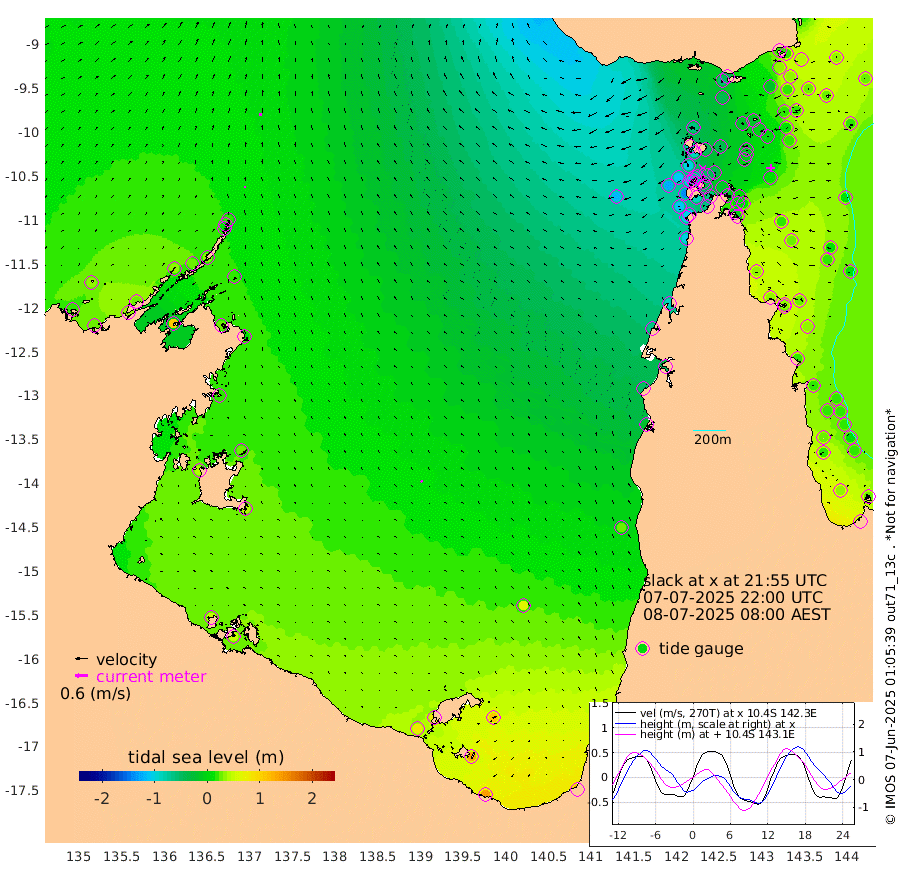 11cm/s -1T +3cm/s rms + 7cm/s -42T. ARA-GOC87 57m 10cm/s -51T +3cm/s rms + 2cm/s -2T. ARA-GOC87 60m 13cm/s 13T +2cm/s rms + 3cm/s 61T. ARA-GOC87 47m 18cm Daru 21cm Bobo Island 20cm Meer Island Barge 36cm Bramble Cay 32cm Unnamed Cay 17cm Pearce Cay 25cm Stephens Island 42cm Merrie England Shoals 31cm Mutacomal Reef 23cm Darnley Island Barge 27cm East Cay 17cm Yorke Island Barge 16cm Rennel Island 12cm Aureed Island 0cm Dungeness Reef -19cm Zagai Island -16cm Yam Island -57cm Dauan Island -43cm Saibai Island -38cm Phipi Reef -19cm Warrior Reef - West -63cm Mabuiag Island Barge 16cm Half Way Island 3cm Coconut Island 8cm Dugong Islet -12cm Poll Island -5cm Kirkcaldie Reef -40cm Suarji Island -11cm Sue Islet -104cm Hawkesbury Island -49cm Alert Patches -41cm Twin Island -96cm Badu Island -51cm St Pauls (Moa Island) -87cm Kubin (Moa Island) -62cm Ince Point -74cm Thursday Island -71cm Nardana Patches -84cm Turtle Head -94cm Round Island -103cm Goods Island -123cm Booby Island -109cm White Rocks Area -118cm Carpentaria -42cm Papou Point -139cm Bampfield Head -101cm Crab Island -111cm Red Wallis Island -88cm Packe Island 5cm Harrington Reef -110cm Herald Camp -7cm Sharp Point -65cm Red Island Point -67cm Possession Island -22cm Alpha Rock -21cm Frederick Point 13cm Wyborn Reef Light 6cm Tetley Island 10cm Triangle Reef -6cm Turtle Head Island 14cm Maclennan Cay 14cm Raine Island 20cm Mcsweeny Reef 26cm Collette Reef 20cm Shadwell Reef 34cm Hannibal Island 33cm Round Point -100cm Vrilya Point 31cm Cape Grenville 23cm Hicks Island 24cm Sir Charles Hardy Island 7cm Harvey Island 35cm Kay Reef 22cm Rocky Island 20cm Chapman Island 18cm Ham Reef 19cm Jubilee Reef 16cm Night Island 19cm Unnamed Reef No. 3 23cm Morris Island 8cm 1st 3 Mile Opening 16cm Creech Reef 19cm Fife Island 30cm Eden Reef 26cm Stanley Island 35cm Normanby River 21cm Yabooma Island 29cm Hutchison River 28cm Elcho Island 32cm North West Crocodile Island 16cm Cape Wessel 34cm Stevens Island 30cm Guluwuru Island 31cm Hopeful Bay 11cm Auster Point 13cm Two Island Bay 33cm Cadell Strait 105cm Mallison Island 23cm Melville Bay (Gove Harbour) 15cm Truant Island 13cm Cape Arnhem 22cm Cape Grey 29cm Hawk Island 39cm Milner Bay (Groote Eylandt) 45cm Cape Beatrice 50cm West Island 47cm Centre Island 82cm Mornington Island 80cm West Wellesley Islands 108cm Bountiful Island 140cm Albert River Mouth 134cm Sweers Island 128cm Karumba 63cm Nassau River Offshore 24cm Christmas Creek -22cm Archer River -52cm Boyd Point -49cm Weipa (Humbug Point) -63cm Pennefather River -87cm Cullen Point