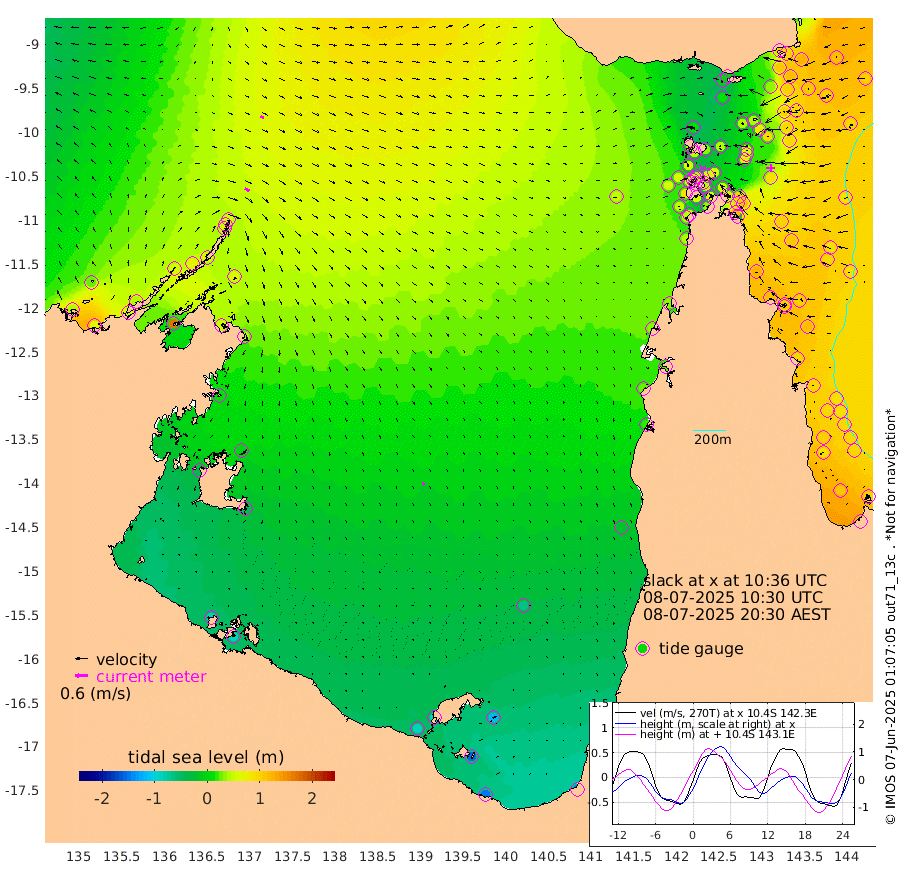 24cm/s 120T +3cm/s rms + 7cm/s -42T. ARA-GOC87 57m 16cm/s 155T +3cm/s rms + 2cm/s -2T. ARA-GOC87 60m 18cm/s 118T +2cm/s rms + 3cm/s 61T. ARA-GOC87 47m 93cm Daru 98cm Bobo Island 94cm Meer Island Barge 113cm Bramble Cay 116cm Unnamed Cay 105cm Pearce Cay 108cm Stephens Island 126cm Merrie England Shoals 109cm Mutacomal Reef 105cm Darnley Island Barge 101cm East Cay 97cm Yorke Island Barge 100cm Rennel Island 90cm Aureed Island 78cm Dungeness Reef 41cm Zagai Island 39cm Yam Island -6cm Dauan Island 0cm Saibai Island 8cm Phipi Reef 32cm Warrior Reef - West 14cm Mabuiag Island Barge 96cm Half Way Island 90cm Coconut Island 89cm Dugong Islet 64cm Poll Island 68cm Kirkcaldie Reef 42cm Suarji Island 62cm Sue Islet 59cm Hawkesbury Island 58cm Alert Patches 54cm Twin Island 42cm Badu Island 37cm St Pauls (Moa Island) 46cm Kubin (Moa Island) 42cm Ince Point 41cm Thursday Island 40cm Nardana Patches 46cm Turtle Head 56cm Round Island 55cm Goods Island 53cm Booby Island 53cm White Rocks Area 52cm Carpentaria 39cm Papou Point 87cm Bampfield Head 39cm Crab Island 48cm Red Wallis Island 53cm Packe Island 96cm Harrington Reef 52cm Herald Camp 0cm Sharp Point 37cm Red Island Point 54cm Possession Island 60cm Alpha Rock 72cm Frederick Point 107cm Wyborn Reef Light 99cm Tetley Island 85cm Triangle Reef 114cm Turtle Head Island 88cm Maclennan Cay 84cm Raine Island 104cm Mcsweeny Reef 107cm Collette Reef 95cm Shadwell Reef 120cm Hannibal Island 120cm Round Point 40cm Vrilya Point 111cm Cape Grenville 99cm Hicks Island 103cm Sir Charles Hardy Island 31cm Harvey Island 113cm Kay Reef 93cm Rocky Island 94cm Chapman Island 89cm Ham Reef 91cm Jubilee Reef 83cm Night Island 92cm Unnamed Reef No. 3 98cm Morris Island 90cm 1st 3 Mile Opening 92cm Creech Reef 87cm Fife Island 112cm Eden Reef 103cm Stanley Island 107cm Normanby River 39cm Yabooma Island 62cm Hutchison River 43cm Elcho Island 29cm North West Crocodile Island 53cm Cape Wessel 56cm Stevens Island 73cm Guluwuru Island 53cm Hopeful Bay 53cm Auster Point 45cm Two Island Bay 55cm Cadell Strait 166cm Mallison Island 56cm Melville Bay (Gove Harbour) 65cm Truant Island 38cm Cape Arnhem 8cm Cape Grey 0cm Hawk Island -45cm Milner Bay (Groote Eylandt) -51cm Cape Beatrice -88cm West Island -83cm Centre Island -88cm Mornington Island -90cm West Wellesley Islands -115cm Bountiful Island -149cm Albert River Mouth -151cm Sweers Island -143cm Karumba -62cm Nassau River Offshore -21cm Christmas Creek 19cm Archer River 29cm Boyd Point 26cm Weipa (Humbug Point) 36cm Pennefather River 32cm Cullen Point