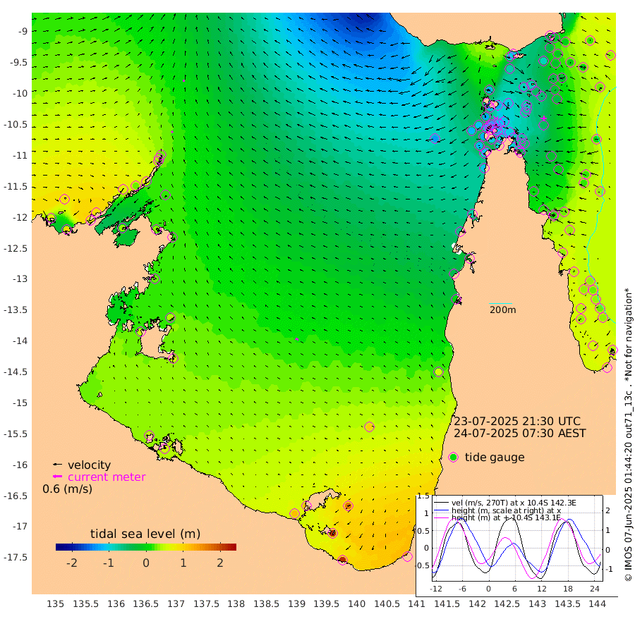 12cm/s -34T +3cm/s rms + 7cm/s -42T. ARA-GOC87 57m 20cm/s -64T +3cm/s rms + 2cm/s -2T. ARA-GOC87 60m 13cm/s 3T +2cm/s rms + 3cm/s 61T. ARA-GOC87 47m -42cm Daru -29cm Bobo Island 25cm Meer Island Barge 19cm Bramble Cay -13cm Unnamed Cay -18cm Pearce Cay -5cm Stephens Island -5cm Merrie England Shoals -37cm Mutacomal Reef -1cm Darnley Island Barge 30cm East Cay -24cm Yorke Island Barge -30cm Rennel Island -28cm Aureed Island -51cm Dungeness Reef -86cm Zagai Island -88cm Yam Island -105cm Dauan Island -103cm Saibai Island -76cm Phipi Reef -84cm Warrior Reef - West -120cm Mabuiag Island Barge -33cm Half Way Island -58cm Coconut Island -49cm Dugong Islet -78cm Poll Island -74cm Kirkcaldie Reef -101cm Suarji Island -84cm Sue Islet -123cm Hawkesbury Island -114cm Alert Patches -110cm Twin Island -121cm Badu Island -124cm St Pauls (Moa Island) -115cm Kubin (Moa Island) -118cm Ince Point -122cm Thursday Island -120cm Nardana Patches -109cm Turtle Head -106cm Round Island -107cm Goods Island -119cm Booby Island -112cm White Rocks Area -131cm Carpentaria -107cm Papou Point -127cm Bampfield Head -100cm Crab Island -116cm Red Wallis Island -105cm Packe Island -61cm Harrington Reef -105cm Herald Camp -37cm Sharp Point -95cm Red Island Point -104cm Possession Island -99cm Alpha Rock -90cm Frederick Point -57cm Wyborn Reef Light -69cm Tetley Island 4cm Triangle Reef -68cm Turtle Head Island 16cm Maclennan Cay 34cm Raine Island -18cm Mcsweeny Reef -4cm Collette Reef 17cm Shadwell Reef 4cm Hannibal Island 17cm Round Point -107cm Vrilya Point 19cm Cape Grenville 22cm Hicks Island 24cm Sir Charles Hardy Island 5cm Harvey Island 33cm Kay Reef 36cm Rocky Island 41cm Chapman Island 34cm Ham Reef 31cm Jubilee Reef 29cm Night Island 35cm Unnamed Reef No. 3 38cm Morris Island 28cm 1st 3 Mile Opening 32cm Creech Reef 34cm Fife Island 57cm Eden Reef 40cm Stanley Island 48cm Normanby River 76cm Yabooma Island 91cm Hutchison River 84cm Elcho Island 83cm North West Crocodile Island 27cm Cape Wessel 62cm Stevens Island 29cm Guluwuru Island 73cm Hopeful Bay 37cm Auster Point 38cm Two Island Bay 66cm Cadell Strait 31cm Mallison Island 32cm Melville Bay (Gove Harbour) 21cm Truant Island 17cm Cape Arnhem 26cm Cape Grey 41cm Hawk Island 48cm Milner Bay (Groote Eylandt) 55cm Cape Beatrice 52cm West Island 55cm Centre Island 120cm Mornington Island 114cm West Wellesley Islands 166cm Bountiful Island 213cm Albert River Mouth 215cm Sweers Island 204cm Karumba 99cm Nassau River Offshore 53cm Christmas Creek 2cm Archer River -39cm Boyd Point -21cm Weipa (Humbug Point) -62cm Pennefather River -81cm Cullen Point