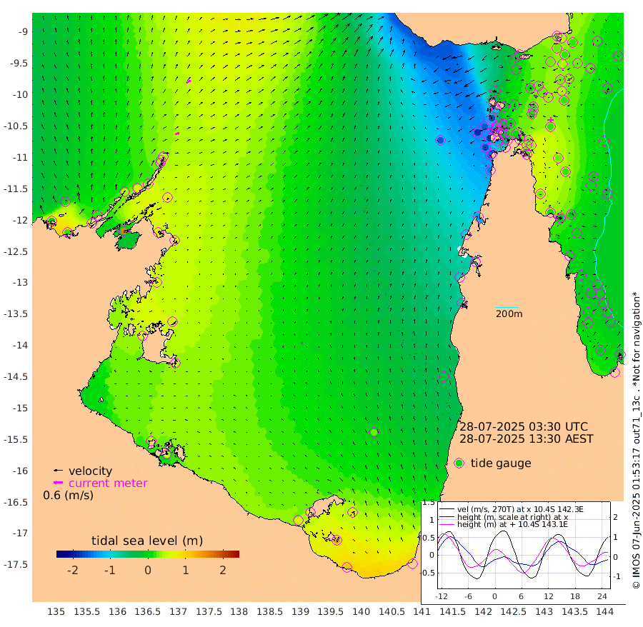 29cm/s 70T +3cm/s rms + 7cm/s -42T. ARA-GOC87 57m 15cm/s -5T +3cm/s rms + 2cm/s -2T. ARA-GOC87 60m 33cm/s 62T +2cm/s rms + 3cm/s 61T. ARA-GOC87 47m 37cm Daru 47cm Bobo Island 6cm Meer Island Barge 16cm Bramble Cay 22cm Unnamed Cay 39cm Pearce Cay 26cm Stephens Island 21cm Merrie England Shoals 26cm Mutacomal Reef 25cm Darnley Island Barge 5cm East Cay 32cm Yorke Island Barge 24cm Rennel Island 43cm Aureed Island 24cm Dungeness Reef 29cm Zagai Island 4cm Yam Island -13cm Dauan Island -8cm Saibai Island -4cm Phipi Reef 25cm Warrior Reef - West -44cm Mabuiag Island Barge 22cm Half Way Island 33cm Coconut Island 20cm Dugong Islet 19cm Poll Island 7cm Kirkcaldie Reef 12cm Suarji Island 16cm Sue Islet -167cm Hawkesbury Island -21cm Alert Patches -12cm Twin Island -122cm Badu Island -10cm St Pauls (Moa Island) -111cm Kubin (Moa Island) -48cm Ince Point -71cm Thursday Island -64cm Nardana Patches -99cm Turtle Head -129cm Round Island -150cm Goods Island -181cm Booby Island -164cm White Rocks Area -158cm Carpentaria -18cm Papou Point -186cm Bampfield Head -152cm Crab Island -168cm Red Wallis Island -130cm Packe Island 32cm Harrington Reef -181cm Herald Camp 4cm Sharp Point -94cm Red Island Point -55cm Possession Island -5cm Alpha Rock 9cm Frederick Point 30cm Wyborn Reef Light 27cm Tetley Island 4cm Triangle Reef 21cm Turtle Head Island -3cm Maclennan Cay -11cm Raine Island 27cm Mcsweeny Reef 21cm Collette Reef 2cm Shadwell Reef 25cm Hannibal Island 14cm Round Point -149cm Vrilya Point 3cm Cape Grenville 4cm Hicks Island -8cm Sir Charles Hardy Island 2cm Harvey Island -5cm Kay Reef -6cm Rocky Island -9cm Chapman Island -13cm Ham Reef -8cm Jubilee Reef -2cm Night Island -11cm Unnamed Reef No. 3 -6cm Morris Island -14cm 1st 3 Mile Opening -9cm Creech Reef 11cm Fife Island -8cm Eden Reef -11cm Stanley Island -4cm Normanby River 0cm Yabooma Island 21cm Hutchison River 15cm Elcho Island 9cm North West Crocodile Island 48cm Cape Wessel 41cm Stevens Island 79cm Guluwuru Island 27cm Hopeful Bay 39cm Auster Point 31cm Two Island Bay 65cm Cadell Strait 159cm Mallison Island 73cm Melville Bay (Gove Harbour) 75cm Truant Island 64cm Cape Arnhem 62cm Cape Grey 59cm Hawk Island 66cm Milner Bay (Groote Eylandt) 57cm Cape Beatrice 57cm West Island 53cm Centre Island 71cm Mornington Island 70cm West Wellesley Islands 78cm Bountiful Island 108cm Albert River Mouth 139cm Sweers Island 91cm Karumba 23cm Nassau River Offshore -24cm Christmas Creek -71cm Archer River -89cm Boyd Point -102cm Weipa (Humbug Point) -93cm Pennefather River -138cm Cullen Point