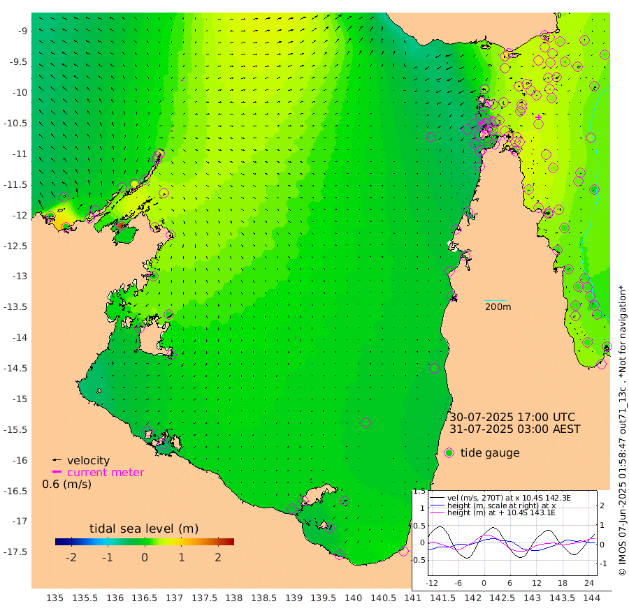9cm/s 46T +3cm/s rms + 7cm/s -42T. ARA-GOC87 57m 16cm/s 177T +3cm/s rms + 2cm/s -2T. ARA-GOC87 60m 10cm/s 12T +2cm/s rms + 3cm/s 61T. ARA-GOC87 47m 52cm Daru 51cm Bobo Island 24cm Meer Island Barge 32cm Bramble Cay 38cm Unnamed Cay 38cm Pearce Cay 36cm Stephens Island 33cm Merrie England Shoals 47cm Mutacomal Reef 37cm Darnley Island Barge 28cm East Cay 43cm Yorke Island Barge 41cm Rennel Island 46cm Aureed Island 39cm Dungeness Reef 60cm Zagai Island 56cm Yam Island 70cm Dauan Island 73cm Saibai Island 48cm Phipi Reef 72cm Warrior Reef - West 30cm Mabuiag Island Barge 33cm Half Way Island 44cm Coconut Island 39cm Dugong Islet 44cm Poll Island 36cm Kirkcaldie Reef 38cm Suarji Island 47cm Sue Islet -16cm Hawkesbury Island 22cm Alert Patches 31cm Twin Island -10cm Badu Island 35cm St Pauls (Moa Island) 5cm Kubin (Moa Island) 19cm Ince Point 6cm Thursday Island 11cm Nardana Patches -2cm Turtle Head -4cm Round Island -25cm Goods Island -43cm Booby Island -40cm White Rocks Area -38cm Carpentaria 29cm Papou Point -27cm Bampfield Head -39cm Crab Island -30cm Red Wallis Island -3cm Packe Island 38cm Harrington Reef -4cm Herald Camp 13cm Sharp Point -8cm Red Island Point 9cm Possession Island 42cm Alpha Rock 39cm Frederick Point 50cm Wyborn Reef Light 52cm Tetley Island 31cm Triangle Reef 28cm Turtle Head Island 24cm Maclennan Cay 15cm Raine Island 38cm Mcsweeny Reef 35cm Collette Reef 25cm Shadwell Reef 35cm Hannibal Island 31cm Round Point -50cm Vrilya Point 25cm Cape Grenville 27cm Hicks Island 40cm Sir Charles Hardy Island 9cm Harvey Island 21cm Kay Reef 21cm Rocky Island 22cm Chapman Island 22cm Ham Reef 20cm Jubilee Reef 19cm Night Island 21cm Unnamed Reef No. 3 18cm Morris Island 10cm 1st 3 Mile Opening 17cm Creech Reef 31cm Fife Island 18cm Eden Reef 16cm Stanley Island 20cm Normanby River -3cm Yabooma Island 7cm Hutchison River -2cm Elcho Island -5cm North West Crocodile Island 42cm Cape Wessel 18cm Stevens Island 68cm Guluwuru Island 15cm Hopeful Bay 19cm Auster Point 28cm Two Island Bay 42cm Cadell Strait 196cm Mallison Island 52cm Melville Bay (Gove Harbour) 58cm Truant Island 43cm Cape Arnhem 14cm Cape Grey 11cm Hawk Island -19cm Milner Bay (Groote Eylandt) -18cm Cape Beatrice -39cm West Island -46cm Centre Island -14cm Mornington Island -16cm West Wellesley Islands -20cm Bountiful Island -31cm Albert River Mouth -48cm Sweers Island -31cm Karumba -5cm Nassau River Offshore 5cm Christmas Creek -14cm Archer River -7cm Boyd Point -13cm Weipa (Humbug Point) -41cm Pennefather River -24cm Cullen Point