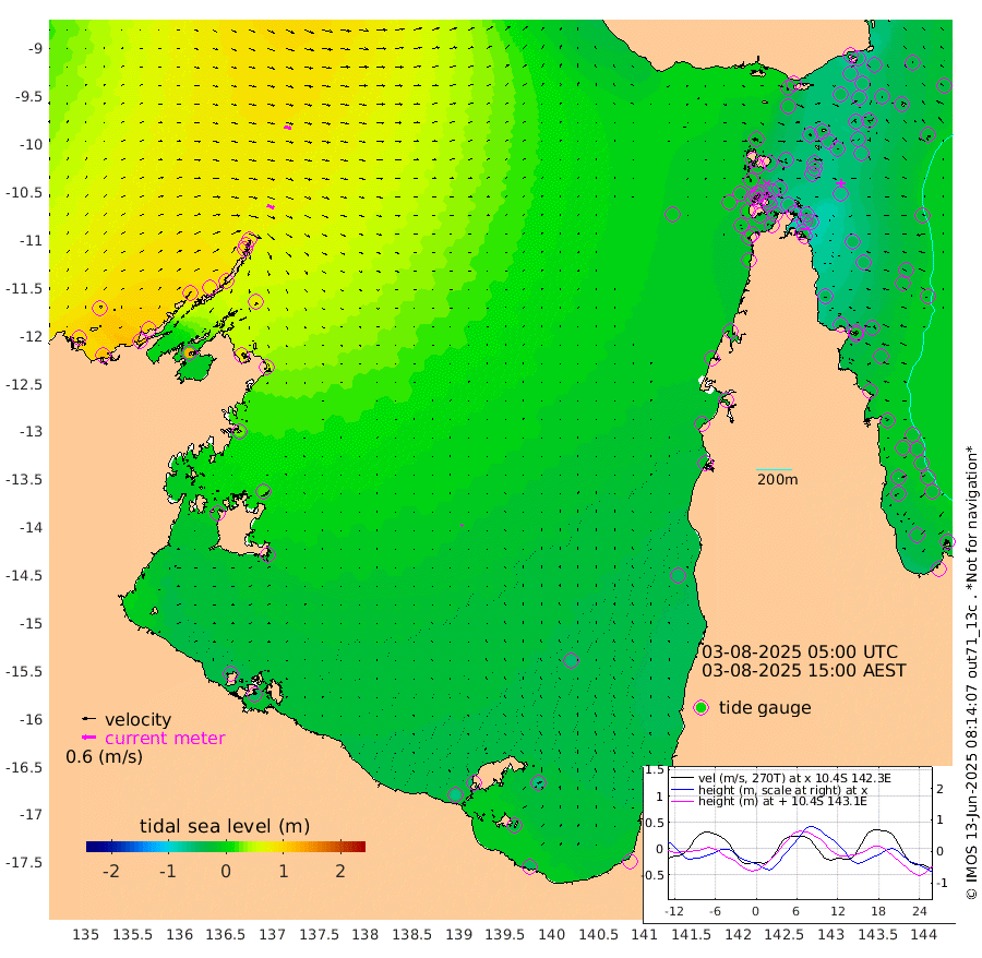 31cm/s 109T +3cm/s rms + 7cm/s -42T. ARA-GOC87 57m 6cm/s 32T +3cm/s rms + 2cm/s -2T. ARA-GOC87 60m 30cm/s 101T +2cm/s rms + 3cm/s 61T. ARA-GOC87 47m -47cm Daru -48cm Bobo Island -24cm Meer Island Barge -36cm Bramble Cay -47cm Unnamed Cay -50cm Pearce Cay -46cm Stephens Island -49cm Merrie England Shoals -57cm Mutacomal Reef -38cm Darnley Island Barge -34cm East Cay -43cm Yorke Island Barge -54cm Rennel Island -53cm Aureed Island -52cm Dungeness Reef -37cm Zagai Island -49cm Yam Island -17cm Dauan Island -20cm Saibai Island -24cm Phipi Reef -42cm Warrior Reef - West -20cm Mabuiag Island Barge -53cm Half Way Island -51cm Coconut Island -61cm Dugong Islet -52cm Poll Island -56cm Kirkcaldie Reef -59cm Suarji Island -45cm Sue Islet -12cm Hawkesbury Island -46cm Alert Patches -50cm Twin Island -5cm Badu Island -44cm St Pauls (Moa Island) -20cm Kubin (Moa Island) -38cm Ince Point -33cm Thursday Island -34cm Nardana Patches -28cm Turtle Head -12cm Round Island -15cm Goods Island -9cm Booby Island -24cm White Rocks Area -12cm Carpentaria -40cm Papou Point -2cm Bampfield Head -2cm Crab Island -20cm Red Wallis Island -27cm Packe Island -65cm Harrington Reef -19cm Herald Camp -16cm Sharp Point -30cm Red Island Point -30cm Possession Island -48cm Alpha Rock -53cm Frederick Point -46cm Wyborn Reef Light -46cm Tetley Island -26cm Triangle Reef -39cm Turtle Head Island -34cm Maclennan Cay -16cm Raine Island -44cm Mcsweeny Reef -39cm Collette Reef -23cm Shadwell Reef -41cm Hannibal Island -38cm Round Point 1cm Vrilya Point -40cm Cape Grenville -33cm Hicks Island -39cm Sir Charles Hardy Island -12cm Harvey Island -34cm Kay Reef -25cm Rocky Island -23cm Chapman Island -22cm Ham Reef -21cm Jubilee Reef -23cm Night Island -26cm Unnamed Reef No. 3 -25cm Morris Island -18cm 1st 3 Mile Opening -25cm Creech Reef -23cm Fife Island -24cm Eden Reef -27cm Stanley Island -34cm Normanby River 97cm Yabooma Island 114cm Hutchison River 101cm Elcho Island 91cm North West Crocodile Island 72cm Cape Wessel 103cm Stevens Island 80cm Guluwuru Island 93cm Hopeful Bay 85cm Auster Point 90cm Two Island Bay 119cm Cadell Strait 127cm Mallison Island 76cm Melville Bay (Gove Harbour) 82cm Truant Island 54cm Cape Arnhem 30cm Cape Grey 20cm Hawk Island 0cm Milner Bay (Groote Eylandt) -17cm Cape Beatrice -49cm West Island -48cm Centre Island -55cm Mornington Island -66cm West Wellesley Islands -64cm Bountiful Island -52cm Albert River Mouth -34cm Sweers Island -53cm Karumba -56cm Nassau River Offshore -48cm Christmas Creek -21cm Archer River -15cm Boyd Point -16cm Weipa (Humbug Point) 5cm Pennefather River -7cm Cullen Point