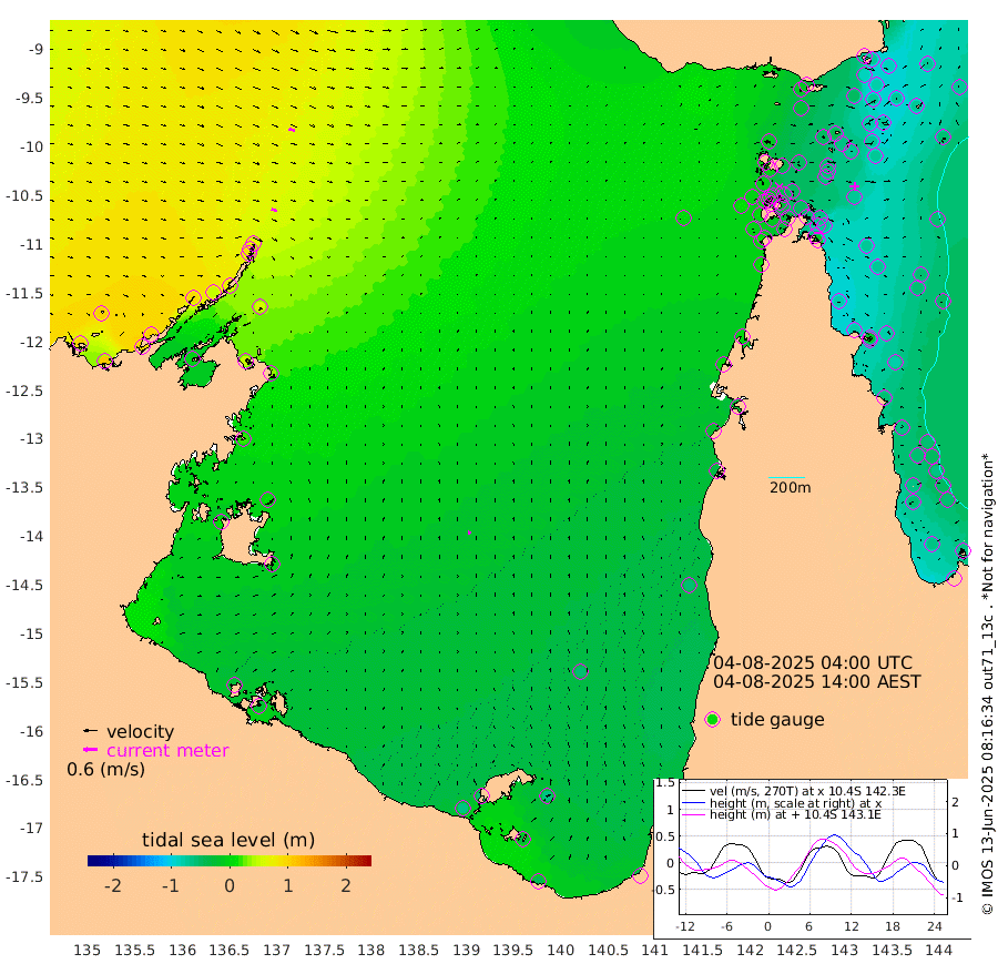 25cm/s 113T +3cm/s rms + 7cm/s -42T. ARA-GOC87 57m 15cm/s 11T +3cm/s rms + 2cm/s -2T. ARA-GOC87 60m 26cm/s 107T +2cm/s rms + 3cm/s 61T. ARA-GOC87 47m -71cm Daru -73cm Bobo Island -56cm Meer Island Barge -73cm Bramble Cay -80cm Unnamed Cay -74cm Pearce Cay -74cm Stephens Island -86cm Merrie England Shoals -85cm Mutacomal Reef -71cm Darnley Island Barge -68cm East Cay -70cm Yorke Island Barge -75cm Rennel Island -73cm Aureed Island -64cm Dungeness Reef -42cm Zagai Island -48cm Yam Island -14cm Dauan Island -27cm Saibai Island -29cm Phipi Reef -48cm Warrior Reef - West -14cm Mabuiag Island Barge -70cm Half Way Island -68cm Coconut Island -73cm Dugong Islet -55cm Poll Island -62cm Kirkcaldie Reef -51cm Suarji Island -57cm Sue Islet -4cm Hawkesbury Island -45cm Alert Patches -45cm Twin Island 2cm Badu Island -33cm St Pauls (Moa Island) -5cm Kubin (Moa Island) -28cm Ince Point -20cm Thursday Island -22cm Nardana Patches -17cm Turtle Head -3cm Round Island -3cm Goods Island 8cm Booby Island -3cm White Rocks Area 4cm Carpentaria -31cm Papou Point 5cm Bampfield Head 12cm Crab Island 0cm Red Wallis Island -13cm Packe Island -77cm Harrington Reef -6cm Herald Camp -13cm Sharp Point -24cm Red Island Point -24cm Possession Island -50cm Alpha Rock -57cm Frederick Point -71cm Wyborn Reef Light -66cm Tetley Island -54cm Triangle Reef -57cm Turtle Head Island -60cm Maclennan Cay -48cm Raine Island -72cm Mcsweeny Reef -74cm Collette Reef -58cm Shadwell Reef -80cm Hannibal Island -75cm Round Point 14cm Vrilya Point -75cm Cape Grenville -64cm Hicks Island -75cm Sir Charles Hardy Island -21cm Harvey Island -75cm Kay Reef -60cm Rocky Island -62cm Chapman Island -58cm Ham Reef -56cm Jubilee Reef -51cm Night Island -61cm Unnamed Reef No. 3 -60cm Morris Island -48cm 1st 3 Mile Opening -57cm Creech Reef -56cm Fife Island -66cm Eden Reef -64cm Stanley Island -71cm Normanby River 105cm Yabooma Island 112cm Hutchison River 103cm Elcho Island 98cm North West Crocodile Island 62cm Cape Wessel 95cm Stevens Island 46cm Guluwuru Island 80cm Hopeful Bay 78cm Auster Point 89cm Two Island Bay 104cm Cadell Strait -7cm Mallison Island 51cm Melville Bay (Gove Harbour) 57cm Truant Island 34cm Cape Arnhem 17cm Cape Grey 10cm Hawk Island 9cm Milner Bay (Groote Eylandt) -7cm Cape Beatrice -25cm West Island -26cm Centre Island -53cm Mornington Island -60cm West Wellesley Islands -65cm Bountiful Island -40cm Albert River Mouth -28cm Sweers Island -45cm Karumba -59cm Nassau River Offshore -58cm Christmas Creek -34cm Archer River -21cm Boyd Point -22cm Weipa (Humbug Point) 4cm Pennefather River 2cm Cullen Point