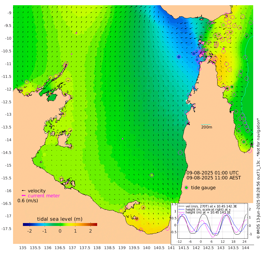 24cm/s 56T +3cm/s rms + 7cm/s -42T. ARA-GOC87 57m 25cm/s -7T +3cm/s rms + 2cm/s -2T. ARA-GOC87 60m 31cm/s 53T +2cm/s rms + 3cm/s 61T. ARA-GOC87 47m 74cm Daru 76cm Bobo Island 14cm Meer Island Barge 47cm Bramble Cay 68cm Unnamed Cay 65cm Pearce Cay 55cm Stephens Island 74cm Merrie England Shoals 82cm Mutacomal Reef 46cm Darnley Island Barge 21cm East Cay 58cm Yorke Island Barge 61cm Rennel Island 61cm Aureed Island 54cm Dungeness Reef 43cm Zagai Island 34cm Yam Island -21cm Dauan Island -10cm Saibai Island 8cm Phipi Reef 35cm Warrior Reef - West -26cm Mabuiag Island Barge 58cm Half Way Island 64cm Coconut Island 57cm Dugong Islet 50cm Poll Island 47cm Kirkcaldie Reef 33cm Suarji Island 48cm Sue Islet -128cm Hawkesbury Island 12cm Alert Patches 19cm Twin Island -102cm Badu Island 15cm St Pauls (Moa Island) -89cm Kubin (Moa Island) -23cm Ince Point -47cm Thursday Island -41cm Nardana Patches -82cm Turtle Head -96cm Round Island -135cm Goods Island -170cm Booby Island -145cm White Rocks Area -165cm Carpentaria 9cm Papou Point -165cm Bampfield Head -142cm Crab Island -157cm Red Wallis Island -112cm Packe Island 72cm Harrington Reef -152cm Herald Camp 14cm Sharp Point -63cm Red Island Point -23cm Possession Island 32cm Alpha Rock 43cm Frederick Point 78cm Wyborn Reef Light 73cm Tetley Island 12cm Triangle Reef 69cm Turtle Head Island 7cm Maclennan Cay -8cm Raine Island 58cm Mcsweeny Reef 53cm Collette Reef 18cm Shadwell Reef 61cm Hannibal Island 47cm Round Point -141cm Vrilya Point 33cm Cape Grenville 23cm Hicks Island 6cm Sir Charles Hardy Island 9cm Harvey Island 22cm Kay Reef 4cm Rocky Island -3cm Chapman Island -8cm Ham Reef -1cm Jubilee Reef 2cm Night Island -6cm Unnamed Reef No. 3 4cm Morris Island -11cm 1st 3 Mile Opening -4cm Creech Reef 9cm Fife Island -2cm Eden Reef 3cm Stanley Island 15cm Normanby River 34cm Yabooma Island 44cm Hutchison River 36cm Elcho Island 38cm North West Crocodile Island 44cm Cape Wessel 65cm Stevens Island 56cm Guluwuru Island 51cm Hopeful Bay 47cm Auster Point 38cm Two Island Bay 63cm Cadell Strait 123cm Mallison Island 57cm Melville Bay (Gove Harbour) 55cm Truant Island 42cm Cape Arnhem 57cm Cape Grey 60cm Hawk Island 73cm Milner Bay (Groote Eylandt) 64cm Cape Beatrice 70cm West Island 68cm Centre Island 78cm Mornington Island 78cm West Wellesley Islands 97cm Bountiful Island 122cm Albert River Mouth 159cm Sweers Island 115cm Karumba 27cm Nassau River Offshore -26cm Christmas Creek -71cm Archer River -97cm Boyd Point -108cm Weipa (Humbug Point) -89cm Pennefather River -137cm Cullen Point