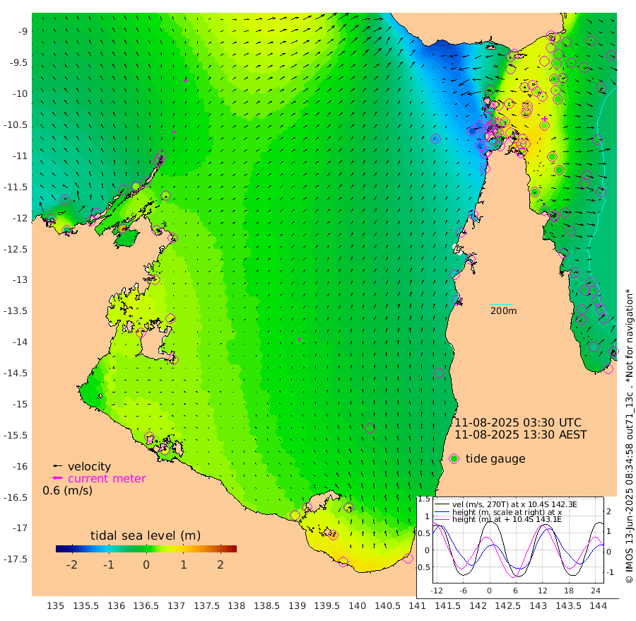 22cm/s 51T +3cm/s rms + 7cm/s -42T. ARA-GOC87 57m 22cm/s 11T +3cm/s rms + 2cm/s -2T. ARA-GOC87 60m 26cm/s 47T +2cm/s rms + 3cm/s 61T. ARA-GOC87 47m 46cm Daru 43cm Bobo Island -29cm Meer Island Barge -10cm Bramble Cay 19cm Unnamed Cay 17cm Pearce Cay 6cm Stephens Island 16cm Merrie England Shoals 40cm Mutacomal Reef 5cm Darnley Island Barge -32cm East Cay 27cm Yorke Island Barge 20cm Rennel Island 32cm Aureed Island 32cm Dungeness Reef 65cm Zagai Island 44cm Yam Island 29cm Dauan Island 45cm Saibai Island 40cm Phipi Reef 56cm Warrior Reef - West 12cm Mabuiag Island Barge 18cm Half Way Island 45cm Coconut Island 24cm Dugong Islet 43cm Poll Island 33cm Kirkcaldie Reef 50cm Suarji Island 53cm Sue Islet -125cm Hawkesbury Island 24cm Alert Patches 28cm Twin Island -85cm Badu Island 39cm St Pauls (Moa Island) -77cm Kubin (Moa Island) -5cm Ince Point -29cm Thursday Island -22cm Nardana Patches -70cm Turtle Head -81cm Round Island -131cm Goods Island -158cm Booby Island -146cm White Rocks Area -126cm Carpentaria 24cm Papou Point -140cm Bampfield Head -131cm Crab Island -149cm Red Wallis Island -107cm Packe Island 41cm Harrington Reef -137cm Herald Camp 27cm Sharp Point -62cm Red Island Point -8cm Possession Island 39cm Alpha Rock 37cm Frederick Point 50cm Wyborn Reef Light 53cm Tetley Island -19cm Triangle Reef 35cm Turtle Head Island -35cm Maclennan Cay -50cm Raine Island 17cm Mcsweeny Reef 10cm Collette Reef -21cm Shadwell Reef 9cm Hannibal Island -13cm Round Point -125cm Vrilya Point -20cm Cape Grenville -27cm Hicks Island -40cm Sir Charles Hardy Island -6cm Harvey Island -36cm Kay Reef -43cm Rocky Island -51cm Chapman Island -51cm Ham Reef -45cm Jubilee Reef -38cm Night Island -52cm Unnamed Reef No. 3 -47cm Morris Island -52cm 1st 3 Mile Opening -50cm Creech Reef -38cm Fife Island -64cm Eden Reef -51cm Stanley Island -52cm Normanby River -64cm Yabooma Island -59cm Hutchison River -53cm Elcho Island -54cm North West Crocodile Island 3cm Cape Wessel -13cm Stevens Island 32cm Guluwuru Island -22cm Hopeful Bay -6cm Auster Point -15cm Two Island Bay -14cm Cadell Strait 132cm Mallison Island 32cm Melville Bay (Gove Harbour) 32cm Truant Island 36cm Cape Arnhem 49cm Cape Grey 52cm Hawk Island 69cm Milner Bay (Groote Eylandt) 55cm Cape Beatrice 72cm West Island 71cm Centre Island 58cm Mornington Island 53cm West Wellesley Islands 58cm Bountiful Island 68cm Albert River Mouth 115cm Sweers Island 64cm Karumba -2cm Nassau River Offshore -45cm Christmas Creek -81cm Archer River -89cm Boyd Point -110cm Weipa (Humbug Point) -81cm Pennefather River -119cm Cullen Point