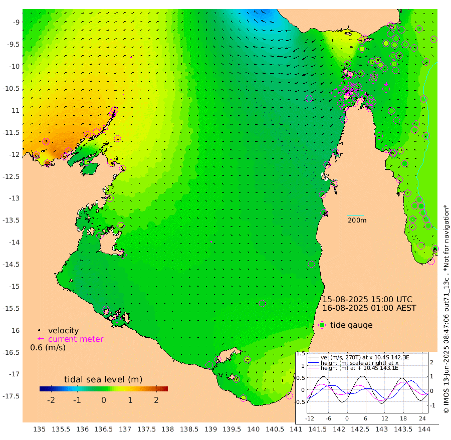 6cm/s 74T +3cm/s rms + 7cm/s -42T. ARA-GOC87 57m 10cm/s -113T +3cm/s rms + 2cm/s -2T. ARA-GOC87 60m 12cm/s 56T +2cm/s rms + 3cm/s 61T. ARA-GOC87 47m 21cm Daru 26cm Bobo Island 21cm Meer Island Barge 21cm Bramble Cay 15cm Unnamed Cay 28cm Pearce Cay 21cm Stephens Island 4cm Merrie England Shoals 9cm Mutacomal Reef 19cm Darnley Island Barge 25cm East Cay 20cm Yorke Island Barge 21cm Rennel Island 24cm Aureed Island 23cm Dungeness Reef 27cm Zagai Island 24cm Yam Island 51cm Dauan Island 39cm Saibai Island 44cm Phipi Reef 39cm Warrior Reef - West 17cm Mabuiag Island Barge 10cm Half Way Island 14cm Coconut Island 14cm Dugong Islet 17cm Poll Island 8cm Kirkcaldie Reef 22cm Suarji Island 12cm Sue Islet 9cm Hawkesbury Island 3cm Alert Patches 6cm Twin Island 13cm Badu Island 11cm St Pauls (Moa Island) 15cm Kubin (Moa Island) 5cm Ince Point -1cm Thursday Island 3cm Nardana Patches 8cm Turtle Head 11cm Round Island 4cm Goods Island -16cm Booby Island -8cm White Rocks Area -54cm Carpentaria 11cm Papou Point -3cm Bampfield Head -25cm Crab Island -17cm Red Wallis Island -1cm Packe Island 10cm Harrington Reef 9cm Herald Camp -5cm Sharp Point 2cm Red Island Point 7cm Possession Island 2cm Alpha Rock 10cm Frederick Point 15cm Wyborn Reef Light 14cm Tetley Island 21cm Triangle Reef 13cm Turtle Head Island 22cm Maclennan Cay 20cm Raine Island 16cm Mcsweeny Reef 14cm Collette Reef 15cm Shadwell Reef 13cm Hannibal Island 20cm Round Point -53cm Vrilya Point 11cm Cape Grenville 24cm Hicks Island 30cm Sir Charles Hardy Island 5cm Harvey Island 11cm Kay Reef 23cm Rocky Island 23cm Chapman Island 20cm Ham Reef 20cm Jubilee Reef 14cm Night Island 16cm Unnamed Reef No. 3 21cm Morris Island 19cm 1st 3 Mile Opening 18cm Creech Reef 26cm Fife Island 25cm Eden Reef 14cm Stanley Island 23cm Normanby River 160cm Yabooma Island 191cm Hutchison River 155cm Elcho Island 151cm North West Crocodile Island 104cm Cape Wessel 132cm Stevens Island 105cm Guluwuru Island 123cm Hopeful Bay 112cm Auster Point 117cm Two Island Bay 163cm Cadell Strait 36cm Mallison Island 100cm Melville Bay (Gove Harbour) 102cm Truant Island 65cm Cape Arnhem 45cm Cape Grey 33cm Hawk Island -1cm Milner Bay (Groote Eylandt) -2cm Cape Beatrice -41cm West Island -49cm Centre Island -4cm Mornington Island -6cm West Wellesley Islands 35cm Bountiful Island 39cm Albert River Mouth 32cm Sweers Island 35cm Karumba -1cm Nassau River Offshore -3cm Christmas Creek -13cm Archer River -12cm Boyd Point -2cm Weipa (Humbug Point) -48cm Pennefather River -31cm Cullen Point