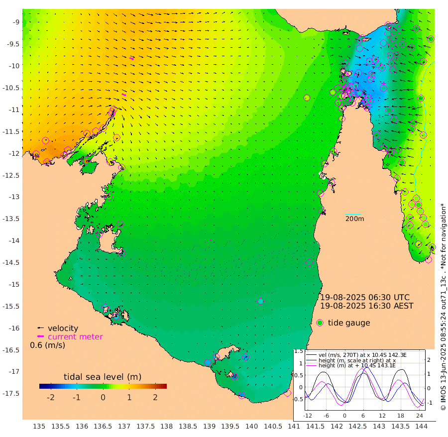 42cm/s 117T +3cm/s rms + 7cm/s -42T. ARA-GOC87 57m 10cm/s 134T +3cm/s rms + 2cm/s -2T. ARA-GOC87 60m 39cm/s 113T +2cm/s rms + 3cm/s 61T. ARA-GOC87 47m -73cm Daru -55cm Bobo Island 18cm Meer Island Barge -9cm Bramble Cay -48cm Unnamed Cay -40cm Pearce Cay -32cm Stephens Island -46cm Merrie England Shoals -78cm Mutacomal Reef -18cm Darnley Island Barge 11cm East Cay -43cm Yorke Island Barge -61cm Rennel Island -52cm Aureed Island -76cm Dungeness Reef -84cm Zagai Island -95cm Yam Island -74cm Dauan Island -66cm Saibai Island -93cm Phipi Reef -93cm Warrior Reef - West -61cm Mabuiag Island Barge -57cm Half Way Island -73cm Coconut Island -73cm Dugong Islet -87cm Poll Island -89cm Kirkcaldie Reef -109cm Suarji Island -81cm Sue Islet 4cm Hawkesbury Island -90cm Alert Patches -89cm Twin Island -5cm Badu Island -97cm St Pauls (Moa Island) -25cm Kubin (Moa Island) -70cm Ince Point -55cm Thursday Island -60cm Nardana Patches -34cm Turtle Head -23cm Round Island 10cm Goods Island 32cm Booby Island 14cm White Rocks Area 43cm Carpentaria -75cm Papou Point 25cm Bampfield Head 27cm Crab Island 20cm Red Wallis Island -15cm Packe Island -86cm Harrington Reef -5cm Herald Camp -41cm Sharp Point -28cm Red Island Point -63cm Possession Island -88cm Alpha Rock -86cm Frederick Point -74cm Wyborn Reef Light -79cm Tetley Island 4cm Triangle Reef -61cm Turtle Head Island 7cm Maclennan Cay 34cm Raine Island -40cm Mcsweeny Reef -29cm Collette Reef 7cm Shadwell Reef -28cm Hannibal Island -10cm Round Point 36cm Vrilya Point -9cm Cape Grenville 2cm Hicks Island 10cm Sir Charles Hardy Island -3cm Harvey Island 13cm Kay Reef 24cm Rocky Island 36cm Chapman Island 36cm Ham Reef 30cm Jubilee Reef 18cm Night Island 33cm Unnamed Reef No. 3 27cm Morris Island 31cm 1st 3 Mile Opening 29cm Creech Reef 23cm Fife Island 47cm Eden Reef 27cm Stanley Island 26cm Normanby River 123cm Yabooma Island 146cm Hutchison River 128cm Elcho Island 113cm North West Crocodile Island 108cm Cape Wessel 119cm Stevens Island 113cm Guluwuru Island 112cm Hopeful Bay 107cm Auster Point 115cm Two Island Bay 153cm Cadell Strait 162cm Mallison Island 92cm Melville Bay (Gove Harbour) 103cm Truant Island 62cm Cape Arnhem 20cm Cape Grey -5cm Hawk Island -41cm Milner Bay (Groote Eylandt) -55cm Cape Beatrice -103cm West Island -102cm Centre Island -116cm Mornington Island -120cm West Wellesley Islands -129cm Bountiful Island -141cm Albert River Mouth -145cm Sweers Island -147cm Karumba -84cm Nassau River Offshore -48cm Christmas Creek 4cm Archer River 15cm Boyd Point 18cm Weipa (Humbug Point) 24cm Pennefather River 26cm Cullen Point