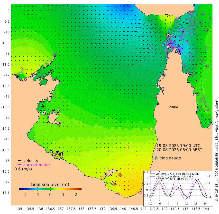 17cm/s -43T +3cm/s rms + 7cm/s -42T. ARA-GOC87 57m 18cm/s -73T +3cm/s rms + 2cm/s -2T. ARA-GOC87 60m 15cm/s -20T +2cm/s rms + 3cm/s 61T. ARA-GOC87 47m -87cm Daru -78cm Bobo Island -12cm Meer Island Barge -34cm Bramble Cay -69cm Unnamed Cay -74cm Pearce Cay -58cm Stephens Island -69cm Merrie England Shoals -93cm Mutacomal Reef -45cm Darnley Island Barge -14cm East Cay -67cm Yorke Island Barge -80cm Rennel Island -72cm Aureed Island -90cm Dungeness Reef -94cm Zagai Island -102cm Yam Island -73cm Dauan Island -71cm Saibai Island -66cm Phipi Reef -88cm Warrior Reef - West -102cm Mabuiag Island Barge -85cm Half Way Island -100cm Coconut Island -96cm Dugong Islet -109cm Poll Island -109cm Kirkcaldie Reef -116cm Suarji Island -104cm Sue Islet -114cm Hawkesbury Island -129cm Alert Patches -129cm Twin Island -107cm Badu Island -133cm St Pauls (Moa Island) -110cm Kubin (Moa Island) -122cm Ince Point -122cm Thursday Island -121cm Nardana Patches -106cm Turtle Head -98cm Round Island -98cm Goods Island -101cm Booby Island -106cm White Rocks Area -103cm Carpentaria -117cm Papou Point -106cm Bampfield Head -83cm Crab Island -103cm Red Wallis Island -104cm Packe Island -114cm Harrington Reef -87cm Herald Camp -36cm Sharp Point -96cm Red Island Point -111cm Possession Island -118cm Alpha Rock -121cm Frederick Point -106cm Wyborn Reef Light -112cm Tetley Island -25cm Triangle Reef -122cm Turtle Head Island -19cm Maclennan Cay 5cm Raine Island -67cm Mcsweeny Reef -50cm Collette Reef -16cm Shadwell Reef -51cm Hannibal Island -40cm Round Point -90cm Vrilya Point -31cm Cape Grenville -21cm Hicks Island -13cm Sir Charles Hardy Island -9cm Harvey Island -13cm Kay Reef 2cm Rocky Island 8cm Chapman Island 7cm Ham Reef 0cm Jubilee Reef -4cm Night Island 3cm Unnamed Reef No. 3 0cm Morris Island -1cm 1st 3 Mile Opening -1cm Creech Reef -1cm Fife Island 14cm Eden Reef 0cm Stanley Island -1cm Normanby River 31cm Yabooma Island 42cm Hutchison River 43cm Elcho Island 40cm North West Crocodile Island 6cm Cape Wessel 21cm Stevens Island 19cm Guluwuru Island 37cm Hopeful Bay 10cm Auster Point 12cm Two Island Bay 31cm Cadell Strait 39cm Mallison Island 18cm Melville Bay (Gove Harbour) 10cm Truant Island 13cm Cape Arnhem 20cm Cape Grey 32cm Hawk Island 37cm Milner Bay (Groote Eylandt) 44cm Cape Beatrice 42cm West Island 45cm Centre Island 105cm Mornington Island 100cm West Wellesley Islands 143cm Bountiful Island 188cm Albert River Mouth 185cm Sweers Island 178cm Karumba 82cm Nassau River Offshore 47cm Christmas Creek 4cm Archer River -24cm Boyd Point -10cm Weipa (Humbug Point) -54cm Pennefather River -60cm Cullen Point