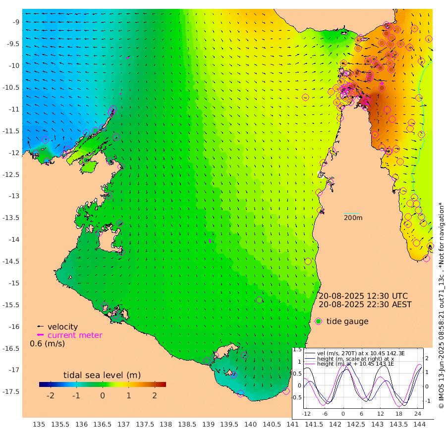 13cm/s -118T +3cm/s rms + 7cm/s -42T. ARA-GOC87 57m 37cm/s 168T +3cm/s rms + 2cm/s -2T. ARA-GOC87 60m 25cm/s -107T +2cm/s rms + 3cm/s 61T. ARA-GOC87 47m 189cm Daru 176cm Bobo Island 90cm Meer Island Barge 126cm Bramble Cay 170cm Unnamed Cay 176cm Pearce Cay 159cm Stephens Island 169cm Merrie England Shoals 194cm Mutacomal Reef 141cm Darnley Island Barge 101cm East Cay 163cm Yorke Island Barge 182cm Rennel Island 172cm Aureed Island 190cm Dungeness Reef 167cm Zagai Island 179cm Yam Island 143cm Dauan Island 127cm Saibai Island 153cm Phipi Reef 180cm Warrior Reef - West 133cm Mabuiag Island Barge 181cm Half Way Island 189cm Coconut Island 198cm Dugong Islet 191cm Poll Island 198cm Kirkcaldie Reef 195cm Suarji Island 180cm Sue Islet 133cm Hawkesbury Island 197cm Alert Patches 195cm Twin Island 127cm Badu Island 194cm St Pauls (Moa Island) 145cm Kubin (Moa Island) 174cm Ince Point 164cm Thursday Island 165cm Nardana Patches 152cm Turtle Head 123cm Round Island 125cm Goods Island 107cm Booby Island 117cm White Rocks Area 81cm Carpentaria 165cm Papou Point 108cm Bampfield Head 84cm Crab Island 114cm Red Wallis Island 143cm Packe Island 214cm Harrington Reef 117cm Herald Camp 53cm Sharp Point 130cm Red Island Point 155cm Possession Island 178cm Alpha Rock 200cm Frederick Point 193cm Wyborn Reef Light 195cm Tetley Island 98cm Triangle Reef 205cm Turtle Head Island 100cm Maclennan Cay 62cm Raine Island 162cm Mcsweeny Reef 143cm Collette Reef 94cm Shadwell Reef 151cm Hannibal Island 133cm Round Point 78cm Vrilya Point 120cm Cape Grenville 108cm Hicks Island 109cm Sir Charles Hardy Island 37cm Harvey Island 97cm Kay Reef 76cm Rocky Island 65cm Chapman Island 63cm Ham Reef 73cm Jubilee Reef 75cm Night Island 69cm Unnamed Reef No. 3 80cm Morris Island 73cm 1st 3 Mile Opening 78cm Creech Reef 82cm Fife Island 73cm Eden Reef 81cm Stanley Island 87cm Normanby River -119cm Yabooma Island -124cm Hutchison River -129cm Elcho Island -124cm North West Crocodile Island -73cm Cape Wessel -109cm Stevens Island -46cm Guluwuru Island -113cm Hopeful Bay -84cm Auster Point -89cm Two Island Bay -99cm Cadell Strait -36cm Mallison Island -51cm Melville Bay (Gove Harbour) -49cm Truant Island -33cm Cape Arnhem -33cm Cape Grey -36cm Hawk Island -59cm Milner Bay (Groote Eylandt) -42cm Cape Beatrice -35cm West Island -42cm Centre Island -27cm Mornington Island -19cm West Wellesley Islands -50cm Bountiful Island -106cm Albert River Mouth -127cm Sweers Island -88cm Karumba 16cm Nassau River Offshore 51cm Christmas Creek 53cm Archer River 66cm Boyd Point 60cm Weipa (Humbug Point) 62cm Pennefather River 68cm Cullen Point