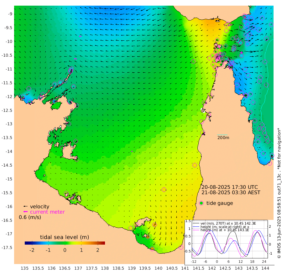 38cm/s -83T +3cm/s rms + 7cm/s -42T. ARA-GOC87 57m 17cm/s -122T +3cm/s rms + 2cm/s -2T. ARA-GOC87 60m 36cm/s -88T +2cm/s rms + 3cm/s 61T. ARA-GOC87 47m -103cm Daru -116cm Bobo Island -79cm Meer Island Barge -104cm Bramble Cay -118cm Unnamed Cay -121cm Pearce Cay -117cm Stephens Island -127cm Merrie England Shoals -116cm Mutacomal Reef -106cm Darnley Island Barge -87cm East Cay -106cm Yorke Island Barge -109cm Rennel Island -106cm Aureed Island -85cm Dungeness Reef -39cm Zagai Island -40cm Yam Island 57cm Dauan Island 45cm Saibai Island 49cm Phipi Reef -18cm Warrior Reef - West 24cm Mabuiag Island Barge -117cm Half Way Island -98cm Coconut Island -111cm Dugong Islet -75cm Poll Island -78cm Kirkcaldie Reef -39cm Suarji Island -67cm Sue Islet 29cm Hawkesbury Island -40cm Alert Patches -51cm Twin Island 46cm Badu Island -36cm St Pauls (Moa Island) 13cm Kubin (Moa Island) -16cm Ince Point -5cm Thursday Island -5cm Nardana Patches 21cm Turtle Head 24cm Round Island 39cm Goods Island 48cm Booby Island 32cm White Rocks Area 21cm Carpentaria -38cm Papou Point 30cm Bampfield Head 49cm Crab Island 41cm Red Wallis Island 23cm Packe Island -126cm Harrington Reef 49cm Herald Camp -3cm Sharp Point 14cm Red Island Point -21cm Possession Island -60cm Alpha Rock -81cm Frederick Point -118cm Wyborn Reef Light -110cm Tetley Island -65cm Triangle Reef -139cm Turtle Head Island -74cm Maclennan Cay -52cm Raine Island -110cm Mcsweeny Reef -100cm Collette Reef -69cm Shadwell Reef -115cm Hannibal Island -111cm Round Point 34cm Vrilya Point -98cm Cape Grenville -87cm Hicks Island -76cm Sir Charles Hardy Island -30cm Harvey Island -88cm Kay Reef -65cm Rocky Island -57cm Chapman Island -56cm Ham Reef -64cm Jubilee Reef -62cm Night Island -59cm Unnamed Reef No. 3 -71cm Morris Island -58cm 1st 3 Mile Opening -65cm Creech Reef -72cm Fife Island -78cm Eden Reef -75cm Stanley Island -93cm Normanby River -67cm Yabooma Island -74cm Hutchison River -58cm Elcho Island -51cm North West Crocodile Island -94cm Cape Wessel -88cm Stevens Island -91cm Guluwuru Island -68cm Hopeful Bay -88cm Auster Point -92cm Two Island Bay -97cm Cadell Strait -138cm Mallison Island -76cm Melville Bay (Gove Harbour) -89cm Truant Island -53cm Cape Arnhem -31cm Cape Grey -13cm Hawk Island 2cm Milner Bay (Groote Eylandt) 18cm Cape Beatrice 35cm West Island 39cm Centre Island 93cm Mornington Island 85cm West Wellesley Islands 122cm Bountiful Island 156cm Albert River Mouth 135cm Sweers Island 158cm Karumba 96cm Nassau River Offshore 85cm Christmas Creek 63cm Archer River 49cm Boyd Point 68cm Weipa (Humbug Point) 29cm Pennefather River 49cm Cullen Point