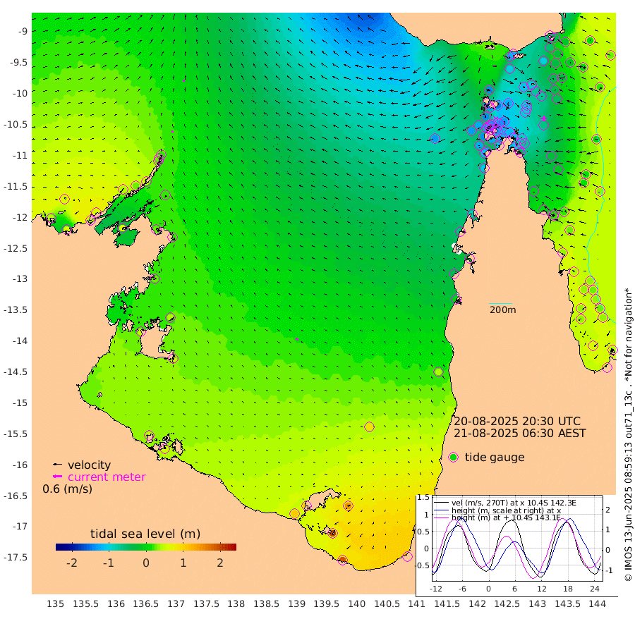 13cm/s -18T +3cm/s rms + 7cm/s -42T. ARA-GOC87 57m 20cm/s -57T +3cm/s rms + 2cm/s -2T. ARA-GOC87 60m 15cm/s 11T +2cm/s rms + 3cm/s 61T. ARA-GOC87 47m -58cm Daru -44cm Bobo Island 22cm Meer Island Barge 10cm Bramble Cay -27cm Unnamed Cay -33cm Pearce Cay -15cm Stephens Island -18cm Merrie England Shoals -55cm Mutacomal Reef -7cm Darnley Island Barge 25cm East Cay -35cm Yorke Island Barge -44cm Rennel Island -41cm Aureed Island -69cm Dungeness Reef -104cm Zagai Island -109cm Yam Island -123cm Dauan Island -118cm Saibai Island -101cm Phipi Reef -104cm Warrior Reef - West -136cm Mabuiag Island Barge -47cm Half Way Island -75cm Coconut Island -65cm Dugong Islet -98cm Poll Island -93cm Kirkcaldie Reef -123cm Suarji Island -98cm Sue Islet -141cm Hawkesbury Island -133cm Alert Patches -130cm Twin Island -140cm Badu Island -145cm St Pauls (Moa Island) -135cm Kubin (Moa Island) -136cm Ince Point -140cm Thursday Island -139cm Nardana Patches -127cm Turtle Head -125cm Round Island -122cm Goods Island -129cm Booby Island -125cm White Rocks Area -128cm Carpentaria -125cm Papou Point -136cm Bampfield Head -106cm Crab Island -127cm Red Wallis Island -124cm Packe Island -79cm Harrington Reef -121cm Herald Camp -42cm Sharp Point -112cm Red Island Point -122cm Possession Island -115cm Alpha Rock -109cm Frederick Point -74cm Wyborn Reef Light -87cm Tetley Island -1cm Triangle Reef -84cm Turtle Head Island 11cm Maclennan Cay 33cm Raine Island -29cm Mcsweeny Reef -12cm Collette Reef 15cm Shadwell Reef -6cm Hannibal Island 7cm Round Point -107cm Vrilya Point 12cm Cape Grenville 16cm Hicks Island 18cm Sir Charles Hardy Island 3cm Harvey Island 30cm Kay Reef 34cm Rocky Island 40cm Chapman Island 35cm Ham Reef 30cm Jubilee Reef 26cm Night Island 35cm Unnamed Reef No. 3 35cm Morris Island 29cm 1st 3 Mile Opening 32cm Creech Reef 34cm Fife Island 56cm Eden Reef 39cm Stanley Island 45cm Normanby River 50cm Yabooma Island 60cm Hutchison River 59cm Elcho Island 56cm North West Crocodile Island 20cm Cape Wessel 43cm Stevens Island 29cm Guluwuru Island 57cm Hopeful Bay 27cm Auster Point 26cm Two Island Bay 48cm Cadell Strait 62cm Mallison Island 27cm Melville Bay (Gove Harbour) 19cm Truant Island 18cm Cape Arnhem 26cm Cape Grey 39cm Hawk Island 48cm Milner Bay (Groote Eylandt) 53cm Cape Beatrice 52cm West Island 56cm Centre Island 113cm Mornington Island 110cm West Wellesley Islands 147cm Bountiful Island 195cm Albert River Mouth 198cm Sweers Island 183cm Karumba 85cm Nassau River Offshore 43cm Christmas Creek -3cm Archer River -41cm Boyd Point -27cm Weipa (Humbug Point) -61cm Pennefather River -84cm Cullen Point