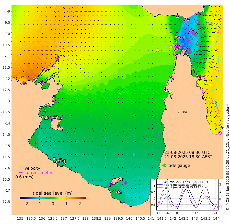 35cm/s 122T +3cm/s rms + 7cm/s -42T. ARA-GOC87 57m 12cm/s 147T +3cm/s rms + 2cm/s -2T. ARA-GOC87 60m 33cm/s 119T +2cm/s rms + 3cm/s 61T. ARA-GOC87 47m -42cm Daru -22cm Bobo Island 60cm Meer Island Barge 44cm Bramble Cay 4cm Unnamed Cay 3cm Pearce Cay 16cm Stephens Island 13cm Merrie England Shoals -31cm Mutacomal Reef 25cm Darnley Island Barge 61cm East Cay -7cm Yorke Island Barge -17cm Rennel Island -20cm Aureed Island -49cm Dungeness Reef -92cm Zagai Island -91cm Yam Island -106cm Dauan Island -95cm Saibai Island -118cm Phipi Reef -103cm Warrior Reef - West -70cm Mabuiag Island Barge -15cm Half Way Island -46cm Coconut Island -33cm Dugong Islet -69cm Poll Island -66cm Kirkcaldie Reef -102cm Suarji Island -67cm Sue Islet 39cm Hawkesbury Island -75cm Alert Patches -75cm Twin Island 5cm Badu Island -96cm St Pauls (Moa Island) -6cm Kubin (Moa Island) -60cm Ince Point -43cm Thursday Island -49cm Nardana Patches -16cm Turtle Head 2cm Round Island 39cm Goods Island 62cm Booby Island 52cm White Rocks Area 66cm Carpentaria -70cm Papou Point 66cm Bampfield Head 44cm Crab Island 50cm Red Wallis Island 12cm Packe Island -46cm Harrington Reef 29cm Herald Camp -47cm Sharp Point -12cm Red Island Point -47cm Possession Island -68cm Alpha Rock -63cm Frederick Point -34cm Wyborn Reef Light -45cm Tetley Island 40cm Triangle Reef -18cm Turtle Head Island 51cm Maclennan Cay 73cm Raine Island 4cm Mcsweeny Reef 17cm Collette Reef 49cm Shadwell Reef 24cm Hannibal Island 48cm Round Point 52cm Vrilya Point 47cm Cape Grenville 50cm Hicks Island 62cm Sir Charles Hardy Island 12cm Harvey Island 72cm Kay Reef 71cm Rocky Island 84cm Chapman Island 81cm Ham Reef 74cm Jubilee Reef 58cm Night Island 80cm Unnamed Reef No. 3 76cm Morris Island 74cm 1st 3 Mile Opening 74cm Creech Reef 66cm Fife Island 103cm Eden Reef 81cm Stanley Island 87cm Normanby River 156cm Yabooma Island 174cm Hutchison River 151cm Elcho Island 137cm North West Crocodile Island 121cm Cape Wessel 140cm Stevens Island 108cm Guluwuru Island 137cm Hopeful Bay 124cm Auster Point 129cm Two Island Bay 156cm Cadell Strait 150cm Mallison Island 90cm Melville Bay (Gove Harbour) 101cm Truant Island 54cm Cape Arnhem 12cm Cape Grey -12cm Hawk Island -54cm Milner Bay (Groote Eylandt) -65cm Cape Beatrice -115cm West Island -115cm Centre Island -136cm Mornington Island -132cm West Wellesley Islands -143cm Bountiful Island -174cm Albert River Mouth -180cm Sweers Island -177cm Karumba -92cm Nassau River Offshore -47cm Christmas Creek 15cm Archer River 28cm Boyd Point 35cm Weipa (Humbug Point) 31cm Pennefather River 43cm Cullen Point
