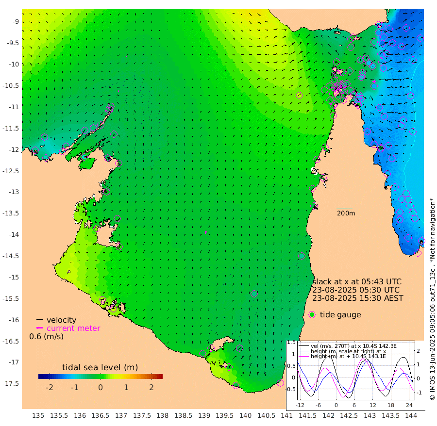 6cm/s -50T +3cm/s rms + 7cm/s -42T. ARA-GOC87 57m 28cm/s 19T +3cm/s rms + 2cm/s -2T. ARA-GOC87 60m 2cm/s -157T +2cm/s rms + 3cm/s 61T. ARA-GOC87 47m -124cm Daru -132cm Bobo Island -113cm Meer Island Barge -140cm Bramble Cay -137cm Unnamed Cay -149cm Pearce Cay -140cm Stephens Island -146cm Merrie England Shoals -133cm Mutacomal Reef -128cm Darnley Island Barge -132cm East Cay -120cm Yorke Island Barge -133cm Rennel Island -125cm Aureed Island -112cm Dungeness Reef -55cm Zagai Island -62cm Yam Island -24cm Dauan Island -10cm Saibai Island -50cm Phipi Reef -71cm Warrior Reef - West -2cm Mabuiag Island Barge -126cm Half Way Island -110cm Coconut Island -120cm Dugong Islet -87cm Poll Island -94cm Kirkcaldie Reef -56cm Suarji Island -70cm Sue Islet -29cm Hawkesbury Island -56cm Alert Patches -59cm Twin Island -20cm Badu Island -41cm St Pauls (Moa Island) -30cm Kubin (Moa Island) -37cm Ince Point -27cm Thursday Island -29cm Nardana Patches -37cm Turtle Head -16cm Round Island -28cm Goods Island -1cm Booby Island -16cm White Rocks Area 48cm Carpentaria -39cm Papou Point 10cm Bampfield Head 0cm Crab Island -11cm Red Wallis Island -40cm Packe Island -124cm Harrington Reef -13cm Herald Camp -2cm Sharp Point -39cm Red Island Point -33cm Possession Island -54cm Alpha Rock -86cm Frederick Point -117cm Wyborn Reef Light -107cm Tetley Island -102cm Triangle Reef -121cm Turtle Head Island -111cm Maclennan Cay -102cm Raine Island -129cm Mcsweeny Reef -127cm Collette Reef -108cm Shadwell Reef -141cm Hannibal Island -148cm Round Point 15cm Vrilya Point -130cm Cape Grenville -126cm Hicks Island -126cm Sir Charles Hardy Island -39cm Harvey Island -128cm Kay Reef -114cm Rocky Island -116cm Chapman Island -105cm Ham Reef -108cm Jubilee Reef -103cm Night Island -111cm Unnamed Reef No. 3 -119cm Morris Island -101cm 1st 3 Mile Opening -111cm Creech Reef -125cm Fife Island -136cm Eden Reef -120cm Stanley Island -139cm Normanby River -63cm Yabooma Island -85cm Hutchison River -58cm Elcho Island -57cm North West Crocodile Island -35cm Cape Wessel -57cm Stevens Island -53cm Guluwuru Island -53cm Hopeful Bay -39cm Auster Point -36cm Two Island Bay -88cm Cadell Strait -90cm Mallison Island -45cm Melville Bay (Gove Harbour) -43cm Truant Island -26cm Cape Arnhem -8cm Cape Grey -9cm Hawk Island 33cm Milner Bay (Groote Eylandt) 16cm Cape Beatrice 47cm West Island 51cm Centre Island -29cm Mornington Island -31cm West Wellesley Islands -41cm Bountiful Island -36cm Albert River Mouth -16cm Sweers Island -47cm Karumba -67cm Nassau River Offshore -72cm Christmas Creek -51cm Archer River -26cm Boyd Point -38cm Weipa (Humbug Point) -7cm Pennefather River 7cm Cullen Point