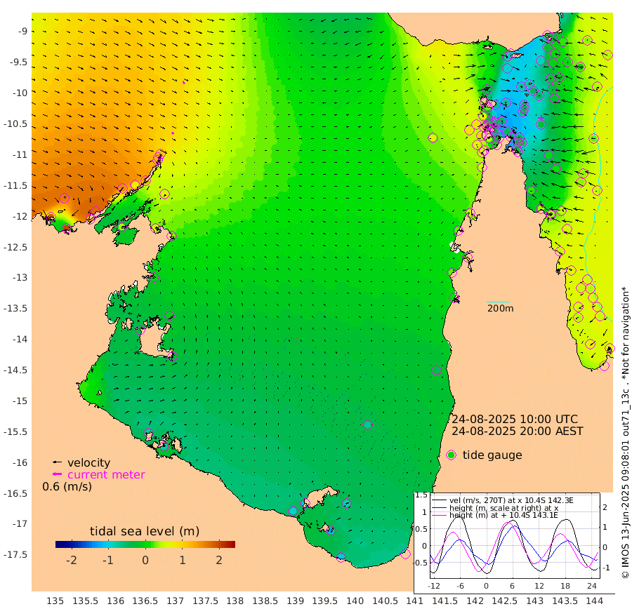 15cm/s 145T +3cm/s rms + 7cm/s -42T. ARA-GOC87 57m 1cm/s 138T +3cm/s rms + 2cm/s -2T. ARA-GOC87 60m 17cm/s 140T +2cm/s rms + 3cm/s 61T. ARA-GOC87 47m -37cm Daru -29cm Bobo Island 38cm Meer Island Barge 33cm Bramble Cay 7cm Unnamed Cay -7cm Pearce Cay 7cm Stephens Island 16cm Merrie England Shoals -16cm Mutacomal Reef 7cm Darnley Island Barge 41cm East Cay -16cm Yorke Island Barge -12cm Rennel Island -28cm Aureed Island -40cm Dungeness Reef -80cm Zagai Island -69cm Yam Island -85cm Dauan Island -82cm Saibai Island -94cm Phipi Reef -89cm Warrior Reef - West -41cm Mabuiag Island Barge -15cm Half Way Island -40cm Coconut Island -26cm Dugong Islet -52cm Poll Island -52cm Kirkcaldie Reef -70cm Suarji Island -56cm Sue Islet 70cm Hawkesbury Island -45cm Alert Patches -50cm Twin Island 32cm Badu Island -67cm St Pauls (Moa Island) 24cm Kubin (Moa Island) -31cm Ince Point -13cm Thursday Island -19cm Nardana Patches 15cm Turtle Head 40cm Round Island 67cm Goods Island 86cm Booby Island 87cm White Rocks Area 69cm Carpentaria -49cm Papou Point 101cm Bampfield Head 57cm Crab Island 75cm Red Wallis Island 41cm Packe Island -38cm Harrington Reef 64cm Herald Camp -38cm Sharp Point 6cm Red Island Point -19cm Possession Island -40cm Alpha Rock -46cm Frederick Point -20cm Wyborn Reef Light -28cm Tetley Island 25cm Triangle Reef -14cm Turtle Head Island 34cm Maclennan Cay 52cm Raine Island 0cm Mcsweeny Reef 10cm Collette Reef 34cm Shadwell Reef 17cm Hannibal Island 38cm Round Point 53cm Vrilya Point 38cm Cape Grenville 35cm Hicks Island 46cm Sir Charles Hardy Island 8cm Harvey Island 57cm Kay Reef 52cm Rocky Island 62cm Chapman Island 57cm Ham Reef 51cm Jubilee Reef 40cm Night Island 57cm Unnamed Reef No. 3 56cm Morris Island 55cm 1st 3 Mile Opening 51cm Creech Reef 43cm Fife Island 74cm Eden Reef 61cm Stanley Island 66cm Normanby River 187cm Yabooma Island 196cm Hutchison River 174cm Elcho Island 164cm North West Crocodile Island 107cm Cape Wessel 153cm Stevens Island 69cm Guluwuru Island 150cm Hopeful Bay 123cm Auster Point 122cm Two Island Bay 132cm Cadell Strait 42cm Mallison Island 68cm Melville Bay (Gove Harbour) 74cm Truant Island 32cm Cape Arnhem 7cm Cape Grey -6cm Hawk Island -32cm Milner Bay (Groote Eylandt) -40cm Cape Beatrice -78cm West Island -81cm Centre Island -104cm Mornington Island -95cm West Wellesley Islands -90cm Bountiful Island -108cm Albert River Mouth -114cm Sweers Island -117cm Karumba -72cm Nassau River Offshore -40cm Christmas Creek 14cm Archer River 26cm Boyd Point 40cm Weipa (Humbug Point) 24cm Pennefather River 49cm Cullen Point