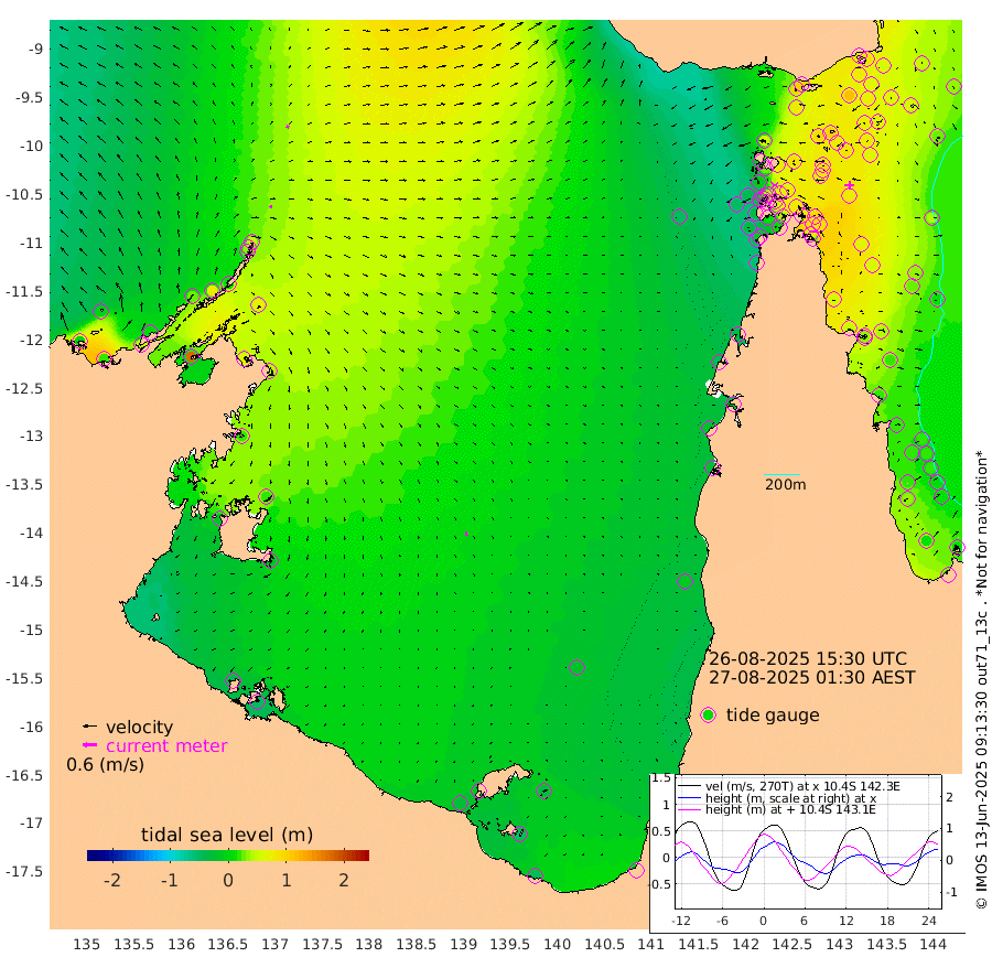 10cm/s 62T +3cm/s rms + 7cm/s -42T. ARA-GOC87 57m 18cm/s 175T +3cm/s rms + 2cm/s -2T. ARA-GOC87 60m 11cm/s 23T +2cm/s rms + 3cm/s 61T. ARA-GOC87 47m 88cm Daru 88cm Bobo Island 29cm Meer Island Barge 46cm Bramble Cay 65cm Unnamed Cay 74cm Pearce Cay 62cm Stephens Island 57cm Merrie England Shoals 82cm Mutacomal Reef 58cm Darnley Island Barge 34cm East Cay 73cm Yorke Island Barge 74cm Rennel Island 82cm Aureed Island 79cm Dungeness Reef 101cm Zagai Island 95cm Yam Island 99cm Dauan Island 98cm Saibai Island 80cm Phipi Reef 113cm Warrior Reef - West 55cm Mabuiag Island Barge 67cm Half Way Island 84cm Coconut Island 77cm Dugong Islet 87cm Poll Island 75cm Kirkcaldie Reef 84cm Suarji Island 85cm Sue Islet -8cm Hawkesbury Island 61cm Alert Patches 73cm Twin Island 1cm Badu Island 80cm St Pauls (Moa Island) 24cm Kubin (Moa Island) 51cm Ince Point 33cm Thursday Island 39cm Nardana Patches 16cm Turtle Head 6cm Round Island -21cm Goods Island -48cm Booby Island -40cm White Rocks Area -46cm Carpentaria 66cm Papou Point -33cm Bampfield Head -46cm Crab Island -31cm Red Wallis Island 9cm Packe Island 83cm Harrington Reef -8cm Herald Camp 26cm Sharp Point 6cm Red Island Point 38cm Possession Island 79cm Alpha Rock 82cm Frederick Point 89cm Wyborn Reef Light 93cm Tetley Island 41cm Triangle Reef 71cm Turtle Head Island 31cm Maclennan Cay 9cm Raine Island 64cm Mcsweeny Reef 54cm Collette Reef 29cm Shadwell Reef 55cm Hannibal Island 47cm Round Point -58cm Vrilya Point 35cm Cape Grenville 35cm Hicks Island 43cm Sir Charles Hardy Island 12cm Harvey Island 22cm Kay Reef 19cm Rocky Island 16cm Chapman Island 16cm Ham Reef 17cm Jubilee Reef 19cm Night Island 16cm Unnamed Reef No. 3 17cm Morris Island 6cm 1st 3 Mile Opening 14cm Creech Reef 31cm Fife Island 13cm Eden Reef 11cm Stanley Island 19cm Normanby River -2cm Yabooma Island 16cm Hutchison River 2cm Elcho Island 0cm North West Crocodile Island 49cm Cape Wessel 24cm Stevens Island 77cm Guluwuru Island 14cm Hopeful Bay 26cm Auster Point 36cm Two Island Bay 54cm Cadell Strait 174cm Mallison Island 61cm Melville Bay (Gove Harbour) 68cm Truant Island 50cm Cape Arnhem 19cm Cape Grey 17cm Hawk Island -19cm Milner Bay (Groote Eylandt) -18cm Cape Beatrice -40cm West Island -48cm Centre Island -21cm Mornington Island -24cm West Wellesley Islands -34cm Bountiful Island -45cm Albert River Mouth -59cm Sweers Island -44cm Karumba -16cm Nassau River Offshore -8cm Christmas Creek -28cm Archer River -17cm Boyd Point -28cm Weipa (Humbug Point) -47cm Pennefather River -35cm Cullen Point