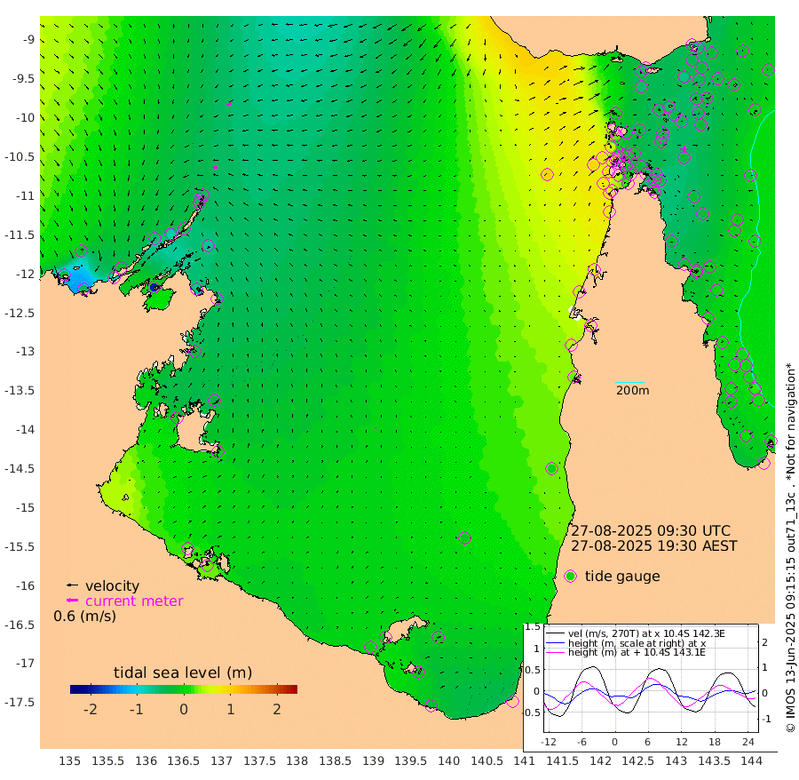 24cm/s -96T +3cm/s rms + 7cm/s -42T. ARA-GOC87 57m 3cm/s 35T +3cm/s rms + 2cm/s -2T. ARA-GOC87 60m 25cm/s -115T +2cm/s rms + 3cm/s 61T. ARA-GOC87 47m -49cm Daru -53cm Bobo Island -5cm Meer Island Barge -19cm Bramble Cay -26cm Unnamed Cay -39cm Pearce Cay -25cm Stephens Island -24cm Merrie England Shoals -39cm Mutacomal Reef -24cm Darnley Island Barge -10cm East Cay -34cm Yorke Island Barge -31cm Rennel Island -41cm Aureed Island -35cm Dungeness Reef -57cm Zagai Island -44cm Yam Island -52cm Dauan Island -53cm Saibai Island -54cm Phipi Reef -65cm Warrior Reef - West -12cm Mabuiag Island Barge -25cm Half Way Island -44cm Coconut Island -26cm Dugong Islet -39cm Poll Island -31cm Kirkcaldie Reef -28cm Suarji Island -38cm Sue Islet 56cm Hawkesbury Island -12cm Alert Patches -22cm Twin Island 36cm Badu Island -26cm St Pauls (Moa Island) 29cm Kubin (Moa Island) 0cm Ince Point 17cm Thursday Island 11cm Nardana Patches 33cm Turtle Head 39cm Round Island 68cm Goods Island 94cm Booby Island 90cm White Rocks Area 98cm Carpentaria -21cm Papou Point 90cm Bampfield Head 69cm Crab Island 80cm Red Wallis Island 42cm Packe Island -34cm Harrington Reef 64cm Herald Camp -14cm Sharp Point 22cm Red Island Point 4cm Possession Island -25cm Alpha Rock -32cm Frederick Point -44cm Wyborn Reef Light -46cm Tetley Island -14cm Triangle Reef -30cm Turtle Head Island 0cm Maclennan Cay 6cm Raine Island -27cm Mcsweeny Reef -24cm Collette Reef -7cm Shadwell Reef -24cm Hannibal Island -20cm Round Point 76cm Vrilya Point -6cm Cape Grenville -9cm Hicks Island -3cm Sir Charles Hardy Island -3cm Harvey Island 2cm Kay Reef 2cm Rocky Island 2cm Chapman Island 5cm Ham Reef 4cm Jubilee Reef 0cm Night Island 4cm Unnamed Reef No. 3 5cm Morris Island 17cm 1st 3 Mile Opening 8cm Creech Reef -10cm Fife Island 8cm Eden Reef 11cm Stanley Island 5cm Normanby River -21cm Yabooma Island -42cm Hutchison River -30cm Elcho Island -28cm North West Crocodile Island -52cm Cape Wessel -53cm Stevens Island -78cm Guluwuru Island -43cm Hopeful Bay -42cm Auster Point -48cm Two Island Bay -87cm Cadell Strait -192cm Mallison Island -68cm Melville Bay (Gove Harbour) -72cm Truant Island -54cm Cape Arnhem -30cm Cape Grey -34cm Hawk Island -5cm Milner Bay (Groote Eylandt) -1cm Cape Beatrice 23cm West Island 23cm Centre Island -18cm Mornington Island -4cm West Wellesley Islands -4cm Bountiful Island -23cm Albert River Mouth -28cm Sweers Island -30cm Karumba -10cm Nassau River Offshore 2cm Christmas Creek 28cm Archer River 39cm Boyd Point 47cm Weipa (Humbug Point) 45cm Pennefather River 63cm Cullen Point