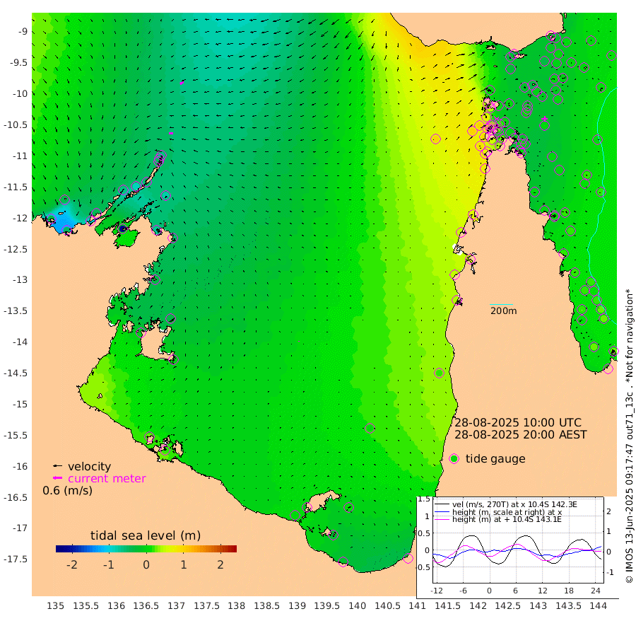 27cm/s -96T +3cm/s rms + 7cm/s -42T. ARA-GOC87 57m 3cm/s 160T +3cm/s rms + 2cm/s -2T. ARA-GOC87 60m 28cm/s -111T +2cm/s rms + 3cm/s 61T. ARA-GOC87 47m -17cm Daru -20cm Bobo Island 12cm Meer Island Barge 4cm Bramble Cay 1cm Unnamed Cay -5cm Pearce Cay 3cm Stephens Island 3cm Merrie England Shoals -9cm Mutacomal Reef 1cm Darnley Island Barge 11cm East Cay -6cm Yorke Island Barge 0cm Rennel Island -9cm Aureed Island -2cm Dungeness Reef -30cm Zagai Island -16cm Yam Island -30cm Dauan Island -35cm Saibai Island -26cm Phipi Reef -35cm Warrior Reef - West 5cm Mabuiag Island Barge 5cm Half Way Island -12cm Coconut Island 7cm Dugong Islet -8cm Poll Island 1cm Kirkcaldie Reef 4cm Suarji Island -11cm Sue Islet 70cm Hawkesbury Island 17cm Alert Patches 7cm Twin Island 50cm Badu Island 2cm St Pauls (Moa Island) 46cm Kubin (Moa Island) 23cm Ince Point 37cm Thursday Island 32cm Nardana Patches 52cm Turtle Head 50cm Round Island 80cm Goods Island 101cm Booby Island 100cm White Rocks Area 96cm Carpentaria 4cm Papou Point 94cm Bampfield Head 74cm Crab Island 88cm Red Wallis Island 58cm Packe Island 3cm Harrington Reef 73cm Herald Camp -7cm Sharp Point 42cm Red Island Point 25cm Possession Island -1cm Alpha Rock -1cm Frederick Point -14cm Wyborn Reef Light -17cm Tetley Island 4cm Triangle Reef 3cm Turtle Head Island 18cm Maclennan Cay 18cm Raine Island 1cm Mcsweeny Reef 0cm Collette Reef 9cm Shadwell Reef 1cm Hannibal Island 4cm Round Point 78cm Vrilya Point 15cm Cape Grenville 12cm Hicks Island 16cm Sir Charles Hardy Island 4cm Harvey Island 19cm Kay Reef 17cm Rocky Island 15cm Chapman Island 17cm Ham Reef 18cm Jubilee Reef 14cm Night Island 18cm Unnamed Reef No. 3 20cm Morris Island 29cm 1st 3 Mile Opening 23cm Creech Reef 8cm Fife Island 23cm Eden Reef 25cm Stanley Island 23cm Normanby River -32cm Yabooma Island -51cm Hutchison River -42cm Elcho Island -38cm North West Crocodile Island -61cm Cape Wessel -66cm Stevens Island -84cm Guluwuru Island -56cm Hopeful Bay -51cm Auster Point -58cm Two Island Bay -92cm Cadell Strait -214cm Mallison Island -73cm Melville Bay (Gove Harbour) -78cm Truant Island -58cm Cape Arnhem -31cm Cape Grey -35cm Hawk Island -11cm Milner Bay (Groote Eylandt) -3cm Cape Beatrice 23cm West Island 21cm Centre Island -8cm Mornington Island 6cm West Wellesley Islands 8cm Bountiful Island -17cm Albert River Mouth -23cm Sweers Island -20cm Karumba 6cm Nassau River Offshore 18cm Christmas Creek 38cm Archer River 46cm Boyd Point 55cm Weipa (Humbug Point) 48cm Pennefather River 65cm Cullen Point