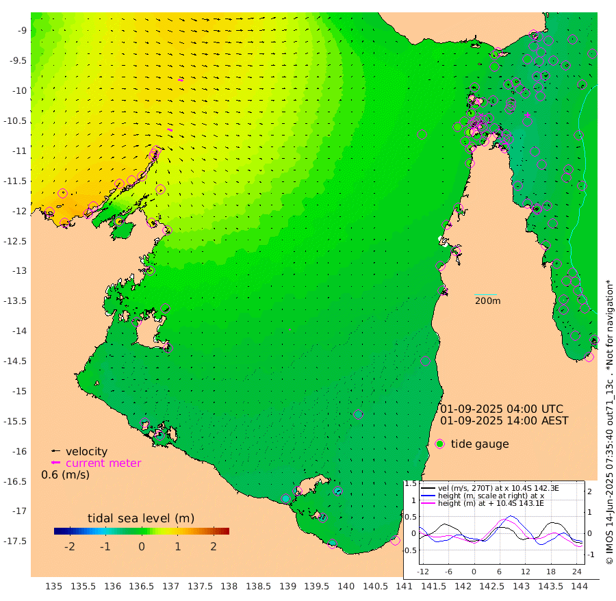36cm/s 112T +3cm/s rms + 7cm/s -42T. ARA-GOC87 57m 7cm/s 42T +3cm/s rms + 2cm/s -2T. ARA-GOC87 60m 34cm/s 105T +2cm/s rms + 3cm/s 61T. ARA-GOC87 47m -29cm Daru -32cm Bobo Island -21cm Meer Island Barge -32cm Bramble Cay -36cm Unnamed Cay -36cm Pearce Cay -35cm Stephens Island -42cm Merrie England Shoals -42cm Mutacomal Reef -30cm Darnley Island Barge -32cm East Cay -30cm Yorke Island Barge -38cm Rennel Island -36cm Aureed Island -29cm Dungeness Reef -7cm Zagai Island -15cm Yam Island 17cm Dauan Island 8cm Saibai Island 6cm Phipi Reef -11cm Warrior Reef - West 7cm Mabuiag Island Barge -35cm Half Way Island -29cm Coconut Island -38cm Dugong Islet -24cm Poll Island -29cm Kirkcaldie Reef -25cm Suarji Island -22cm Sue Islet 15cm Hawkesbury Island -19cm Alert Patches -19cm Twin Island 24cm Badu Island -9cm St Pauls (Moa Island) 15cm Kubin (Moa Island) -7cm Ince Point -2cm Thursday Island -2cm Nardana Patches 3cm Turtle Head 18cm Round Island 14cm Goods Island 19cm Booby Island 6cm White Rocks Area 12cm Carpentaria -8cm Papou Point 29cm Bampfield Head 20cm Crab Island 9cm Red Wallis Island 6cm Packe Island -43cm Harrington Reef 16cm Herald Camp -7cm Sharp Point -7cm Red Island Point -2cm Possession Island -23cm Alpha Rock -27cm Frederick Point -29cm Wyborn Reef Light -26cm Tetley Island -21cm Triangle Reef -19cm Turtle Head Island -27cm Maclennan Cay -17cm Raine Island -34cm Mcsweeny Reef -34cm Collette Reef -22cm Shadwell Reef -36cm Hannibal Island -35cm Round Point 18cm Vrilya Point -37cm Cape Grenville -28cm Hicks Island -32cm Sir Charles Hardy Island -10cm Harvey Island -37cm Kay Reef -26cm Rocky Island -28cm Chapman Island -25cm Ham Reef -22cm Jubilee Reef -22cm Night Island -30cm Unnamed Reef No. 3 -26cm Morris Island -15cm 1st 3 Mile Opening -25cm Creech Reef -28cm Fife Island -27cm Eden Reef -29cm Stanley Island -37cm Normanby River 109cm Yabooma Island 129cm Hutchison River 111cm Elcho Island 100cm North West Crocodile Island 80cm Cape Wessel 109cm Stevens Island 89cm Guluwuru Island 93cm Hopeful Bay 92cm Auster Point 102cm Two Island Bay 129cm Cadell Strait 99cm Mallison Island 81cm Melville Bay (Gove Harbour) 89cm Truant Island 57cm Cape Arnhem 26cm Cape Grey 12cm Hawk Island -9cm Milner Bay (Groote Eylandt) -28cm Cape Beatrice -63cm West Island -62cm Centre Island -75cm Mornington Island -85cm West Wellesley Islands -87cm Bountiful Island -77cm Albert River Mouth -74cm Sweers Island -81cm Karumba -67cm Nassau River Offshore -50cm Christmas Creek -22cm Archer River -8cm Boyd Point -8cm Weipa (Humbug Point) 9cm Pennefather River 10cm Cullen Point