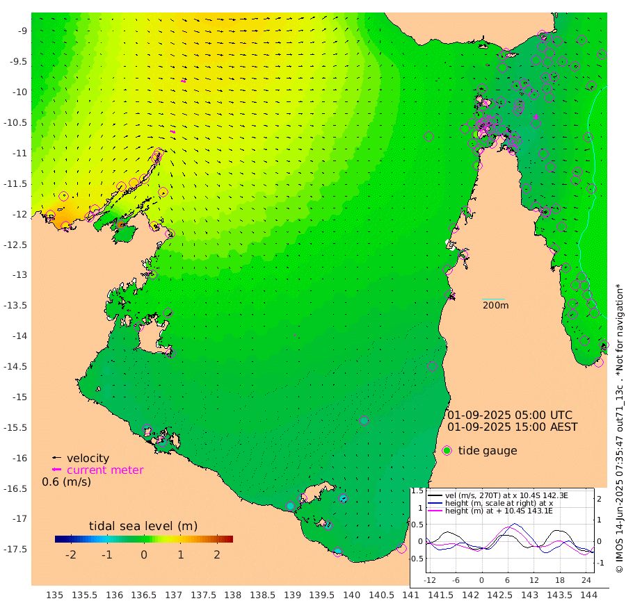 36cm/s 111T +3cm/s rms + 7cm/s -42T. ARA-GOC87 57m 7cm/s 112T +3cm/s rms + 2cm/s -2T. ARA-GOC87 60m 32cm/s 104T +2cm/s rms + 3cm/s 61T. ARA-GOC87 47m -23cm Daru -25cm Bobo Island -2cm Meer Island Barge -14cm Bramble Cay -21cm Unnamed Cay -28cm Pearce Cay -22cm Stephens Island -24cm Merrie England Shoals -31cm Mutacomal Reef -12cm Darnley Island Barge -13cm East Cay -17cm Yorke Island Barge -31cm Rennel Island -28cm Aureed Island -28cm Dungeness Reef -12cm Zagai Island -22cm Yam Island 6cm Dauan Island 5cm Saibai Island -5cm Phipi Reef -17cm Warrior Reef - West -2cm Mabuiag Island Barge -29cm Half Way Island -27cm Coconut Island -34cm Dugong Islet -28cm Poll Island -32cm Kirkcaldie Reef -37cm Suarji Island -20cm Sue Islet 6cm Hawkesbury Island -26cm Alert Patches -28cm Twin Island 12cm Badu Island -22cm St Pauls (Moa Island) 2cm Kubin (Moa Island) -17cm Ince Point -13cm Thursday Island -13cm Nardana Patches -8cm Turtle Head 8cm Round Island 4cm Goods Island 11cm Booby Island -6cm White Rocks Area 15cm Carpentaria -20cm Papou Point 25cm Bampfield Head 12cm Crab Island 0cm Red Wallis Island -4cm Packe Island -42cm Harrington Reef 8cm Herald Camp -10cm Sharp Point -17cm Red Island Point -12cm Possession Island -25cm Alpha Rock -31cm Frederick Point -22cm Wyborn Reef Light -22cm Tetley Island -6cm Triangle Reef -17cm Turtle Head Island -12cm Maclennan Cay 1cm Raine Island -21cm Mcsweeny Reef -17cm Collette Reef -2cm Shadwell Reef -17cm Hannibal Island -17cm Round Point 15cm Vrilya Point -17cm Cape Grenville -11cm Hicks Island -10cm Sir Charles Hardy Island -5cm Harvey Island -12cm Kay Reef -5cm Rocky Island -4cm Chapman Island -3cm Ham Reef -1cm Jubilee Reef -5cm Night Island -7cm Unnamed Reef No. 3 -6cm Morris Island 3cm 1st 3 Mile Opening -4cm Creech Reef -10cm Fife Island -1cm Eden Reef -6cm Stanley Island -14cm Normanby River 70cm Yabooma Island 87cm Hutchison River 73cm Elcho Island 61cm North West Crocodile Island 67cm Cape Wessel 82cm Stevens Island 90cm Guluwuru Island 73cm Hopeful Bay 72cm Auster Point 80cm Two Island Bay 102cm Cadell Strait 173cm Mallison Island 76cm Melville Bay (Gove Harbour) 85cm Truant Island 56cm Cape Arnhem 23cm Cape Grey 10cm Hawk Island -17cm Milner Bay (Groote Eylandt) -35cm Cape Beatrice -70cm West Island -67cm Centre Island -77cm Mornington Island -86cm West Wellesley Islands -92cm Bountiful Island -95cm Albert River Mouth -90cm Sweers Island -98cm Karumba -65cm Nassau River Offshore -41cm Christmas Creek -12cm Archer River 0cm Boyd Point -2cm Weipa (Humbug Point) 12cm Pennefather River 11cm Cullen Point