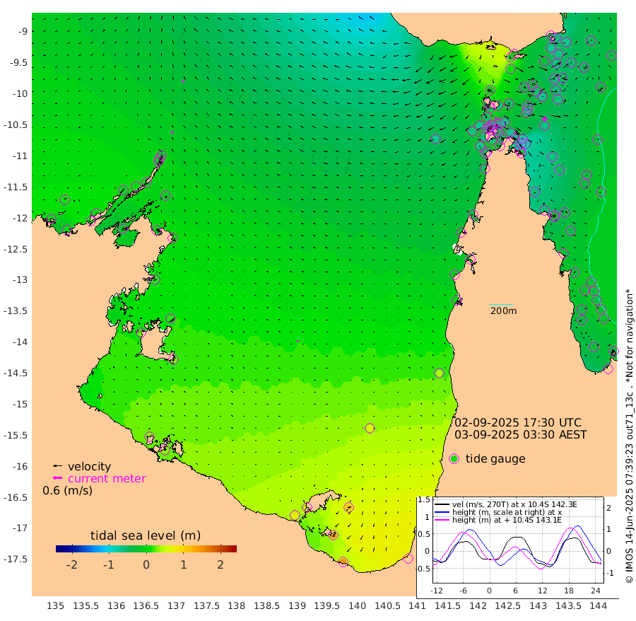 15cm/s -49T +3cm/s rms + 7cm/s -42T. ARA-GOC87 57m 13cm/s -92T +3cm/s rms + 2cm/s -2T. ARA-GOC87 60m 15cm/s -34T +2cm/s rms + 3cm/s 61T. ARA-GOC87 47m -59cm Daru -63cm Bobo Island -30cm Meer Island Barge -49cm Bramble Cay -62cm Unnamed Cay -66cm Pearce Cay -58cm Stephens Island -69cm Merrie England Shoals -74cm Mutacomal Reef -46cm Darnley Island Barge -38cm East Cay -51cm Yorke Island Barge -64cm Rennel Island -61cm Aureed Island -55cm Dungeness Reef -37cm Zagai Island -42cm Yam Island 5cm Dauan Island 2cm Saibai Island 9cm Phipi Reef -27cm Warrior Reef - West -29cm Mabuiag Island Barge -66cm Half Way Island -70cm Coconut Island -67cm Dugong Islet -63cm Poll Island -59cm Kirkcaldie Reef -60cm Suarji Island -50cm Sue Islet -54cm Hawkesbury Island -65cm Alert Patches -70cm Twin Island -43cm Badu Island -60cm St Pauls (Moa Island) -55cm Kubin (Moa Island) -59cm Ince Point -61cm Thursday Island -59cm Nardana Patches -53cm Turtle Head -51cm Round Island -54cm Goods Island -60cm Booby Island -72cm White Rocks Area -72cm Carpentaria -54cm Papou Point -73cm Bampfield Head -45cm Crab Island -69cm Red Wallis Island -68cm Packe Island -84cm Harrington Reef -46cm Herald Camp -11cm Sharp Point -42cm Red Island Point -56cm Possession Island -69cm Alpha Rock -74cm Frederick Point -79cm Wyborn Reef Light -79cm Tetley Island -37cm Triangle Reef -82cm Turtle Head Island -36cm Maclennan Cay -22cm Raine Island -61cm Mcsweeny Reef -52cm Collette Reef -31cm Shadwell Reef -57cm Hannibal Island -59cm Round Point -51cm Vrilya Point -50cm Cape Grenville -38cm Hicks Island -35cm Sir Charles Hardy Island -13cm Harvey Island -43cm Kay Reef -27cm Rocky Island -30cm Chapman Island -25cm Ham Reef -26cm Jubilee Reef -30cm Night Island -31cm Unnamed Reef No. 3 -31cm Morris Island -23cm 1st 3 Mile Opening -28cm Creech Reef -36cm Fife Island -28cm Eden Reef -32cm Stanley Island -38cm Normanby River -3cm Yabooma Island 5cm Hutchison River 5cm Elcho Island 9cm North West Crocodile Island -25cm Cape Wessel -15cm Stevens Island 4cm Guluwuru Island -6cm Hopeful Bay -17cm Auster Point -10cm Two Island Bay 9cm Cadell Strait -15cm Mallison Island 0cm Melville Bay (Gove Harbour) -10cm Truant Island 0cm Cape Arnhem 18cm Cape Grey 20cm Hawk Island 24cm Milner Bay (Groote Eylandt) 32cm Cape Beatrice 34cm West Island 34cm Centre Island 83cm Mornington Island 76cm West Wellesley Islands 117cm Bountiful Island 149cm Albert River Mouth 145cm Sweers Island 147cm Karumba 64cm Nassau River Offshore 38cm Christmas Creek 6cm Archer River -12cm Boyd Point -4cm Weipa (Humbug Point) -28cm Pennefather River -38cm Cullen Point