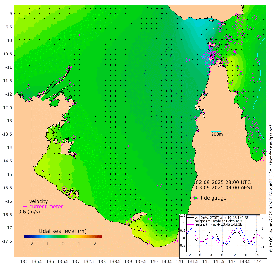 13cm/s 25T +3cm/s rms + 7cm/s -42T. ARA-GOC87 57m 28cm/s 2T +3cm/s rms + 2cm/s -2T. ARA-GOC87 60m 15cm/s 49T +2cm/s rms + 3cm/s 61T. ARA-GOC87 47m 12cm Daru 21cm Bobo Island -8cm Meer Island Barge 12cm Bramble Cay 17cm Unnamed Cay 16cm Pearce Cay 13cm Stephens Island 28cm Merrie England Shoals 27cm Mutacomal Reef 4cm Darnley Island Barge 2cm East Cay 6cm Yorke Island Barge 15cm Rennel Island 13cm Aureed Island -1cm Dungeness Reef -16cm Zagai Island -15cm Yam Island -78cm Dauan Island -59cm Saibai Island -67cm Phipi Reef -29cm Warrior Reef - West -50cm Mabuiag Island Barge 16cm Half Way Island 15cm Coconut Island 11cm Dugong Islet 1cm Poll Island 2cm Kirkcaldie Reef -13cm Suarji Island -4cm Sue Islet -93cm Hawkesbury Island -22cm Alert Patches -13cm Twin Island -87cm Badu Island -25cm St Pauls (Moa Island) -75cm Kubin (Moa Island) -38cm Ince Point -48cm Thursday Island -47cm Nardana Patches -70cm Turtle Head -79cm Round Island -92cm Goods Island -100cm Booby Island -77cm White Rocks Area -73cm Carpentaria -17cm Papou Point -104cm Bampfield Head -80cm Crab Island -84cm Red Wallis Island -75cm Packe Island 25cm Harrington Reef -107cm Herald Camp -1cm Sharp Point -48cm Red Island Point -40cm Possession Island 0cm Alpha Rock 2cm Frederick Point 21cm Wyborn Reef Light 18cm Tetley Island -8cm Triangle Reef 11cm Turtle Head Island -7cm Maclennan Cay -14cm Raine Island 14cm Mcsweeny Reef 11cm Collette Reef -7cm Shadwell Reef 16cm Hannibal Island 15cm Round Point -71cm Vrilya Point 10cm Cape Grenville -1cm Hicks Island -12cm Sir Charles Hardy Island 1cm Harvey Island 7cm Kay Reef -9cm Rocky Island -8cm Chapman Island -11cm Ham Reef -11cm Jubilee Reef -7cm Night Island -6cm Unnamed Reef No. 3 -7cm Morris Island -21cm 1st 3 Mile Opening -12cm Creech Reef -1cm Fife Island -12cm Eden Reef -5cm Stanley Island 5cm Normanby River -2cm Yabooma Island -11cm Hutchison River -1cm Elcho Island 4cm North West Crocodile Island 16cm Cape Wessel 18cm Stevens Island -8cm Guluwuru Island 10cm Hopeful Bay 8cm Auster Point -1cm Two Island Bay -8cm Cadell Strait 14cm Mallison Island -3cm Melville Bay (Gove Harbour) -3cm Truant Island -2cm Cape Arnhem 13cm Cape Grey 17cm Hawk Island 48cm Milner Bay (Groote Eylandt) 45cm Cape Beatrice 64cm West Island 65cm Centre Island 37cm Mornington Island 44cm West Wellesley Islands 32cm Bountiful Island 54cm Albert River Mouth 68cm Sweers Island 44cm Karumba 0cm Nassau River Offshore -33cm Christmas Creek -52cm Archer River -65cm Boyd Point -75cm Weipa (Humbug Point) -52cm Pennefather River -76cm Cullen Point