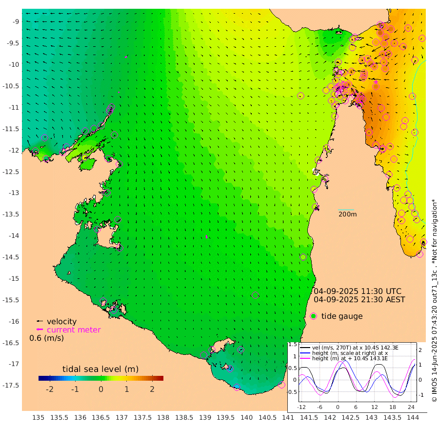 11cm/s -128T +3cm/s rms + 7cm/s -42T. ARA-GOC87 57m 33cm/s 169T +3cm/s rms + 2cm/s -2T. ARA-GOC87 60m 20cm/s -110T +2cm/s rms + 3cm/s 61T. ARA-GOC87 47m 157cm Daru 147cm Bobo Island 88cm Meer Island Barge 126cm Bramble Cay 156cm Unnamed Cay 150cm Pearce Cay 140cm Stephens Island 162cm Merrie England Shoals 175cm Mutacomal Reef 124cm Darnley Island Barge 102cm East Cay 136cm Yorke Island Barge 155cm Rennel Island 141cm Aureed Island 148cm Dungeness Reef 118cm Zagai Island 130cm Yam Island 91cm Dauan Island 83cm Saibai Island 96cm Phipi Reef 128cm Warrior Reef - West 93cm Mabuiag Island Barge 149cm Half Way Island 155cm Coconut Island 158cm Dugong Islet 148cm Poll Island 148cm Kirkcaldie Reef 141cm Suarji Island 136cm Sue Islet 112cm Hawkesbury Island 148cm Alert Patches 147cm Twin Island 97cm Badu Island 138cm St Pauls (Moa Island) 114cm Kubin (Moa Island) 129cm Ince Point 122cm Thursday Island 123cm Nardana Patches 117cm Turtle Head 105cm Round Island 103cm Goods Island 88cm Booby Island 100cm White Rocks Area 65cm Carpentaria 116cm Papou Point 102cm Bampfield Head 63cm Crab Island 98cm Red Wallis Island 124cm Packe Island 172cm Harrington Reef 101cm Herald Camp 34cm Sharp Point 93cm Red Island Point 116cm Possession Island 146cm Alpha Rock 158cm Frederick Point 173cm Wyborn Reef Light 171cm Tetley Island 96cm Triangle Reef 167cm Turtle Head Island 94cm Maclennan Cay 68cm Raine Island 145cm Mcsweeny Reef 134cm Collette Reef 95cm Shadwell Reef 144cm Hannibal Island 136cm Round Point 57cm Vrilya Point 122cm Cape Grenville 104cm Hicks Island 109cm Sir Charles Hardy Island 35cm Harvey Island 108cm Kay Reef 83cm Rocky Island 81cm Chapman Island 74cm Ham Reef 78cm Jubilee Reef 80cm Night Island 81cm Unnamed Reef No. 3 87cm Morris Island 73cm 1st 3 Mile Opening 81cm Creech Reef 90cm Fife Island 86cm Eden Reef 90cm Stanley Island 96cm Normanby River -51cm Yabooma Island -54cm Hutchison River -60cm Elcho Island -61cm North West Crocodile Island -23cm Cape Wessel -36cm Stevens Island -14cm Guluwuru Island -38cm Hopeful Bay -32cm Auster Point -39cm Two Island Bay -49cm Cadell Strait 69cm Mallison Island -14cm Melville Bay (Gove Harbour) -11cm Truant Island -11cm Cape Arnhem -27cm Cape Grey -22cm Hawk Island -54cm Milner Bay (Groote Eylandt) -43cm Cape Beatrice -50cm West Island -57cm Centre Island -42cm Mornington Island -35cm West Wellesley Islands -62cm Bountiful Island -110cm Albert River Mouth -124cm Sweers Island -97cm Karumba 2cm Nassau River Offshore 36cm Christmas Creek 45cm Archer River 54cm Boyd Point 52cm Weipa (Humbug Point) 46cm Pennefather River 57cm Cullen Point