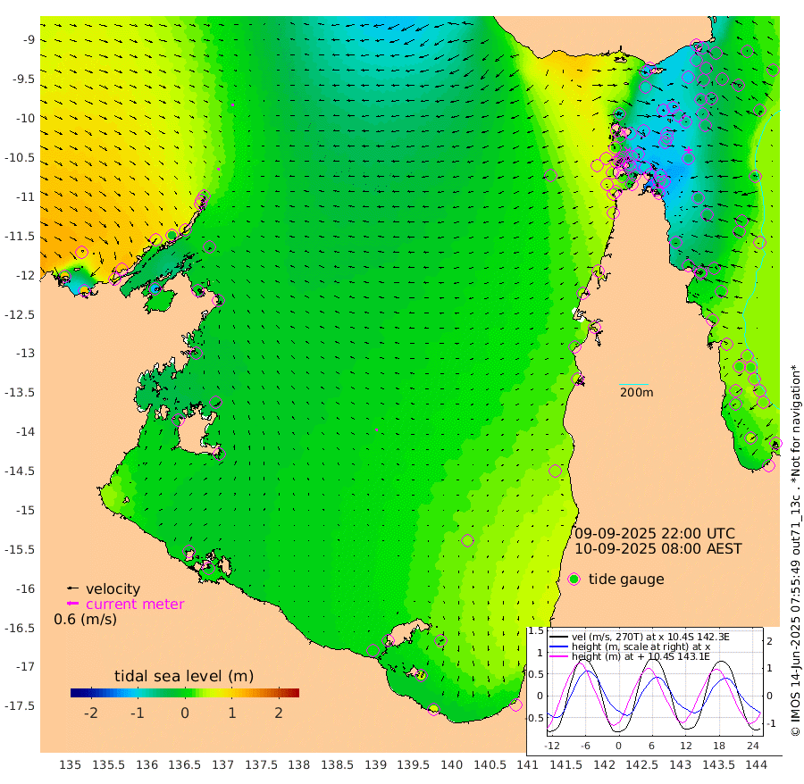 10cm/s -162T +3cm/s rms + 7cm/s -42T. ARA-GOC87 57m 13cm/s -56T +3cm/s rms + 2cm/s -2T. ARA-GOC87 60m 10cm/s 168T +2cm/s rms + 3cm/s 61T. ARA-GOC87 47m -74cm Daru -65cm Bobo Island 7cm Meer Island Barge -8cm Bramble Cay -46cm Unnamed Cay -38cm Pearce Cay -29cm Stephens Island -34cm Merrie England Shoals -69cm Mutacomal Reef -32cm Darnley Island Barge 12cm East Cay -58cm Yorke Island Barge -49cm Rennel Island -59cm Aureed Island -68cm Dungeness Reef -112cm Zagai Island -103cm Yam Island -104cm Dauan Island -121cm Saibai Island -87cm Phipi Reef -112cm Warrior Reef - West -83cm Mabuiag Island Barge -49cm Half Way Island -75cm Coconut Island -66cm Dugong Islet -86cm Poll Island -79cm Kirkcaldie Reef -100cm Suarji Island -102cm Sue Islet 19cm Hawkesbury Island -81cm Alert Patches -85cm Twin Island -2cm Badu Island -101cm St Pauls (Moa Island) -13cm Kubin (Moa Island) -64cm Ince Point -45cm Thursday Island -52cm Nardana Patches -11cm Turtle Head 0cm Round Island 34cm Goods Island 53cm Booby Island 51cm White Rocks Area 18cm Carpentaria -81cm Papou Point 36cm Bampfield Head 55cm Crab Island 47cm Red Wallis Island 16cm Packe Island -74cm Harrington Reef 26cm Herald Camp -42cm Sharp Point -7cm Red Island Point -48cm Possession Island -93cm Alpha Rock -84cm Frederick Point -80cm Wyborn Reef Light -87cm Tetley Island -8cm Triangle Reef -64cm Turtle Head Island 5cm Maclennan Cay 33cm Raine Island -41cm Mcsweeny Reef -30cm Collette Reef 1cm Shadwell Reef -29cm Hannibal Island -2cm Round Point 51cm Vrilya Point -1cm Cape Grenville 6cm Hicks Island -3cm Sir Charles Hardy Island -1cm Harvey Island 14cm Kay Reef 22cm Rocky Island 32cm Chapman Island 25cm Ham Reef 21cm Jubilee Reef 21cm Night Island 29cm Unnamed Reef No. 3 27cm Morris Island 28cm 1st 3 Mile Opening 26cm Creech Reef 27cm Fife Island 42cm Eden Reef 30cm Stanley Island 33cm Normanby River 112cm Yabooma Island 111cm Hutchison River 106cm Elcho Island 104cm North West Crocodile Island 19cm Cape Wessel 71cm Stevens Island -22cm Guluwuru Island 77cm Hopeful Bay 45cm Auster Point 44cm Two Island Bay 62cm Cadell Strait -118cm Mallison Island -6cm Melville Bay (Gove Harbour) -10cm Truant Island -16cm Cape Arnhem -19cm Cape Grey -10cm Hawk Island -8cm Milner Bay (Groote Eylandt) -2cm Cape Beatrice -16cm West Island -9cm Centre Island 16cm Mornington Island 14cm West Wellesley Islands 21cm Bountiful Island 57cm Albert River Mouth 47cm Sweers Island 60cm Karumba 36cm Nassau River Offshore 35cm Christmas Creek 49cm Archer River 29cm Boyd Point 52cm Weipa (Humbug Point) 45cm Pennefather River 42cm Cullen Point