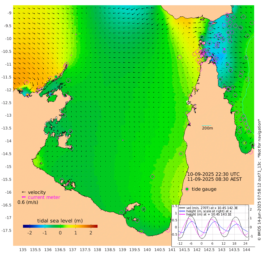 12cm/s 176T +3cm/s rms + 7cm/s -42T. ARA-GOC87 57m 12cm/s -40T +3cm/s rms + 2cm/s -2T. ARA-GOC87 60m 15cm/s 157T +2cm/s rms + 3cm/s 61T. ARA-GOC87 47m -72cm Daru -63cm Bobo Island -5cm Meer Island Barge -16cm Bramble Cay -49cm Unnamed Cay -39cm Pearce Cay -35cm Stephens Island -38cm Merrie England Shoals -65cm Mutacomal Reef -40cm Darnley Island Barge 1cm East Cay -61cm Yorke Island Barge -49cm Rennel Island -59cm Aureed Island -64cm Dungeness Reef -100cm Zagai Island -89cm Yam Island -90cm Dauan Island -105cm Saibai Island -79cm Phipi Reef -101cm Warrior Reef - West -61cm Mabuiag Island Barge -48cm Half Way Island -67cm Coconut Island -63cm Dugong Islet -75cm Poll Island -70cm Kirkcaldie Reef -85cm Suarji Island -92cm Sue Islet 44cm Hawkesbury Island -63cm Alert Patches -67cm Twin Island 25cm Badu Island -81cm St Pauls (Moa Island) 8cm Kubin (Moa Island) -44cm Ince Point -24cm Thursday Island -31cm Nardana Patches 8cm Turtle Head 19cm Round Island 55cm Goods Island 76cm Booby Island 76cm White Rocks Area 40cm Carpentaria -62cm Papou Point 57cm Bampfield Head 75cm Crab Island 72cm Red Wallis Island 37cm Packe Island -67cm Harrington Reef 42cm Herald Camp -36cm Sharp Point 14cm Red Island Point -33cm Possession Island -77cm Alpha Rock -70cm Frederick Point -72cm Wyborn Reef Light -77cm Tetley Island -13cm Triangle Reef -58cm Turtle Head Island -5cm Maclennan Cay 22cm Raine Island -44cm Mcsweeny Reef -36cm Collette Reef -9cm Shadwell Reef -35cm Hannibal Island -9cm Round Point 71cm Vrilya Point -11cm Cape Grenville -4cm Hicks Island -14cm Sir Charles Hardy Island -4cm Harvey Island 3cm Kay Reef 10cm Rocky Island 21cm Chapman Island 14cm Ham Reef 10cm Jubilee Reef 10cm Night Island 19cm Unnamed Reef No. 3 14cm Morris Island 15cm 1st 3 Mile Opening 14cm Creech Reef 15cm Fife Island 25cm Eden Reef 16cm Stanley Island 19cm Normanby River 127cm Yabooma Island 127cm Hutchison River 120cm Elcho Island 119cm North West Crocodile Island 32cm Cape Wessel 87cm Stevens Island -18cm Guluwuru Island 87cm Hopeful Bay 57cm Auster Point 54cm Two Island Bay 74cm Cadell Strait -126cm Mallison Island -2cm Melville Bay (Gove Harbour) -4cm Truant Island -15cm Cape Arnhem -21cm Cape Grey -16cm Hawk Island -15cm Milner Bay (Groote Eylandt) -11cm Cape Beatrice -28cm West Island -22cm Centre Island -12cm Mornington Island -13cm West Wellesley Islands -13cm Bountiful Island 20cm Albert River Mouth 8cm Sweers Island 23cm Karumba 14cm Nassau River Offshore 20cm Christmas Creek 45cm Archer River 31cm Boyd Point 52cm Weipa (Humbug Point) 53cm Pennefather River 55cm Cullen Point