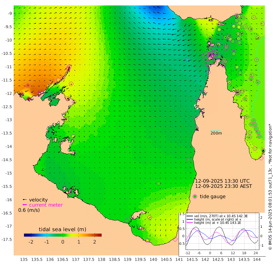 1cm/s -8T +3cm/s rms + 7cm/s -42T. ARA-GOC87 57m 13cm/s -99T +3cm/s rms + 2cm/s -2T. ARA-GOC87 60m 7cm/s 46T +2cm/s rms + 3cm/s 61T. ARA-GOC87 47m 26cm Daru 32cm Bobo Island 24cm Meer Island Barge 30cm Bramble Cay 25cm Unnamed Cay 39cm Pearce Cay 29cm Stephens Island 18cm Merrie England Shoals 20cm Mutacomal Reef 23cm Darnley Island Barge 31cm East Cay 22cm Yorke Island Barge 29cm Rennel Island 29cm Aureed Island 28cm Dungeness Reef 20cm Zagai Island 19cm Yam Island 33cm Dauan Island 17cm Saibai Island 37cm Phipi Reef 32cm Warrior Reef - West 6cm Mabuiag Island Barge 18cm Half Way Island 20cm Coconut Island 21cm Dugong Islet 20cm Poll Island 10cm Kirkcaldie Reef 24cm Suarji Island 8cm Sue Islet 5cm Hawkesbury Island 4cm Alert Patches 7cm Twin Island 8cm Badu Island 8cm St Pauls (Moa Island) 11cm Kubin (Moa Island) 3cm Ince Point -4cm Thursday Island 0cm Nardana Patches 6cm Turtle Head 7cm Round Island 2cm Goods Island -20cm Booby Island -7cm White Rocks Area -68cm Carpentaria 8cm Papou Point -13cm Bampfield Head -32cm Crab Island -21cm Red Wallis Island -1cm Packe Island 19cm Harrington Reef -2cm Herald Camp -7cm Sharp Point -1cm Red Island Point 6cm Possession Island 2cm Alpha Rock 14cm Frederick Point 22cm Wyborn Reef Light 20cm Tetley Island 24cm Triangle Reef 21cm Turtle Head Island 25cm Maclennan Cay 22cm Raine Island 24cm Mcsweeny Reef 20cm Collette Reef 18cm Shadwell Reef 23cm Hannibal Island 32cm Round Point -61cm Vrilya Point 20cm Cape Grenville 30cm Hicks Island 31cm Sir Charles Hardy Island 7cm Harvey Island 20cm Kay Reef 28cm Rocky Island 26cm Chapman Island 21cm Ham Reef 22cm Jubilee Reef 19cm Night Island 20cm Unnamed Reef No. 3 27cm Morris Island 21cm 1st 3 Mile Opening 21cm Creech Reef 30cm Fife Island 31cm Eden Reef 19cm Stanley Island 31cm Normanby River 184cm Yabooma Island 221cm Hutchison River 183cm Elcho Island 180cm North West Crocodile Island 105cm Cape Wessel 151cm Stevens Island 95cm Guluwuru Island 142cm Hopeful Bay 121cm Auster Point 123cm Two Island Bay 172cm Cadell Strait -13cm Mallison Island 98cm Melville Bay (Gove Harbour) 97cm Truant Island 60cm Cape Arnhem 46cm Cape Grey 41cm Hawk Island 10cm Milner Bay (Groote Eylandt) 12cm Cape Beatrice -24cm West Island -33cm Centre Island 17cm Mornington Island 14cm West Wellesley Islands 65cm Bountiful Island 79cm Albert River Mouth 77cm Sweers Island 74cm Karumba 17cm Nassau River Offshore 3cm Christmas Creek -13cm Archer River -19cm Boyd Point -5cm Weipa (Humbug Point) -52cm Pennefather River -40cm Cullen Point