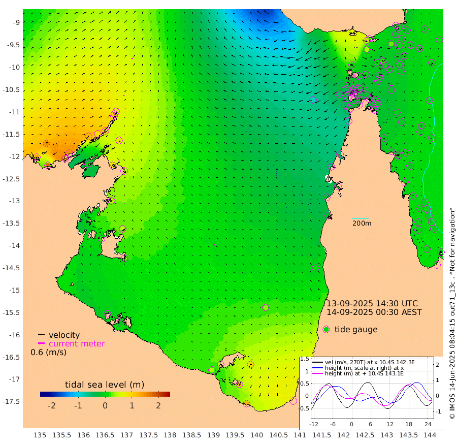 6cm/s -29T +3cm/s rms + 7cm/s -42T. ARA-GOC87 57m 15cm/s -94T +3cm/s rms + 2cm/s -2T. ARA-GOC87 60m 10cm/s 16T +2cm/s rms + 3cm/s 61T. ARA-GOC87 47m 1cm Daru 5cm Bobo Island -1cm Meer Island Barge -1cm Bramble Cay -8cm Unnamed Cay 6cm Pearce Cay -4cm Stephens Island -18cm Merrie England Shoals -11cm Mutacomal Reef -5cm Darnley Island Barge 1cm East Cay -3cm Yorke Island Barge -2cm Rennel Island 4cm Aureed Island 5cm Dungeness Reef 16cm Zagai Island 9cm Yam Island 44cm Dauan Island 30cm Saibai Island 45cm Phipi Reef 29cm Warrior Reef - West 2cm Mabuiag Island Barge -13cm Half Way Island -4cm Coconut Island -10cm Dugong Islet 0cm Poll Island -13cm Kirkcaldie Reef 11cm Suarji Island -7cm Sue Islet -28cm Hawkesbury Island -15cm Alert Patches -13cm Twin Island -14cm Badu Island -6cm St Pauls (Moa Island) -13cm Kubin (Moa Island) -15cm Ince Point -23cm Thursday Island -18cm Nardana Patches -16cm Turtle Head -17cm Round Island -27cm Goods Island -51cm Booby Island -42cm White Rocks Area -90cm Carpentaria -8cm Papou Point -46cm Bampfield Head -54cm Crab Island -50cm Red Wallis Island -27cm Packe Island -14cm Harrington Reef -27cm Herald Camp -6cm Sharp Point -23cm Red Island Point -13cm Possession Island -16cm Alpha Rock -11cm Frederick Point -7cm Wyborn Reef Light -7cm Tetley Island 2cm Triangle Reef -17cm Turtle Head Island -1cm Maclennan Cay -1cm Raine Island -6cm Mcsweeny Reef -8cm Collette Reef -5cm Shadwell Reef -9cm Hannibal Island -3cm Round Point -82cm Vrilya Point -11cm Cape Grenville 0cm Hicks Island 3cm Sir Charles Hardy Island -2cm Harvey Island -12cm Kay Reef 2cm Rocky Island 1cm Chapman Island -2cm Ham Reef -3cm Jubilee Reef -4cm Night Island -5cm Unnamed Reef No. 3 -1cm Morris Island -3cm 1st 3 Mile Opening -5cm Creech Reef 3cm Fife Island 1cm Eden Reef -10cm Stanley Island -3cm Normanby River 141cm Yabooma Island 177cm Hutchison River 147cm Elcho Island 144cm North West Crocodile Island 82cm Cape Wessel 118cm Stevens Island 84cm Guluwuru Island 113cm Hopeful Bay 93cm Auster Point 96cm Two Island Bay 141cm Cadell Strait 5cm Mallison Island 86cm Melville Bay (Gove Harbour) 83cm Truant Island 56cm Cape Arnhem 46cm Cape Grey 47cm Hawk Island 22cm Milner Bay (Groote Eylandt) 24cm Cape Beatrice -5cm West Island -11cm Centre Island 47cm Mornington Island 41cm West Wellesley Islands 94cm Bountiful Island 122cm Albert River Mouth 120cm Sweers Island 115cm Karumba 35cm Nassau River Offshore 12cm Christmas Creek -17cm Archer River -27cm Boyd Point -14cm Weipa (Humbug Point) -63cm Pennefather River -54cm Cullen Point