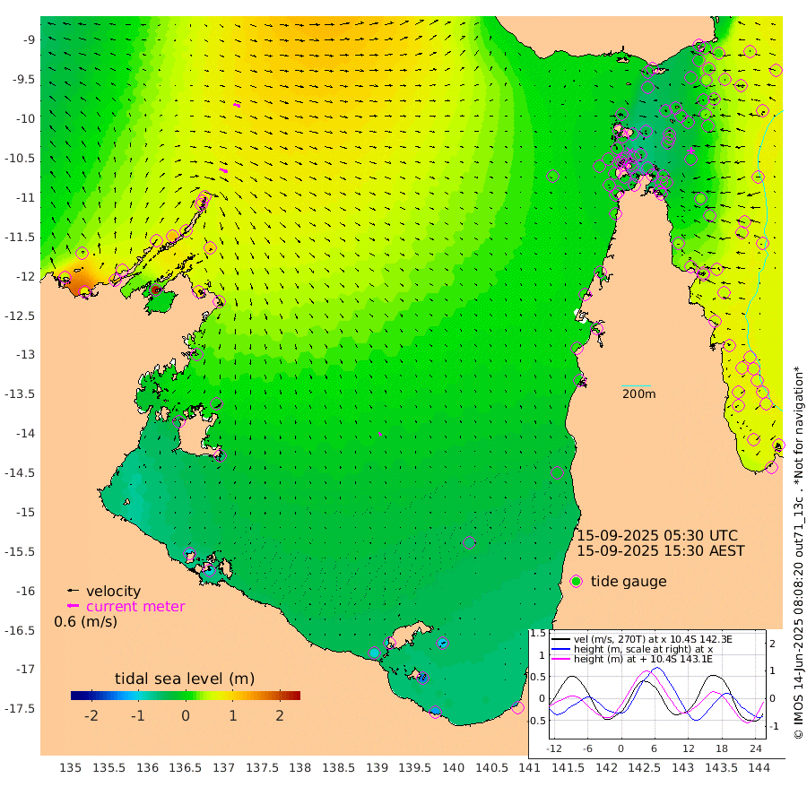 45cm/s 112T +3cm/s rms + 7cm/s -42T. ARA-GOC87 57m 20cm/s 154T +3cm/s rms + 2cm/s -2T. ARA-GOC87 60m 37cm/s 106T +2cm/s rms + 3cm/s 61T. ARA-GOC87 47m 8cm Daru 21cm Bobo Island 55cm Meer Island Barge 41cm Bramble Cay 20cm Unnamed Cay 30cm Pearce Cay 33cm Stephens Island 19cm Merrie England Shoals -2cm Mutacomal Reef 44cm Darnley Island Barge 50cm East Cay 29cm Yorke Island Barge 10cm Rennel Island 23cm Aureed Island 2cm Dungeness Reef -7cm Zagai Island -19cm Yam Island -10cm Dauan Island -6cm Saibai Island -22cm Phipi Reef -10cm Warrior Reef - West -24cm Mabuiag Island Barge 15cm Half Way Island 2cm Coconut Island 5cm Dugong Islet -12cm Poll Island -12cm Kirkcaldie Reef -35cm Suarji Island -7cm Sue Islet -2cm Hawkesbury Island -28cm Alert Patches -24cm Twin Island 0cm Badu Island -28cm St Pauls (Moa Island) -7cm Kubin (Moa Island) -23cm Ince Point -20cm Thursday Island -22cm Nardana Patches -11cm Turtle Head -16cm Round Island 5cm Goods Island 10cm Booby Island -5cm White Rocks Area 20cm Carpentaria -21cm Papou Point 6cm Bampfield Head 8cm Crab Island 3cm Red Wallis Island -4cm Packe Island -4cm Harrington Reef -7cm Herald Camp -17cm Sharp Point -12cm Red Island Point -24cm Possession Island -26cm Alpha Rock -14cm Frederick Point 0cm Wyborn Reef Light -5cm Tetley Island 41cm Triangle Reef 13cm Turtle Head Island 45cm Maclennan Cay 55cm Raine Island 24cm Mcsweeny Reef 29cm Collette Reef 45cm Shadwell Reef 34cm Hannibal Island 39cm Round Point 15cm Vrilya Point 36cm Cape Grenville 44cm Hicks Island 54cm Sir Charles Hardy Island 12cm Harvey Island 47cm Kay Reef 52cm Rocky Island 58cm Chapman Island 57cm Ham Reef 57cm Jubilee Reef 47cm Night Island 55cm Unnamed Reef No. 3 54cm Morris Island 57cm 1st 3 Mile Opening 57cm Creech Reef 53cm Fife Island 74cm Eden Reef 55cm Stanley Island 56cm Normanby River 49cm Yabooma Island 72cm Hutchison River 53cm Elcho Island 39cm North West Crocodile Island 78cm Cape Wessel 63cm Stevens Island 115cm Guluwuru Island 56cm Hopeful Bay 67cm Auster Point 75cm Two Island Bay 114cm Cadell Strait 224cm Mallison Island 87cm Melville Bay (Gove Harbour) 98cm Truant Island 66cm Cape Arnhem 22cm Cape Grey -3cm Hawk Island -44cm Milner Bay (Groote Eylandt) -55cm Cape Beatrice -98cm West Island -97cm Centre Island -91cm Mornington Island -94cm West Wellesley Islands -108cm Bountiful Island -134cm Albert River Mouth -143cm Sweers Island -137cm Karumba -55cm Nassau River Offshore -18cm Christmas Creek 9cm Archer River 18cm Boyd Point 16cm Weipa (Humbug Point) 16cm Pennefather River 12cm Cullen Point