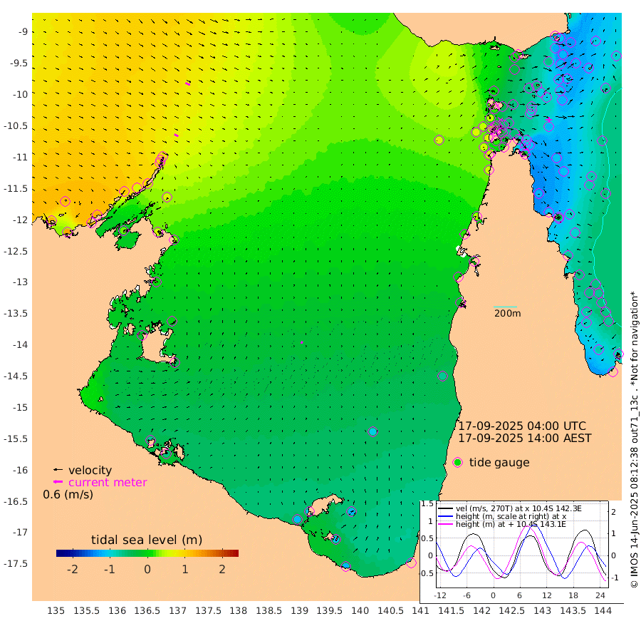 29cm/s 119T +3cm/s rms + 7cm/s -42T. ARA-GOC87 57m 16cm/s 25T +3cm/s rms + 2cm/s -2T. ARA-GOC87 60m 32cm/s 115T +2cm/s rms + 3cm/s 61T. ARA-GOC87 47m -115cm Daru -112cm Bobo Island -79cm Meer Island Barge -103cm Bramble Cay -120cm Unnamed Cay -116cm Pearce Cay -118cm Stephens Island -128cm Merrie England Shoals -123cm Mutacomal Reef -107cm Darnley Island Barge -90cm East Cay -108cm Yorke Island Barge -118cm Rennel Island -110cm Aureed Island -104cm Dungeness Reef -54cm Zagai Island -61cm Yam Island -1cm Dauan Island 6cm Saibai Island -30cm Phipi Reef -61cm Warrior Reef - West 14cm Mabuiag Island Barge -118cm Half Way Island -99cm Coconut Island -119cm Dugong Islet -84cm Poll Island -96cm Kirkcaldie Reef -66cm Suarji Island -75cm Sue Islet 50cm Hawkesbury Island -55cm Alert Patches -56cm Twin Island 52cm Badu Island -45cm St Pauls (Moa Island) 21cm Kubin (Moa Island) -24cm Ince Point -7cm Thursday Island -11cm Nardana Patches 5cm Turtle Head 33cm Round Island 41cm Goods Island 65cm Booby Island 50cm White Rocks Area 67cm Carpentaria -32cm Papou Point 72cm Bampfield Head 57cm Crab Island 53cm Red Wallis Island 19cm Packe Island -125cm Harrington Reef 46cm Herald Camp -17cm Sharp Point 9cm Red Island Point -19cm Possession Island -60cm Alpha Rock -82cm Frederick Point -106cm Wyborn Reef Light -97cm Tetley Island -66cm Triangle Reef -107cm Turtle Head Island -79cm Maclennan Cay -58cm Raine Island -112cm Mcsweeny Reef -106cm Collette Reef -78cm Shadwell Reef -118cm Hannibal Island -107cm Round Point 54cm Vrilya Point -103cm Cape Grenville -90cm Hicks Island -87cm Sir Charles Hardy Island -32cm Harvey Island -91cm Kay Reef -72cm Rocky Island -62cm Chapman Island -60cm Ham Reef -67cm Jubilee Reef -71cm Night Island -66cm Unnamed Reef No. 3 -77cm Morris Island -65cm 1st 3 Mile Opening -73cm Creech Reef -83cm Fife Island -82cm Eden Reef -83cm Stanley Island -93cm Normanby River 126cm Yabooma Island 134cm Hutchison River 125cm Elcho Island 118cm North West Crocodile Island 88cm Cape Wessel 112cm Stevens Island 60cm Guluwuru Island 102cm Hopeful Bay 95cm Auster Point 99cm Two Island Bay 112cm Cadell Strait 24cm Mallison Island 57cm Melville Bay (Gove Harbour) 67cm Truant Island 36cm Cape Arnhem 10cm Cape Grey -5cm Hawk Island -16cm Milner Bay (Groote Eylandt) -39cm Cape Beatrice -69cm West Island -64cm Centre Island -110cm Mornington Island -117cm West Wellesley Islands -114cm Bountiful Island -113cm Albert River Mouth -111cm Sweers Island -118cm Karumba -99cm Nassau River Offshore -73cm Christmas Creek -19cm Archer River 3cm Boyd Point 6cm Weipa (Humbug Point) 18cm Pennefather River 44cm Cullen Point