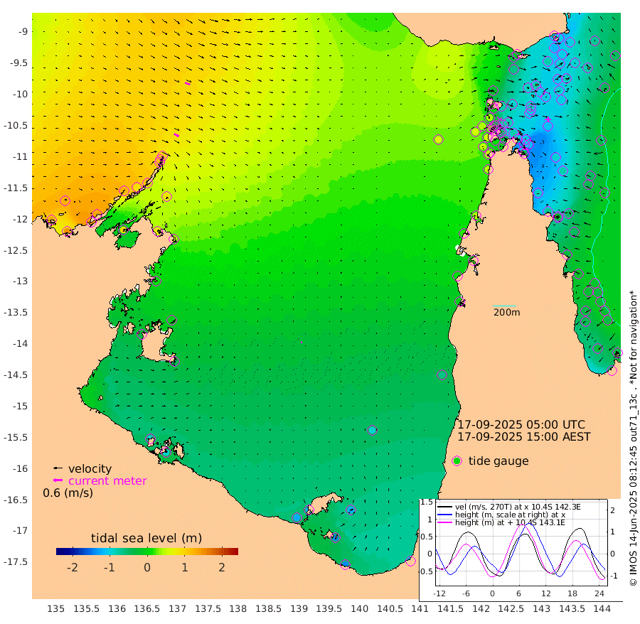 36cm/s 118T +3cm/s rms + 7cm/s -42T. ARA-GOC87 57m 8cm/s 62T +3cm/s rms + 2cm/s -2T. ARA-GOC87 60m 36cm/s 114T +2cm/s rms + 3cm/s 61T. ARA-GOC87 47m -110cm Daru -100cm Bobo Island -41cm Meer Island Barge -70cm Bramble Cay -100cm Unnamed Cay -95cm Pearce Cay -92cm Stephens Island -105cm Merrie England Shoals -116cm Mutacomal Reef -77cm Darnley Island Barge -51cm East Cay -89cm Yorke Island Barge -106cm Rennel Island -97cm Aureed Island -104cm Dungeness Reef -75cm Zagai Island -83cm Yam Island -30cm Dauan Island -21cm Saibai Island -60cm Phipi Reef -82cm Warrior Reef - West -18cm Mabuiag Island Barge -105cm Half Way Island -102cm Coconut Island -112cm Dugong Islet -97cm Poll Island -106cm Kirkcaldie Reef -95cm Suarji Island -87cm Sue Islet 39cm Hawkesbury Island -80cm Alert Patches -80cm Twin Island 33cm Badu Island -76cm St Pauls (Moa Island) 4cm Kubin (Moa Island) -49cm Ince Point -31cm Thursday Island -35cm Nardana Patches -11cm Turtle Head 14cm Round Island 34cm Goods Island 60cm Booby Island 41cm White Rocks Area 64cm Carpentaria -59cm Papou Point 63cm Bampfield Head 50cm Crab Island 46cm Red Wallis Island 8cm Packe Island -125cm Harrington Reef 35cm Herald Camp -31cm Sharp Point -7cm Red Island Point -43cm Possession Island -80cm Alpha Rock -96cm Frederick Point -105cm Wyborn Reef Light -102cm Tetley Island -39cm Triangle Reef -103cm Turtle Head Island -46cm Maclennan Cay -19cm Raine Island -92cm Mcsweeny Reef -82cm Collette Reef -44cm Shadwell Reef -89cm Hannibal Island -73cm Round Point 51cm Vrilya Point -68cm Cape Grenville -55cm Hicks Island -46cm Sir Charles Hardy Island -22cm Harvey Island -49cm Kay Reef -32cm Rocky Island -18cm Chapman Island -18cm Ham Reef -26cm Jubilee Reef -35cm Night Island -23cm Unnamed Reef No. 3 -35cm Morris Island -24cm 1st 3 Mile Opening -31cm Creech Reef -41cm Fife Island -26cm Eden Reef -37cm Stanley Island -44cm Normanby River 135cm Yabooma Island 147cm Hutchison River 133cm Elcho Island 122cm North West Crocodile Island 104cm Cape Wessel 122cm Stevens Island 88cm Guluwuru Island 115cm Hopeful Bay 107cm Auster Point 114cm Two Island Bay 137cm Cadell Strait 102cm Mallison Island 77cm Melville Bay (Gove Harbour) 87cm Truant Island 50cm Cape Arnhem 13cm Cape Grey -7cm Hawk Island -32cm Milner Bay (Groote Eylandt) -52cm Cape Beatrice -93cm West Island -90cm Centre Island -122cm Mornington Island -127cm West Wellesley Islands -126cm Bountiful Island -135cm Albert River Mouth -137cm Sweers Island -141cm Karumba -96cm Nassau River Offshore -61cm Christmas Creek -5cm Archer River 14cm Boyd Point 19cm Weipa (Humbug Point) 21cm Pennefather River 45cm Cullen Point